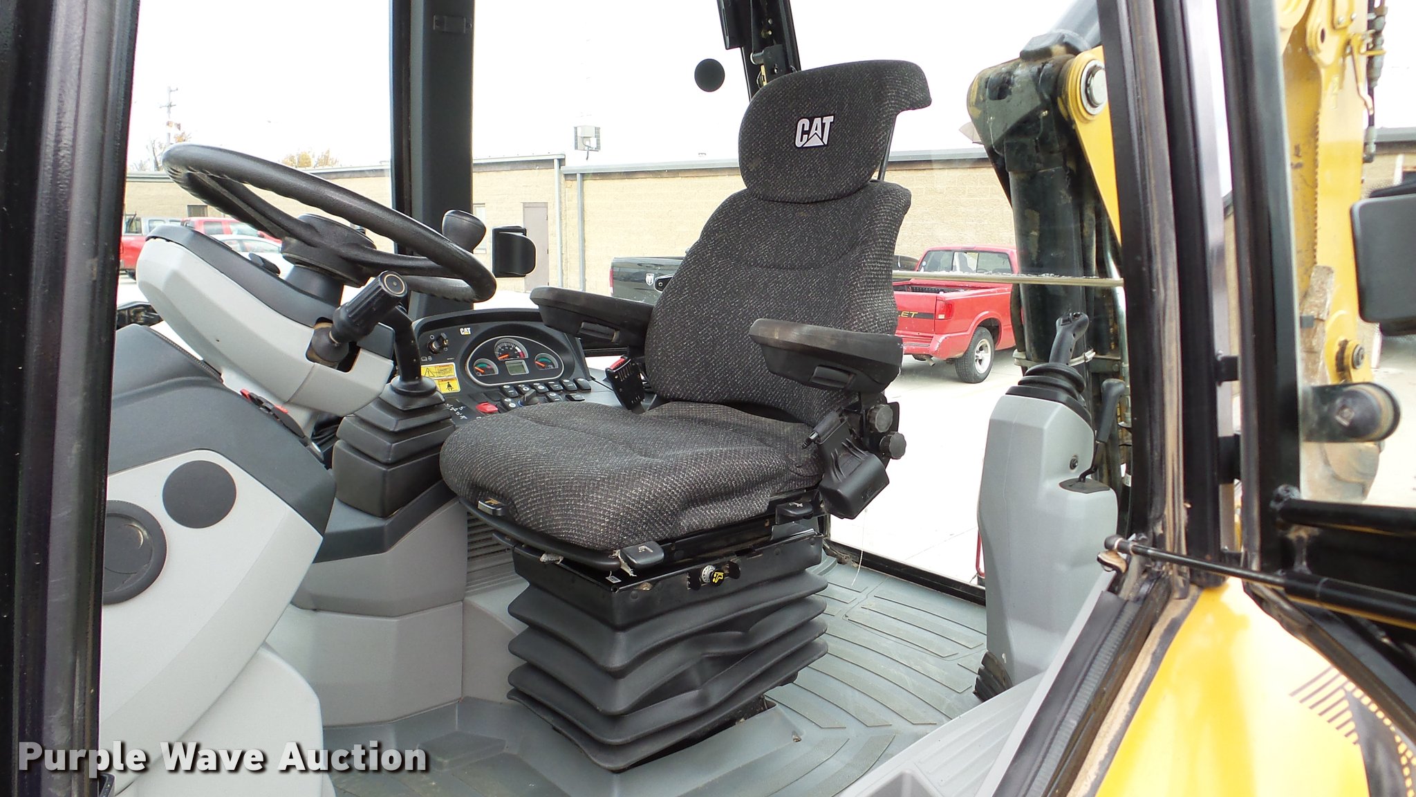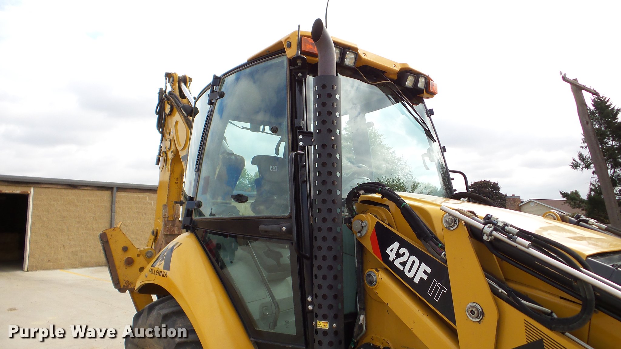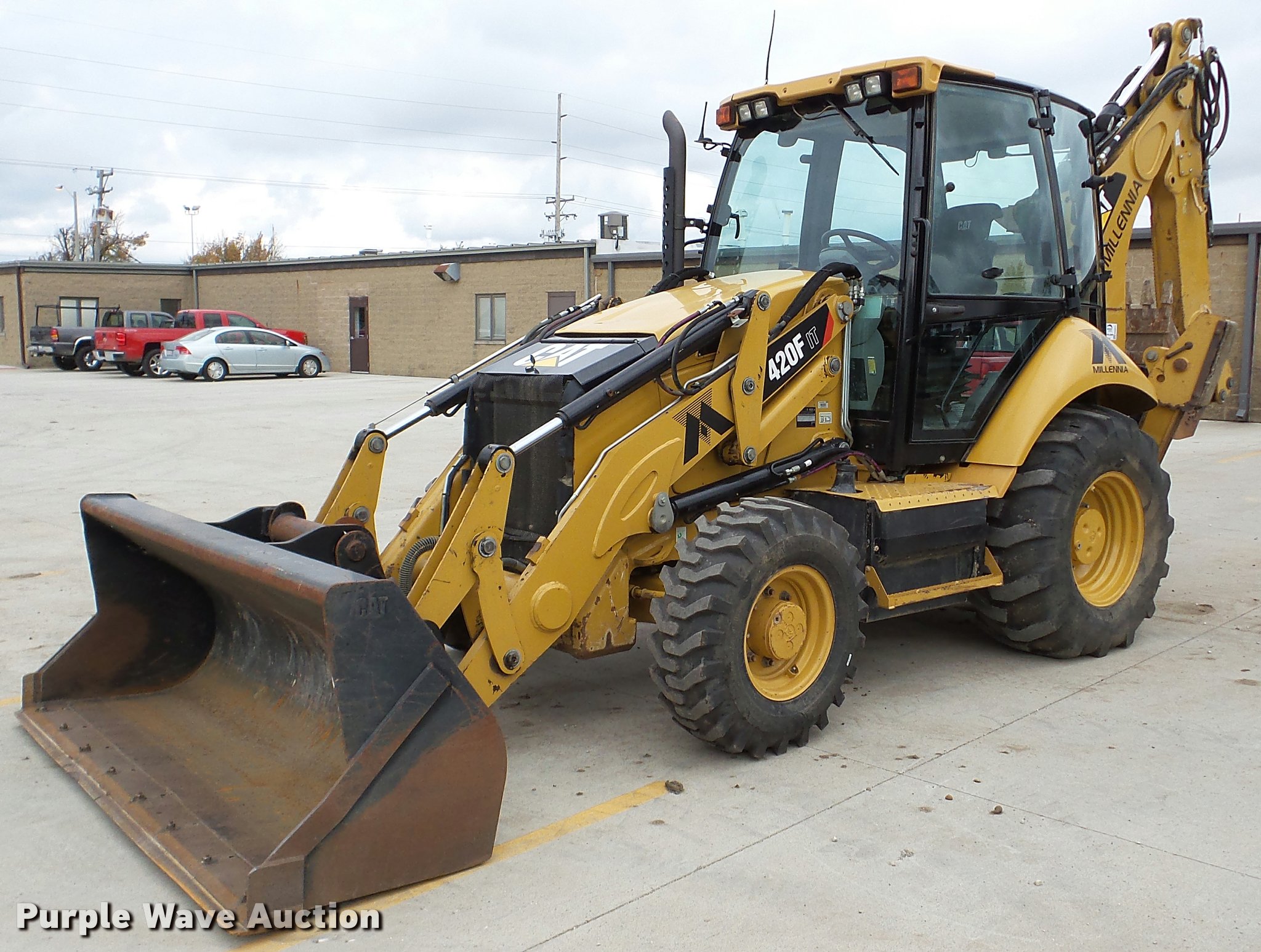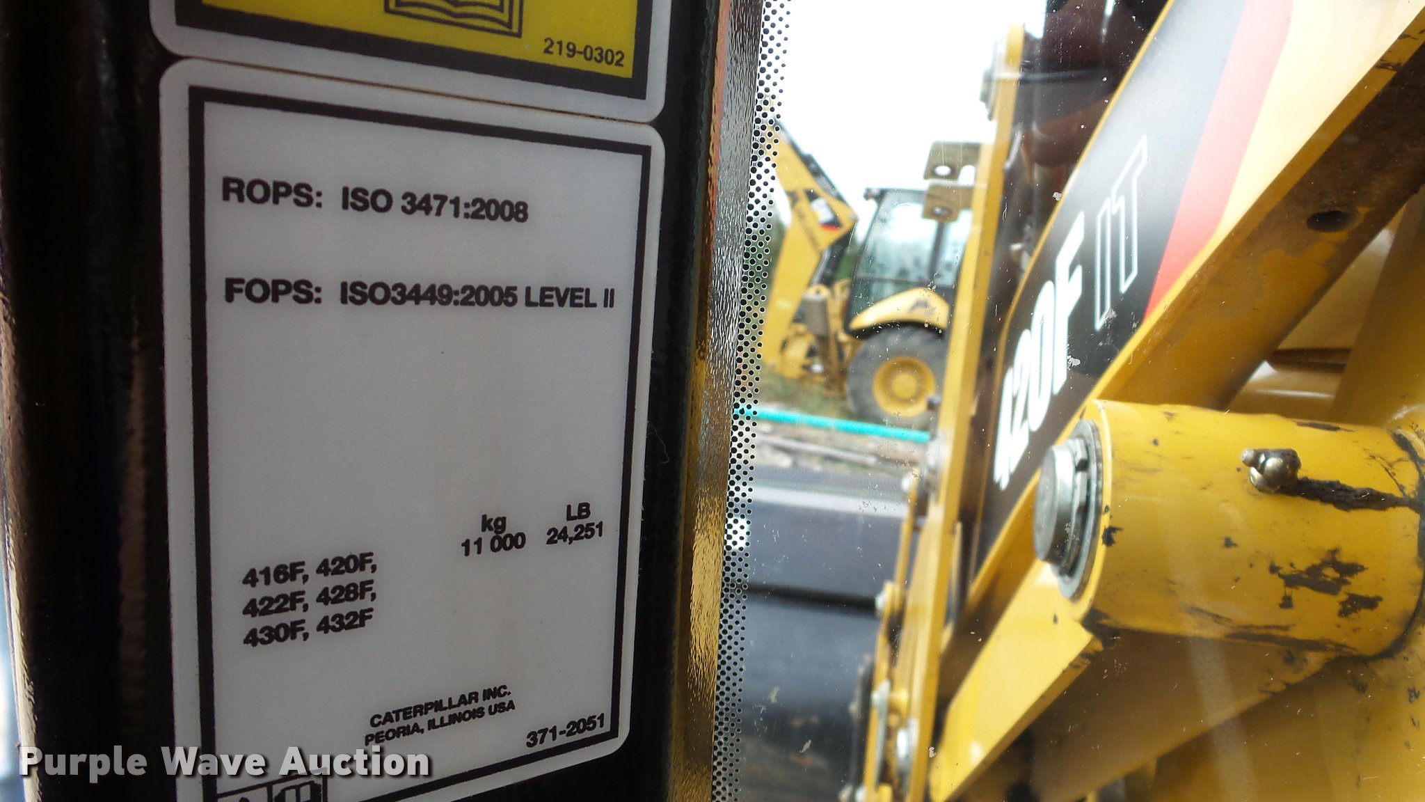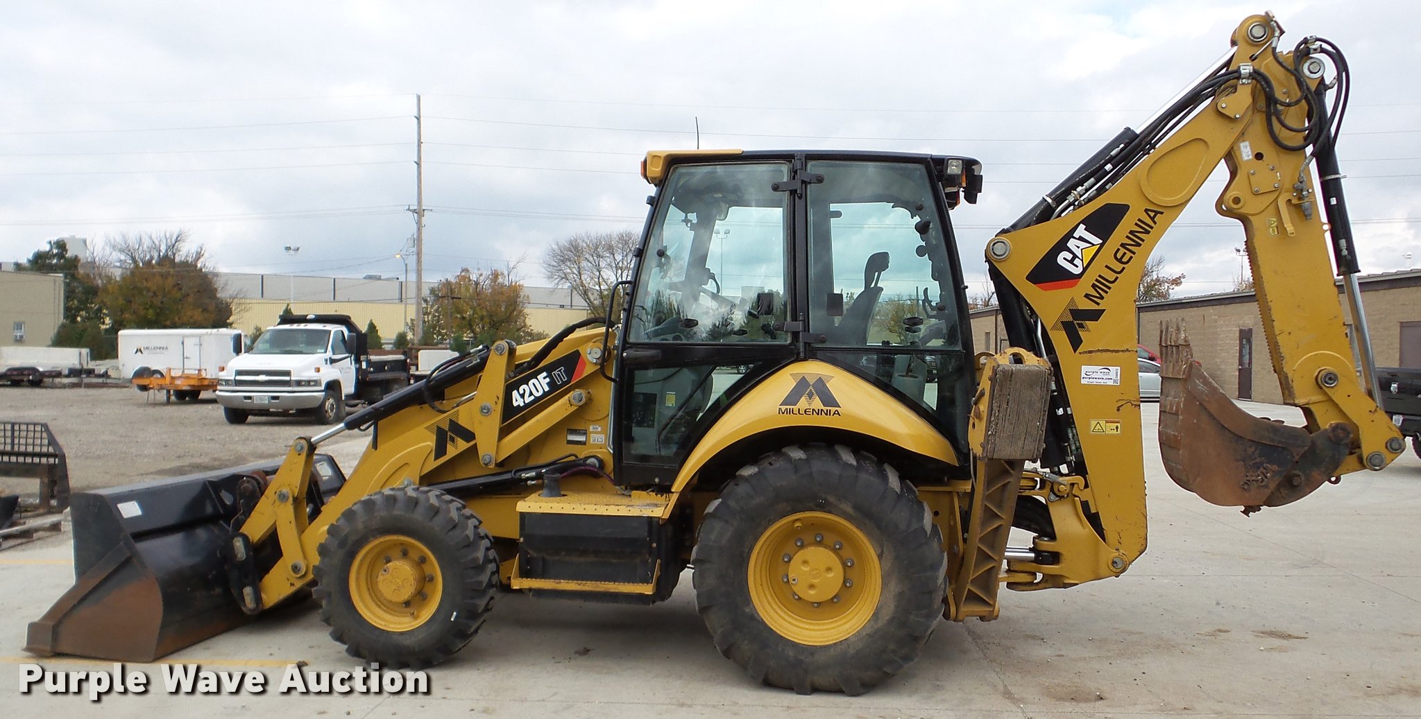 Purple Wave is selling a used Tractor Loader Backhoe in Illinois. This item is a 2013 Caterpillar 420F IT backhoe with the following: 2,818 hours on meter, Caterpillar C4.4 turbo diesel engine, Shuttle shift transmission, 4F-4R gears, Four wheel drive, EROPS, AC and heat, AM/FM, Tilt steering wheel, Air suspension seat, Wobble stick backhoe controls, Wipers, Front and rear work lights, Backup alarm, Caterpillar 251-1794 92"W loader bucket, Bolt-on cutting edge, Self-leveling bucket, Auxiliary hydraulics, E-stick, 72"W backhoe bucket, (5) teeth, Auxiliary hydraulics, Ride control, 12.5-18 front tires, 19.5L-24 rear tires, Serial CATD420FUJWJ00297