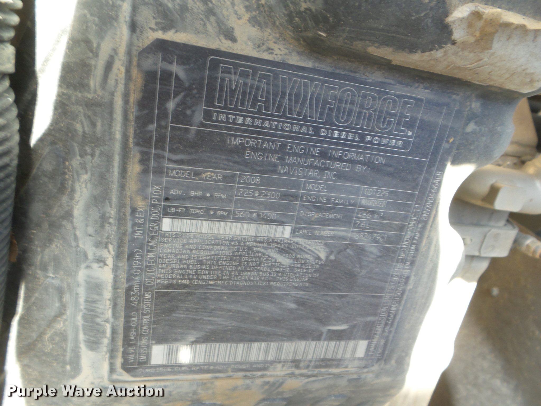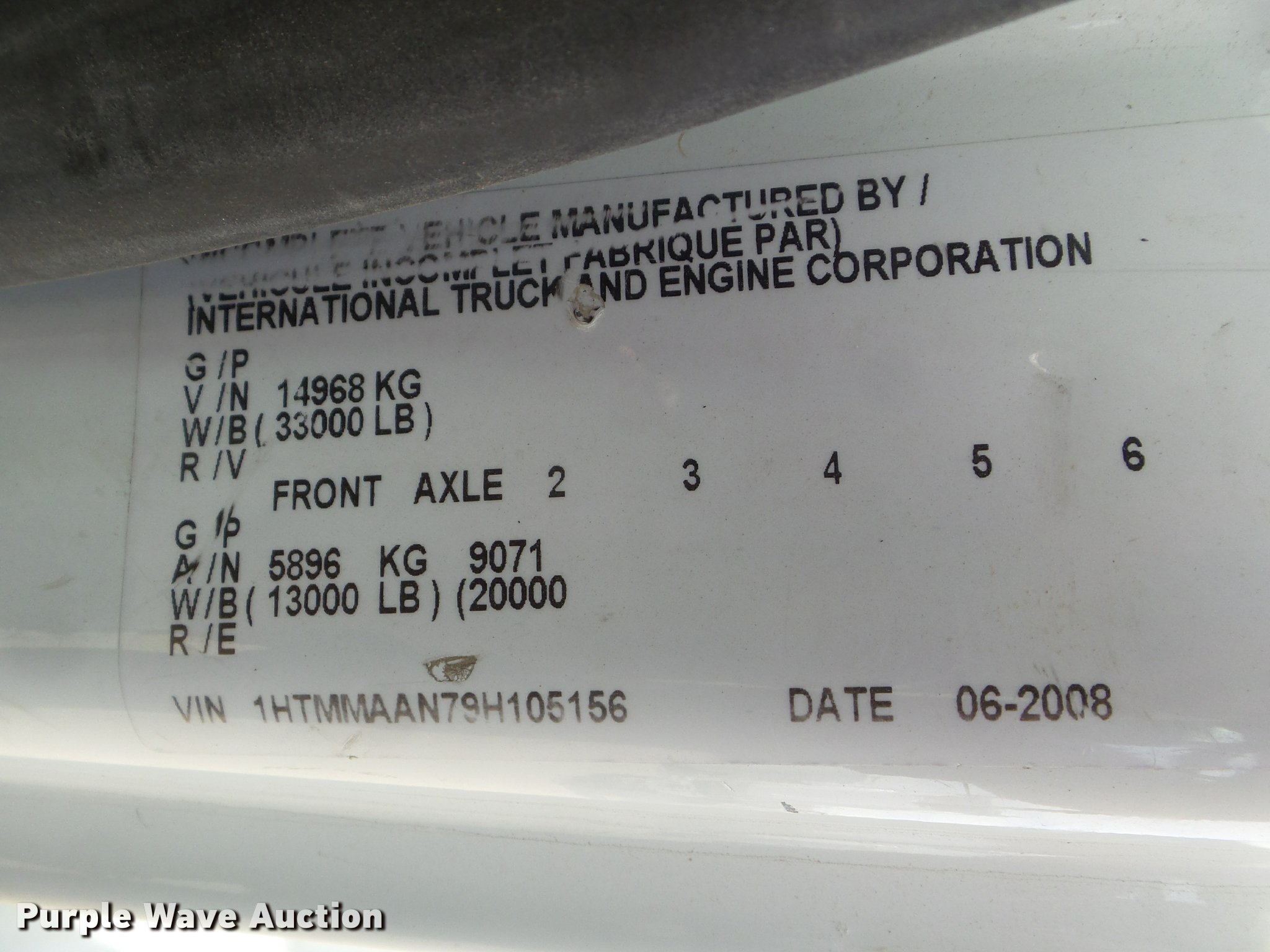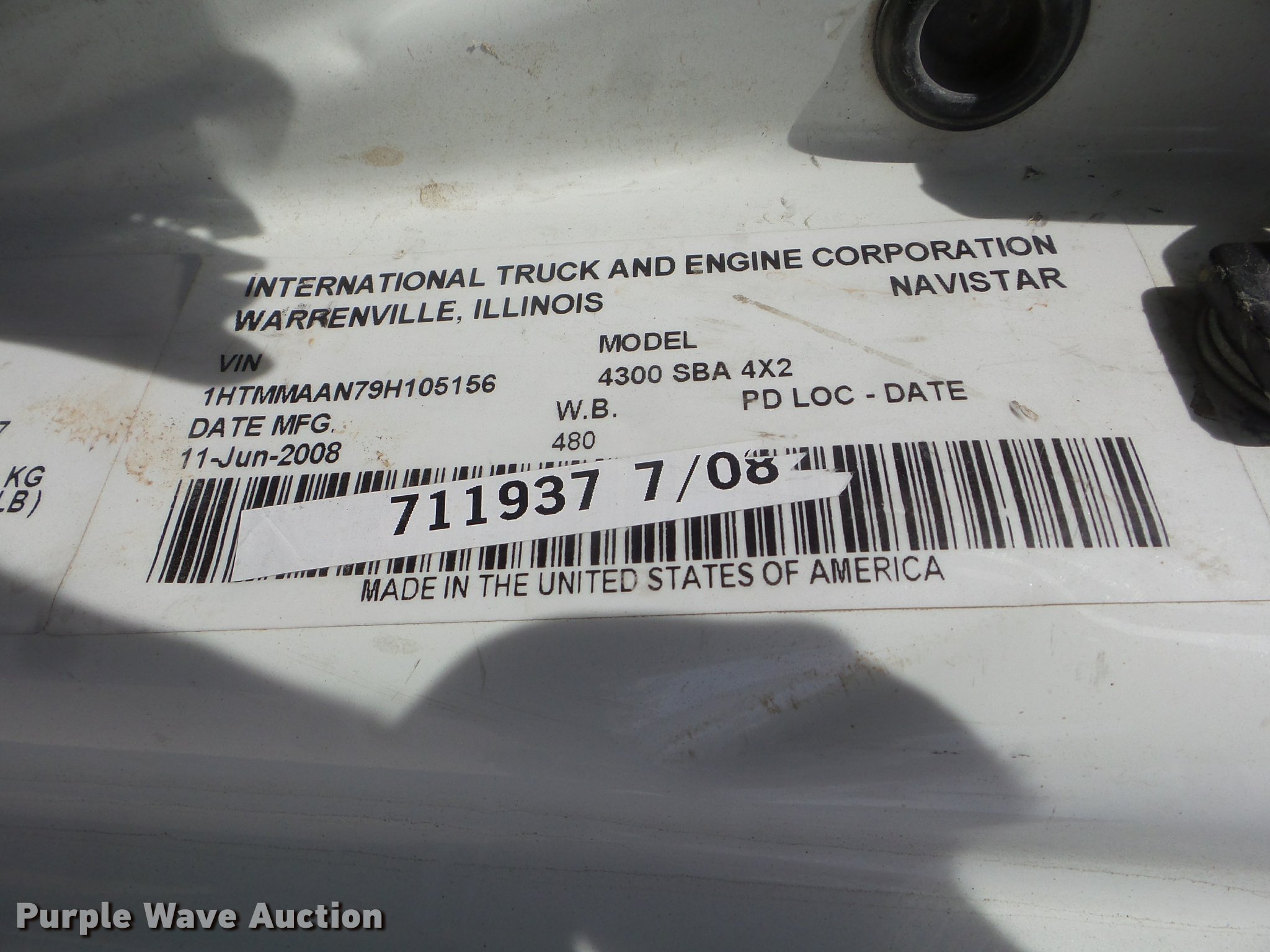 Purple Wave is selling a used Bucket Truck in California. This item is a 2009 International DuraStar 4300 bucket truck with the following: 55,035 miles on odometer, 7,180 hours on meter, International MaxxForce DT DT466 7.6L L6 turbo diesel engine, Automatic transmission, Single axle, AC and heat, Cruise, AM/FM, Spring suspension seat, Beacon light, Front tow hooks, Trailer brake controller, PTO, Altec 16'L service bed, Serial 971178574407/08, Shelving, Receiver hitch, Trailer wiring, Glad hand couplers, 2008 Altec AA755L boom, Serial 0708BZ5703, 56' boom length, 600 lbs maximum lift capacity, Man basket, Platform and ground controls, Boom rotation, Articulating, insulated boom, Single fuel tank, 188" wheelbase, Spring suspension, Air brakes, 11R22.5 tires, GVWR 33,000 lbs, California emissions compliant, Boom rust, Boom is not certified, Contents are not included, Unit# 1361
