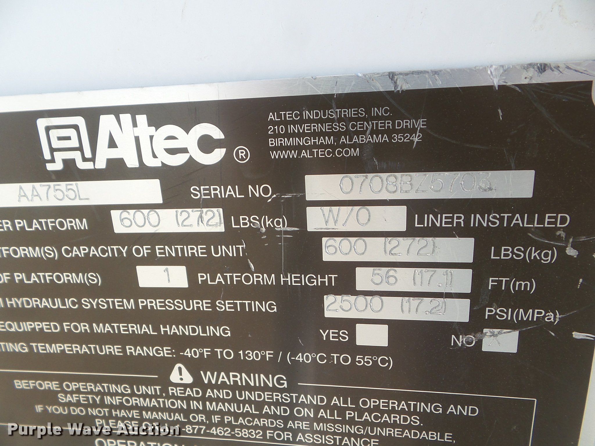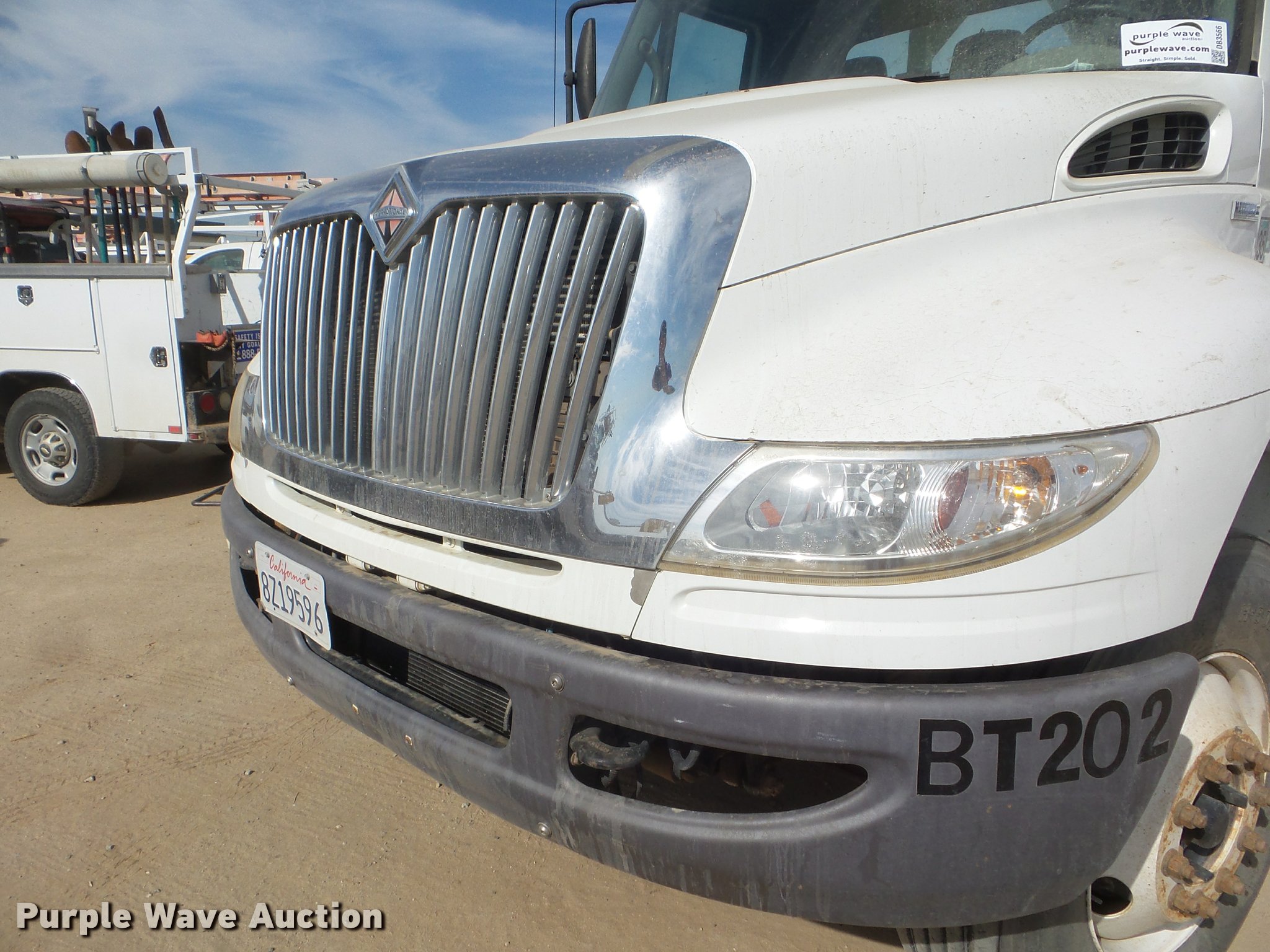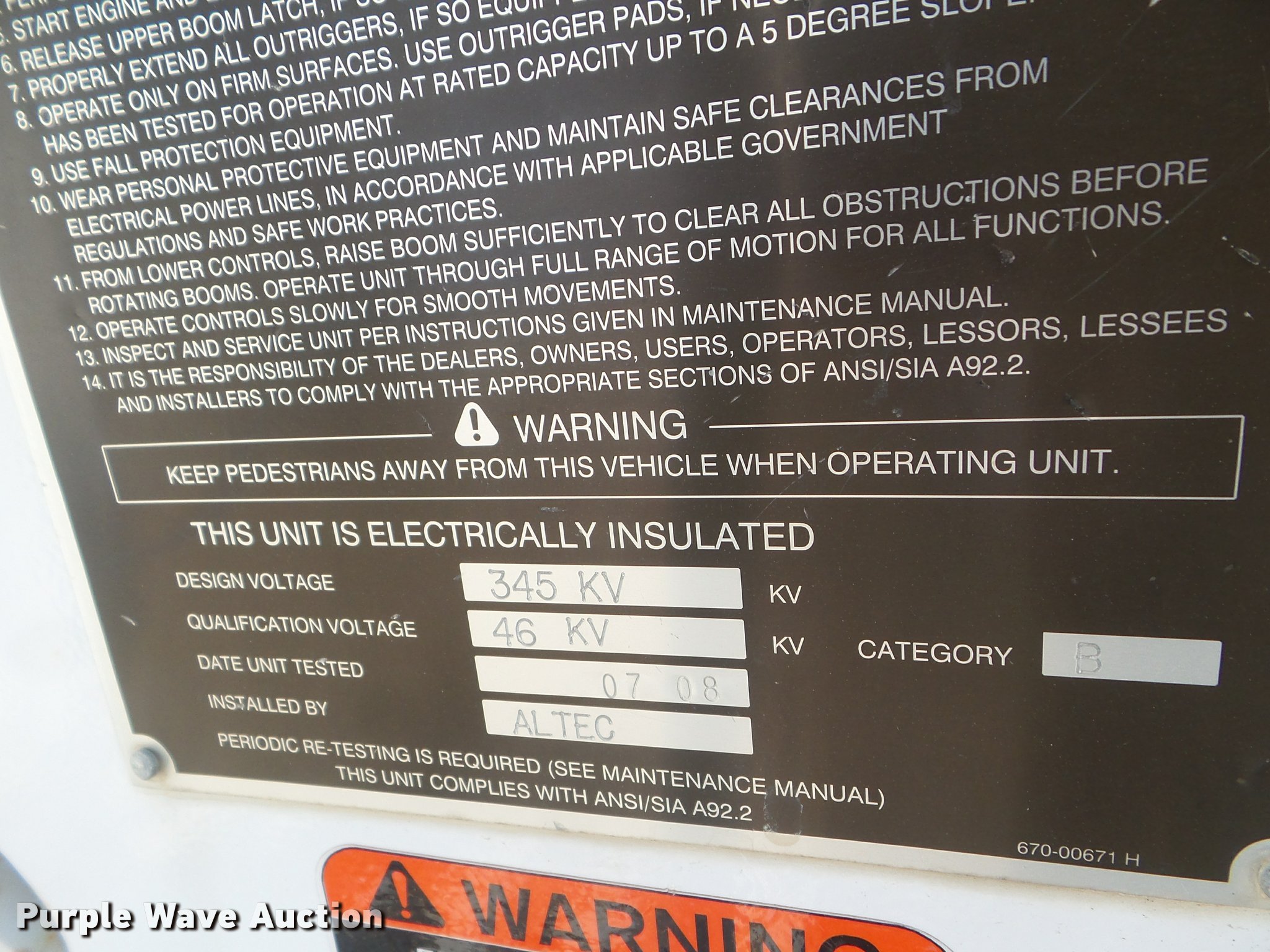 Purple Wave is selling a used Bucket Truck in California. This item is a 2009 International DuraStar 4300 bucket truck with the following: 55,035 miles on odometer, 7,180 hours on meter, International MaxxForce DT DT466 7.6L L6 turbo diesel engine, Automatic transmission, Single axle, AC and heat, Cruise, AM/FM, Spring suspension seat, Beacon light, Front tow hooks, Trailer brake controller, PTO, Altec 16'L service bed, Serial 971178574407/08, Shelving, Receiver hitch, Trailer wiring, Glad hand couplers, 2008 Altec AA755L boom, Serial 0708BZ5703, 56' boom length, 600 lbs maximum lift capacity, Man basket, Platform and ground controls, Boom rotation, Articulating, insulated boom, Single fuel tank, 188" wheelbase, Spring suspension, Air brakes, 11R22.5 tires, GVWR 33,000 lbs, California emissions compliant, Boom rust, Boom is not certified, Contents are not included, Unit# 1361