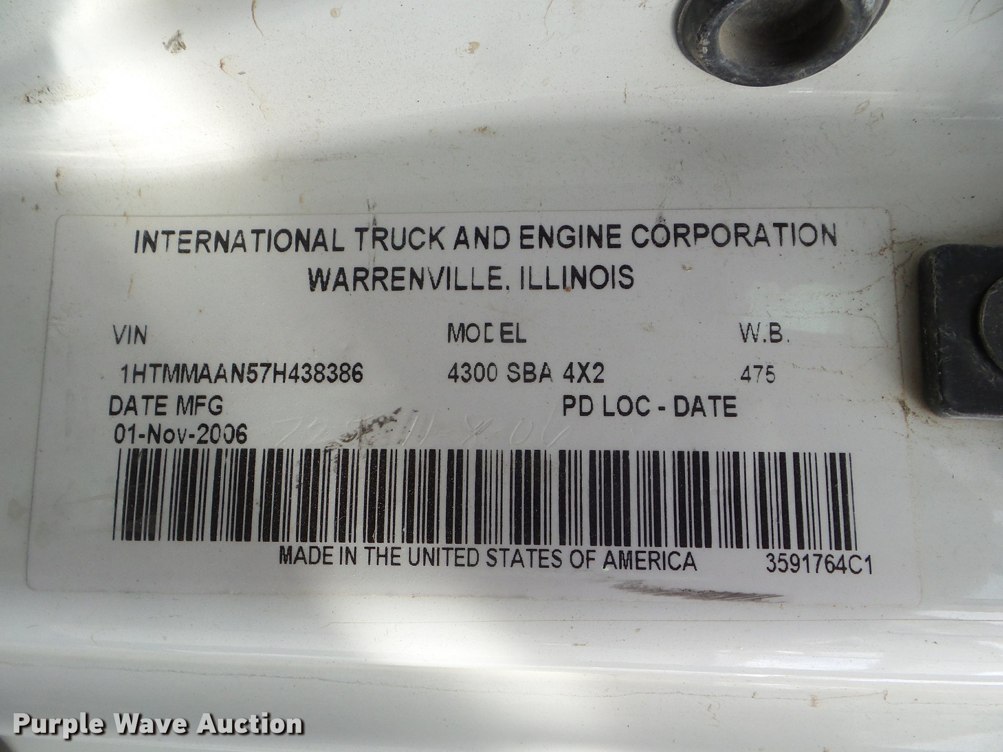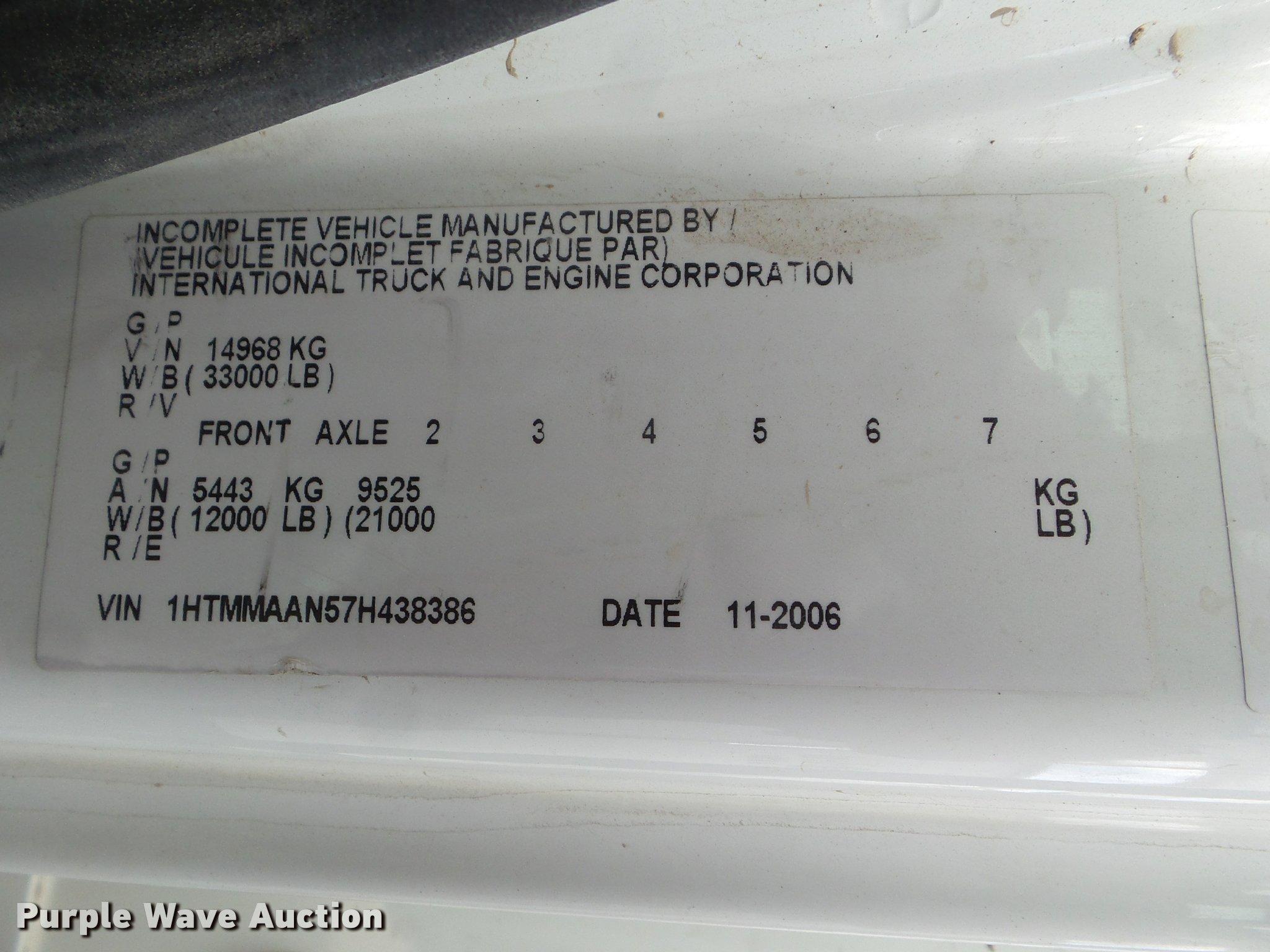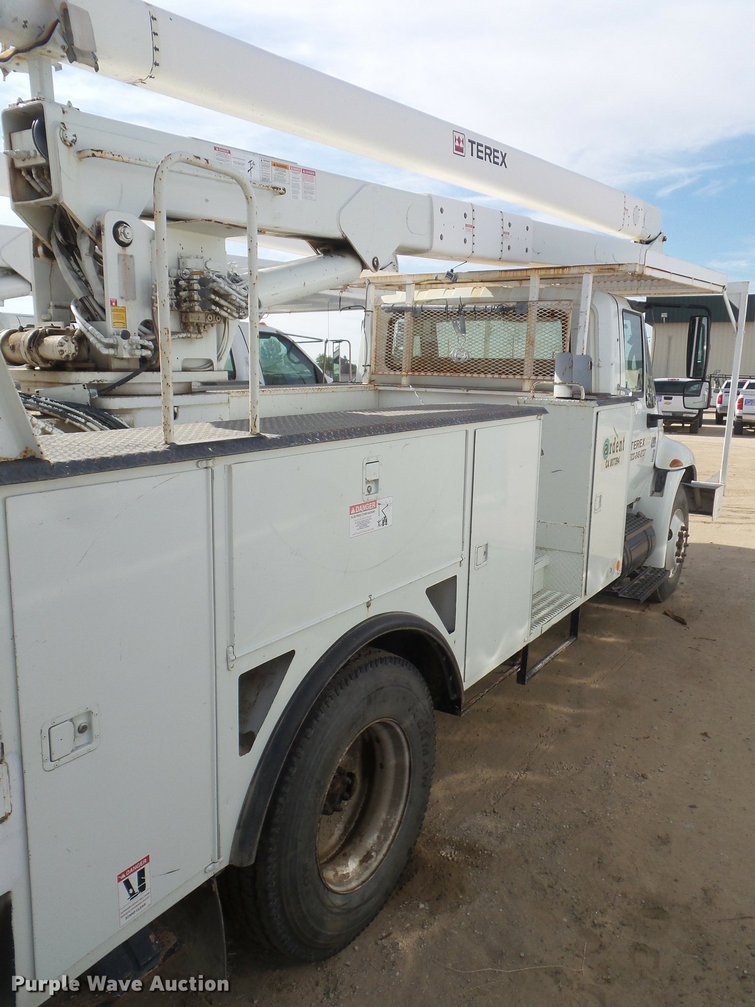 Purple Wave is selling a used Bucket Truck in California. This item is a 2007 International DuraStar 4300 bucket truck with the following: 50,689 miles on odometer, 6,352 hours on meter, International DT466 7.6L L6 turbo diesel engine, Automatic transmission, Single axle, AC and heat, Cruise, AM/FM, Spring suspension seat, PTO, Terex IN14588 service bed, 16'L, Shelving, Pintle hitch, Rear hydraulic remote, 2008 Terex Hi-Ranger boom, 700 lbs maximum lift capacity, 55' maximum lift height, Ground and platform controls, Boom rotation, Articulating, insulated boom, (2) outriggers, Single fuel tank, 188" wheelbase, Spring suspension, Air brakes, 11R22.5 tires, GVWR 33,000 lbs, Transmission issue, Possible computer issue, Vehicle is not California emissions compliant, Contents are not included, Unit# 1317
