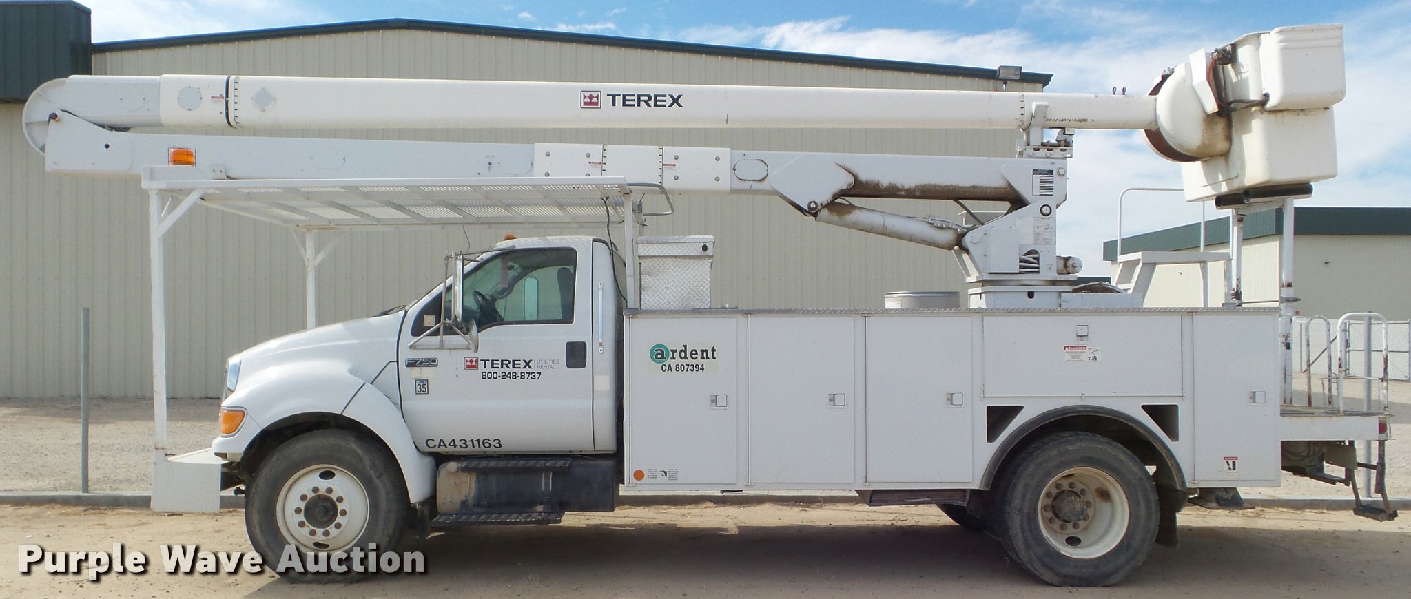 Purple Wave is selling a used Bucket Truck in California. This item is a 2008 Ford F750 Super Duty bucket truck with the following: 40,394 miles on odometer, 5,662 hours on meter, 1,915 PTO hours on meter, Caterpillar C7 7.2L L6 turbo diesel engine, Automatic transmission, Single axle, AC and heat, AM/FM, Air suspension seat, Backup alarm, Front tow hooks, PTO, Terex IN15565 service bed, 16'L, Pintle hitch, Trailer wiring, Glad hand couplers, Terex Hi-Ranger boom, 700 lbs maximum lift capacity, 55' maximum lift height, Man basket, Ground and platform controls, Boom rotation, Articulating, insulated boom, Beacon light, Front tow hooks, Single fuel tank, 196" wheelbase, Spring suspension, Air brakes, 11R22.5 tires, GVWR 33,000 lbs, Boom leaks, Battery dead, Contents are not included, Vehicle is not California emissions certified