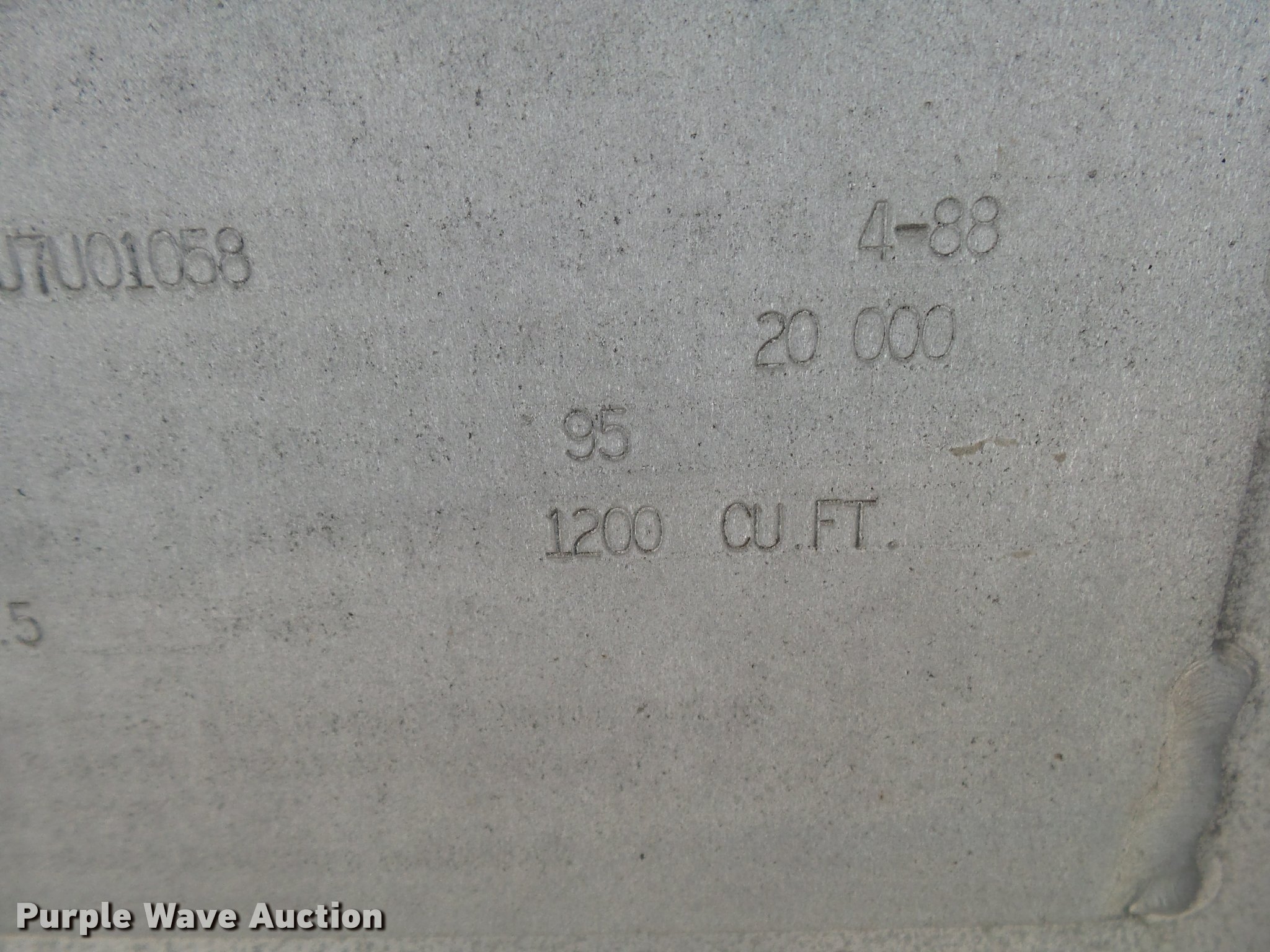 Purple Wave is selling a used Tank Trailer in Missouri. This item is a 1988 Heil dry bulk trailer with the following: 42' overall length, 8'W, Steel tank, 1,200 cu. ft. capacity, Single compartment, (3) manways, 24"W, Rear ladder, Fifth wheel plate, Dual leg landing gear, Spring suspension, Air brakes, Tandem axle, Steel wheels, 11R22.5 tires, GVWR 70,000 lbs