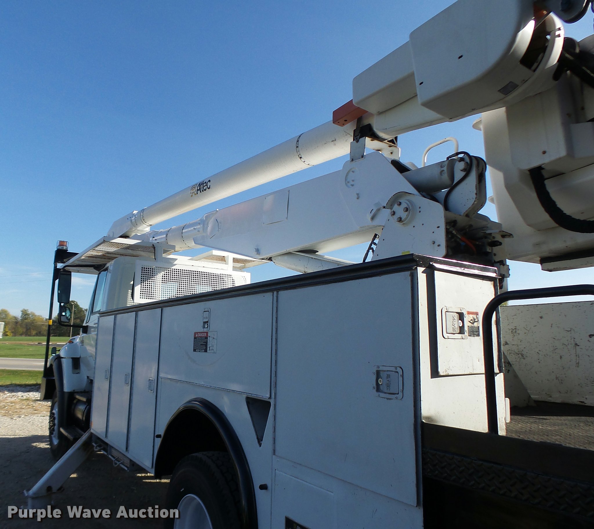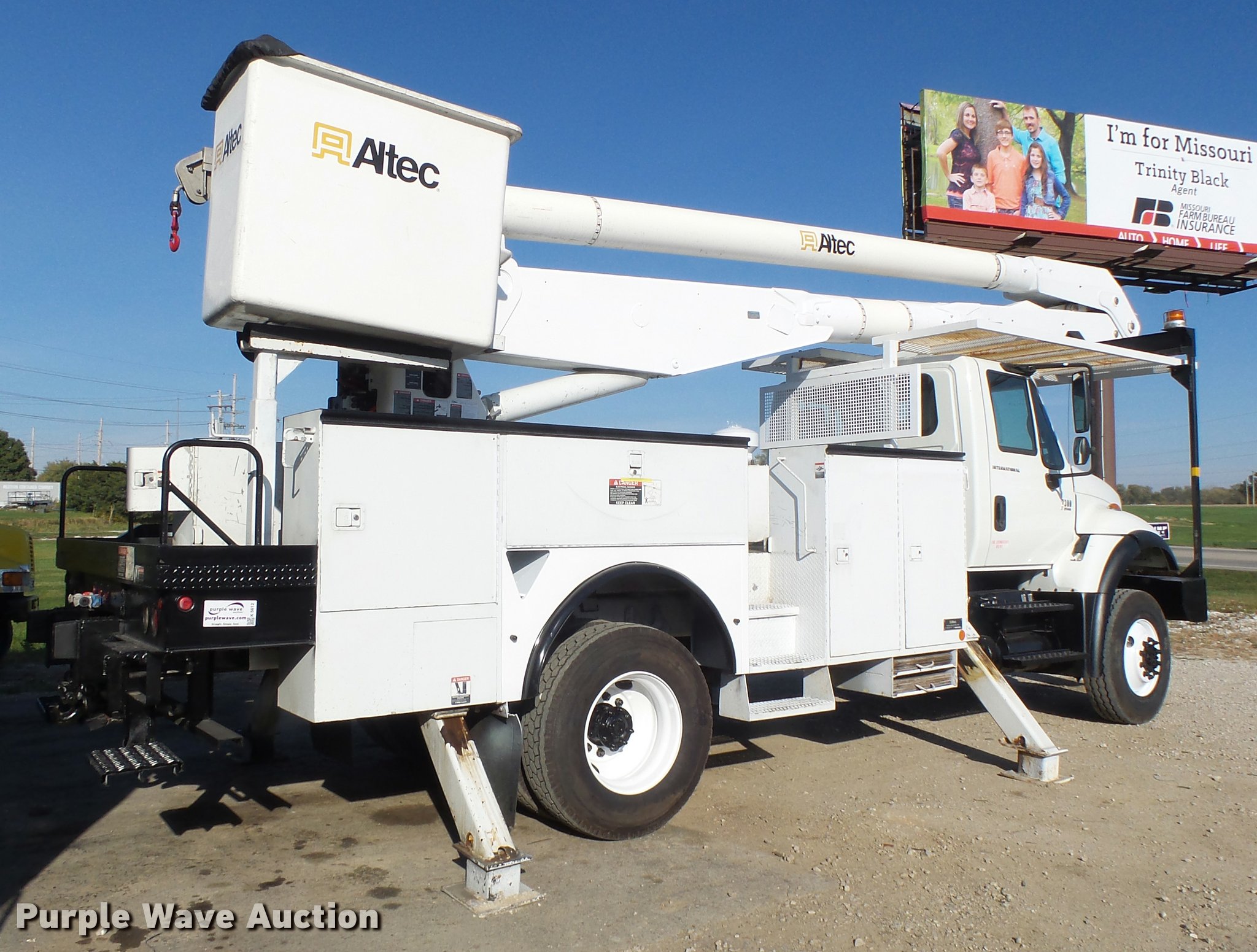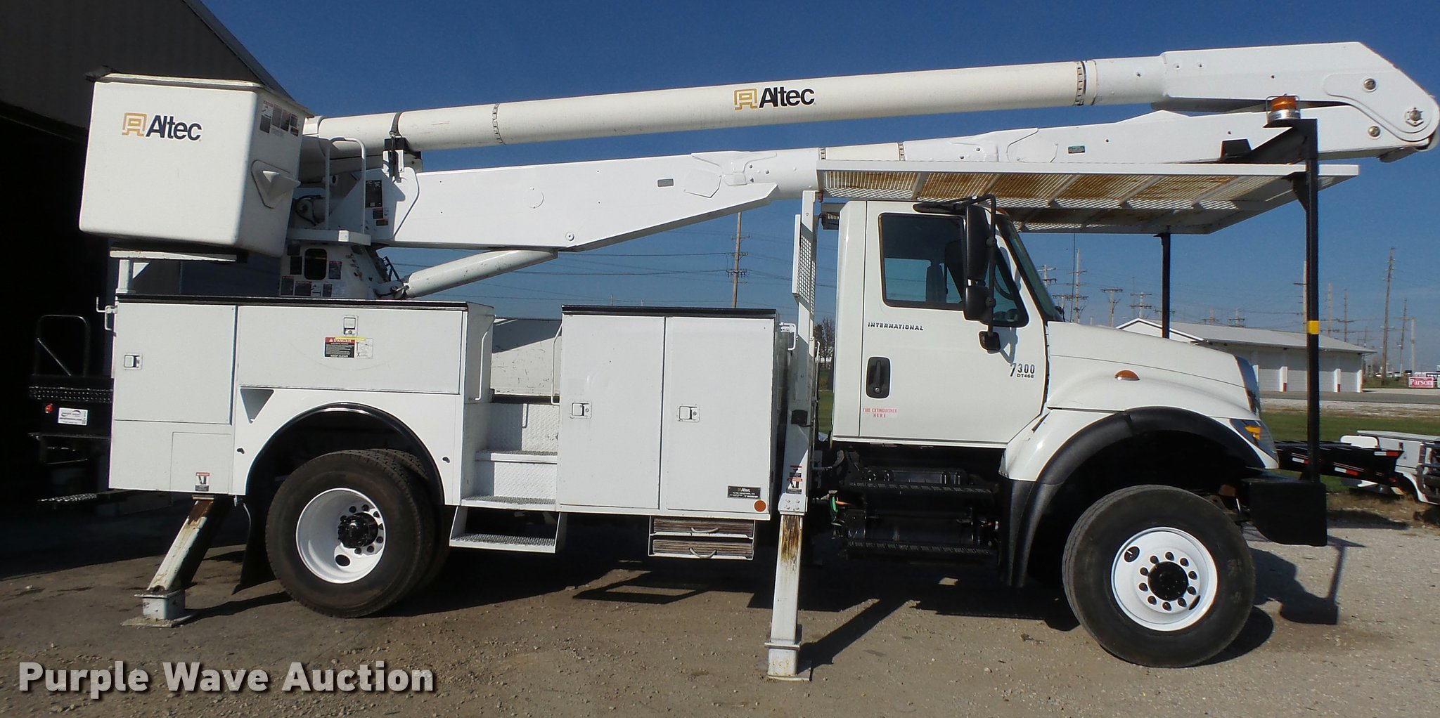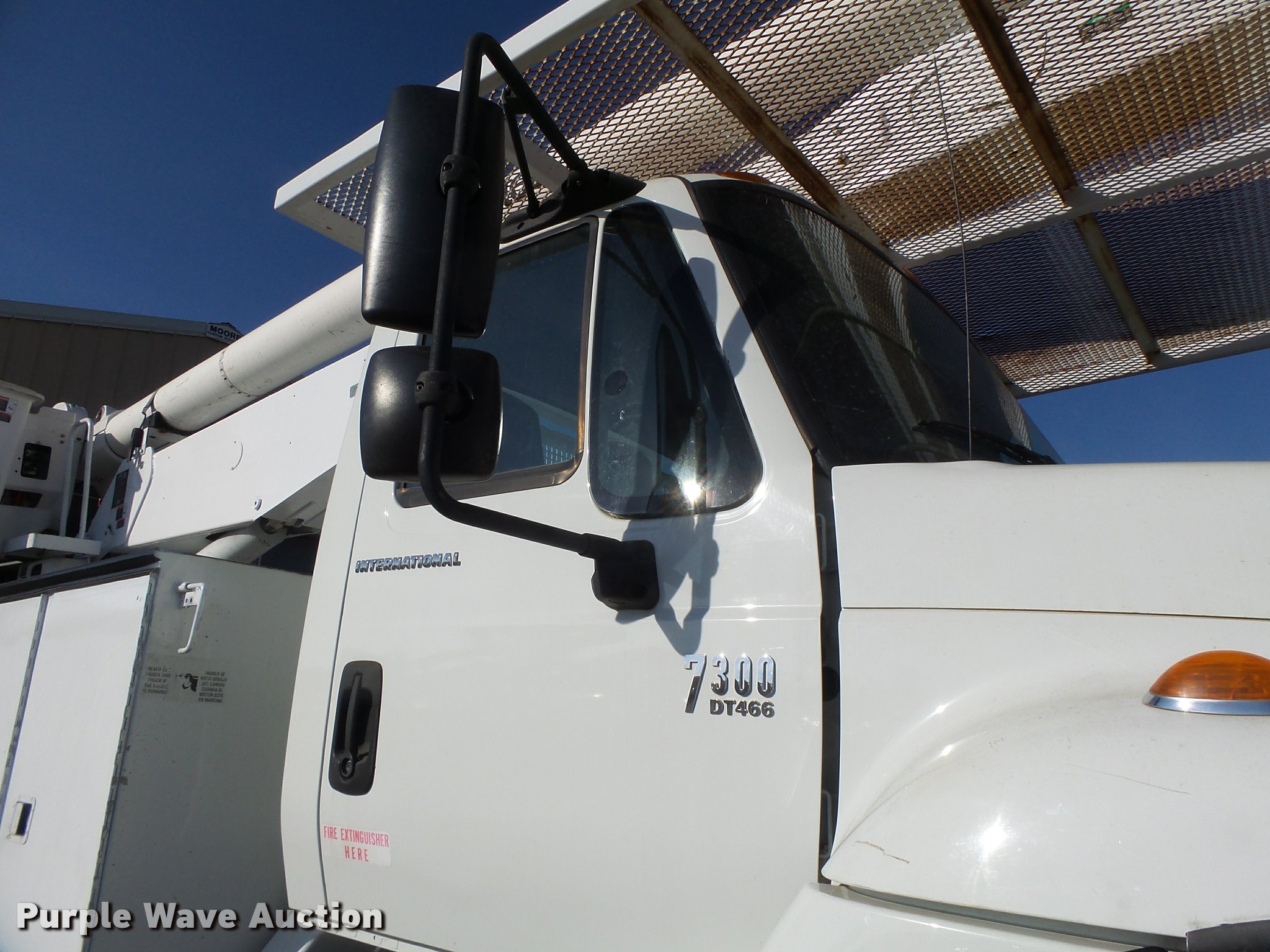 Purple Wave is selling a used Bucket Truck in Missouri. This item is a 2007 International 7300 bucket truck with the following: 68,630 miles on odometer, International DT466 7.6L L6 turbo diesel engine, Six speed manual transmission, Four wheel drive, Single axle, AC and heat, AM/FM, Suspension seat, Front tow hooks, Beacon light, PTO, Knapheide 6170HC service bed, 16'L, Shelving, Altec AA755L boom, 700 lbs max lift capacity, Man basket, 55' max lift height, Ground and platform controls, Articulated and insulated boom, (4) outriggers, Serial 0407BZ5057, Single fuel tank, Pintle hitch, Trailer wiring, Spring suspension, Air brakes, 11R22.5 tires, GVWR 33,000 lbs