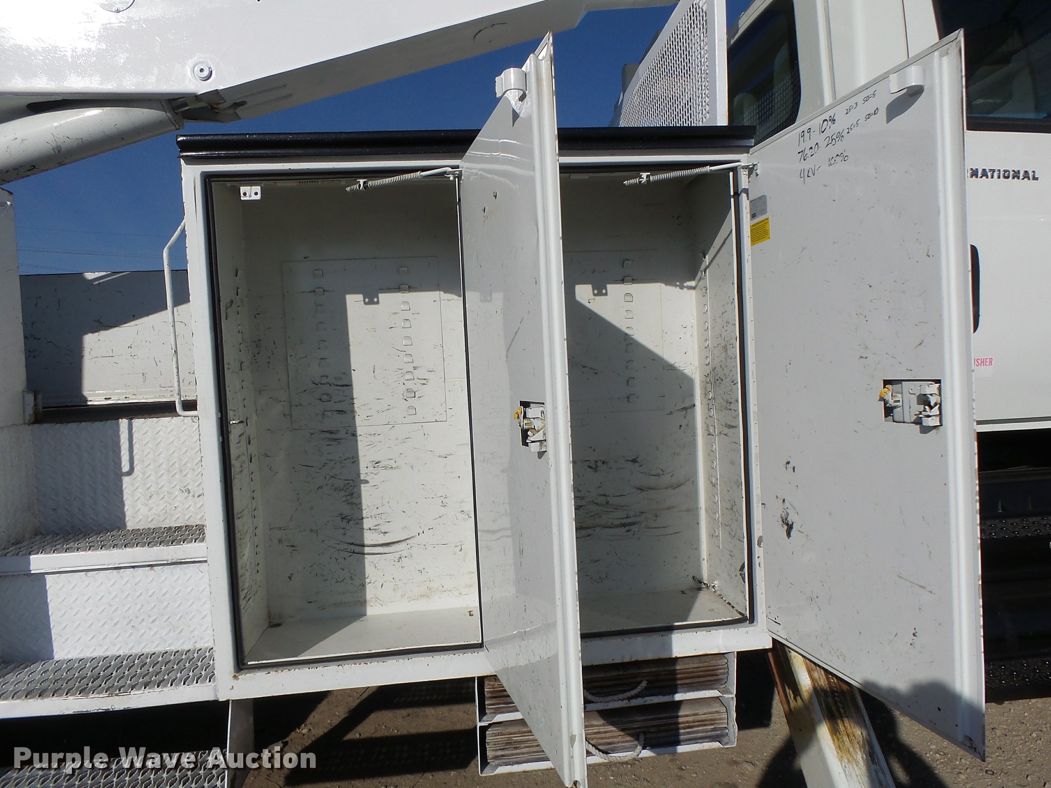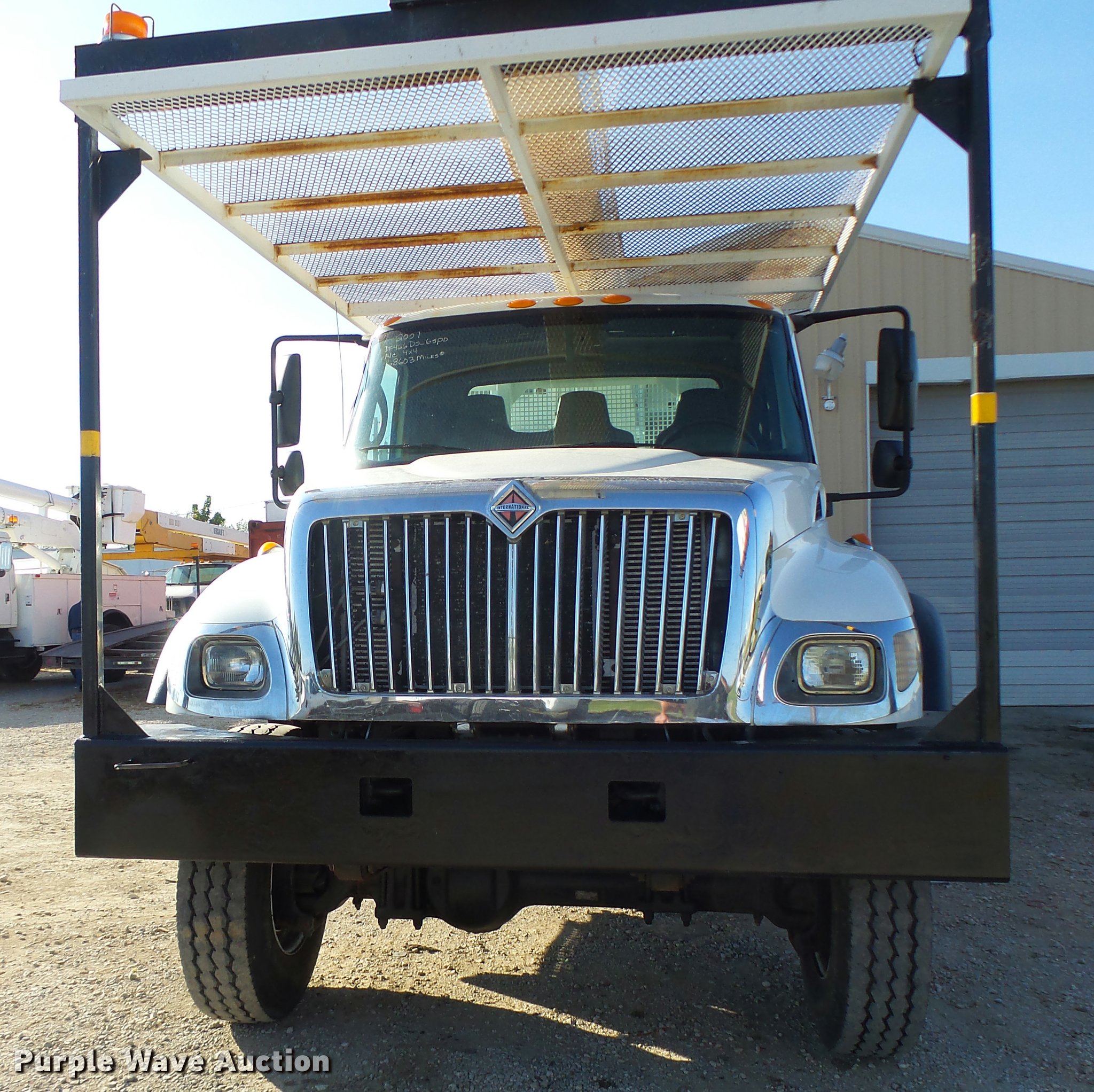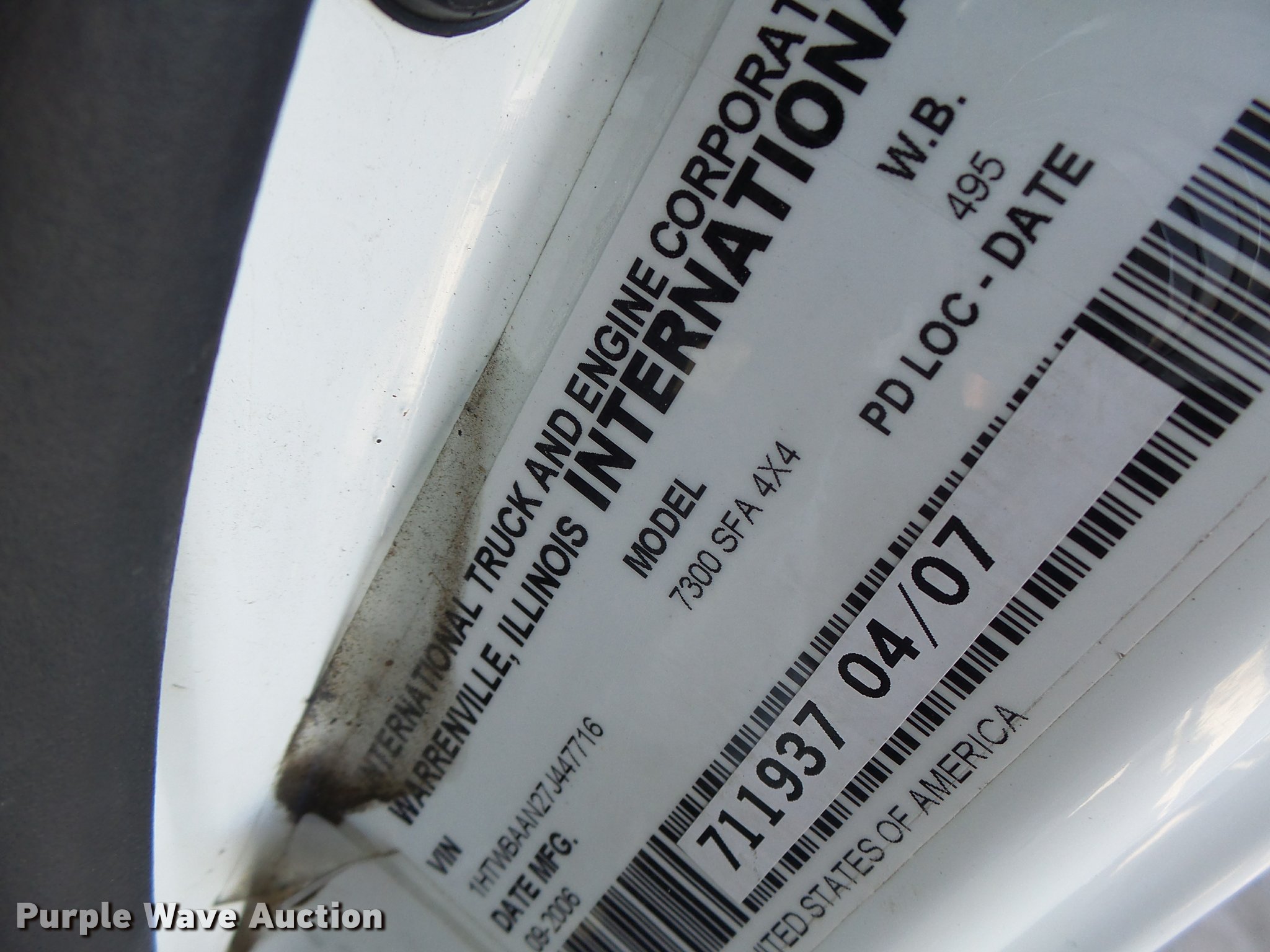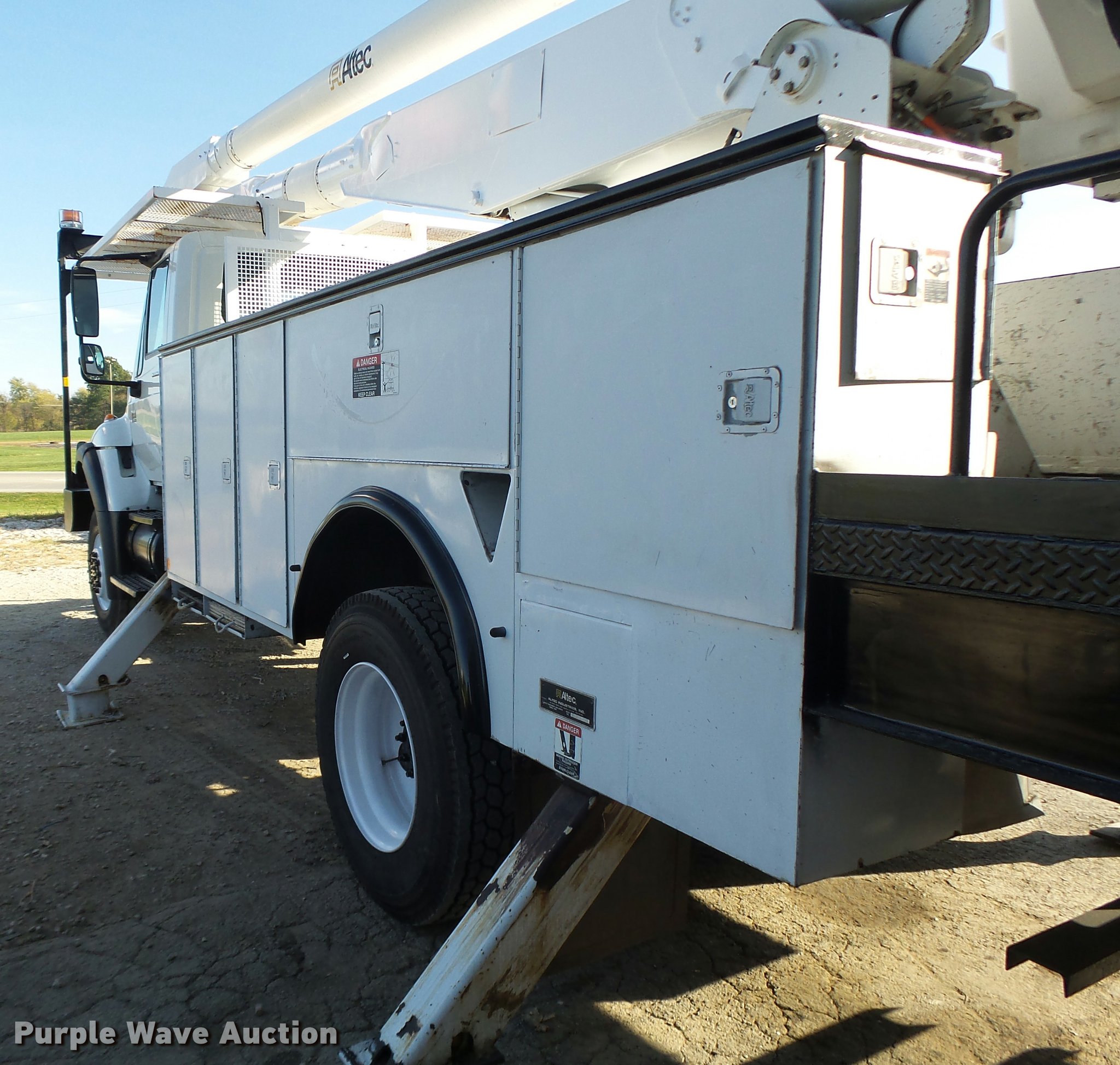 Purple Wave is selling a used Bucket Truck in Missouri. This item is a 2007 International 7300 bucket truck with the following: 68,630 miles on odometer, International DT466 7.6L L6 turbo diesel engine, Six speed manual transmission, Four wheel drive, Single axle, AC and heat, AM/FM, Suspension seat, Front tow hooks, Beacon light, PTO, Knapheide 6170HC service bed, 16'L, Shelving, Altec AA755L boom, 700 lbs max lift capacity, Man basket, 55' max lift height, Ground and platform controls, Articulated and insulated boom, (4) outriggers, Serial 0407BZ5057, Single fuel tank, Pintle hitch, Trailer wiring, Spring suspension, Air brakes, 11R22.5 tires, GVWR 33,000 lbs