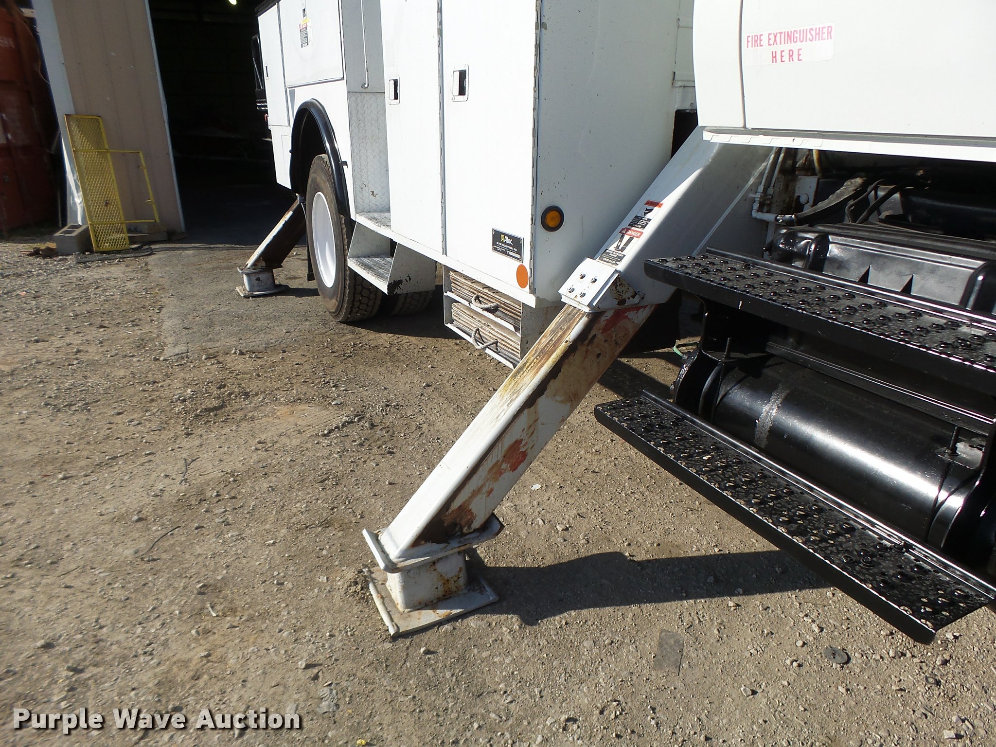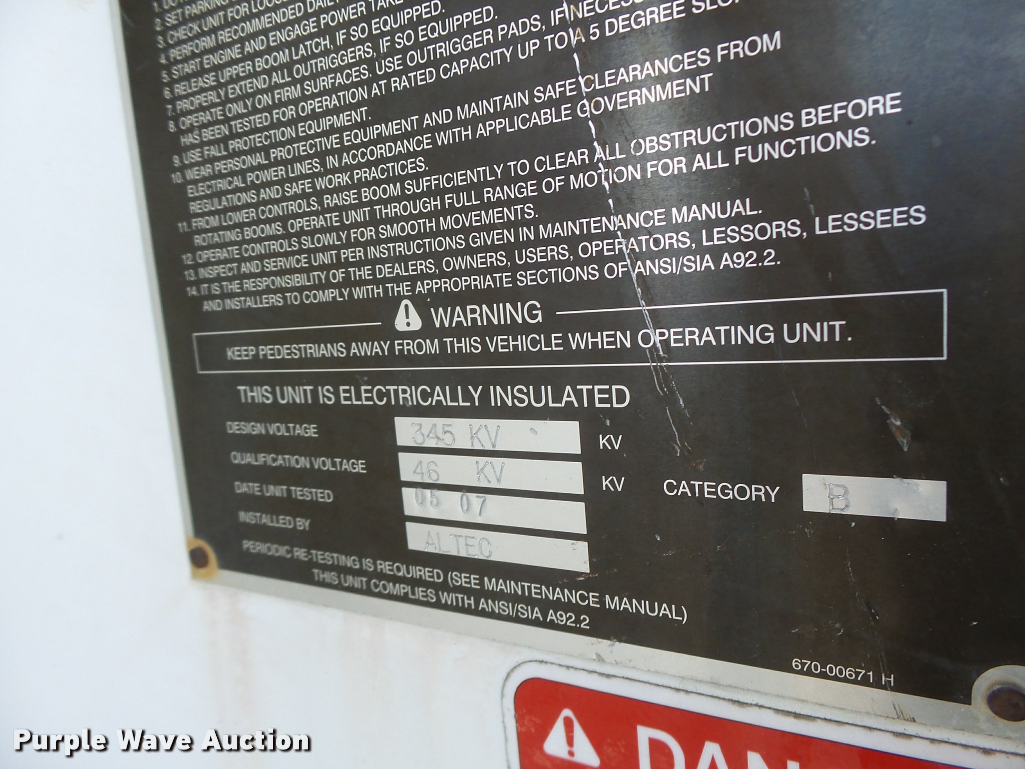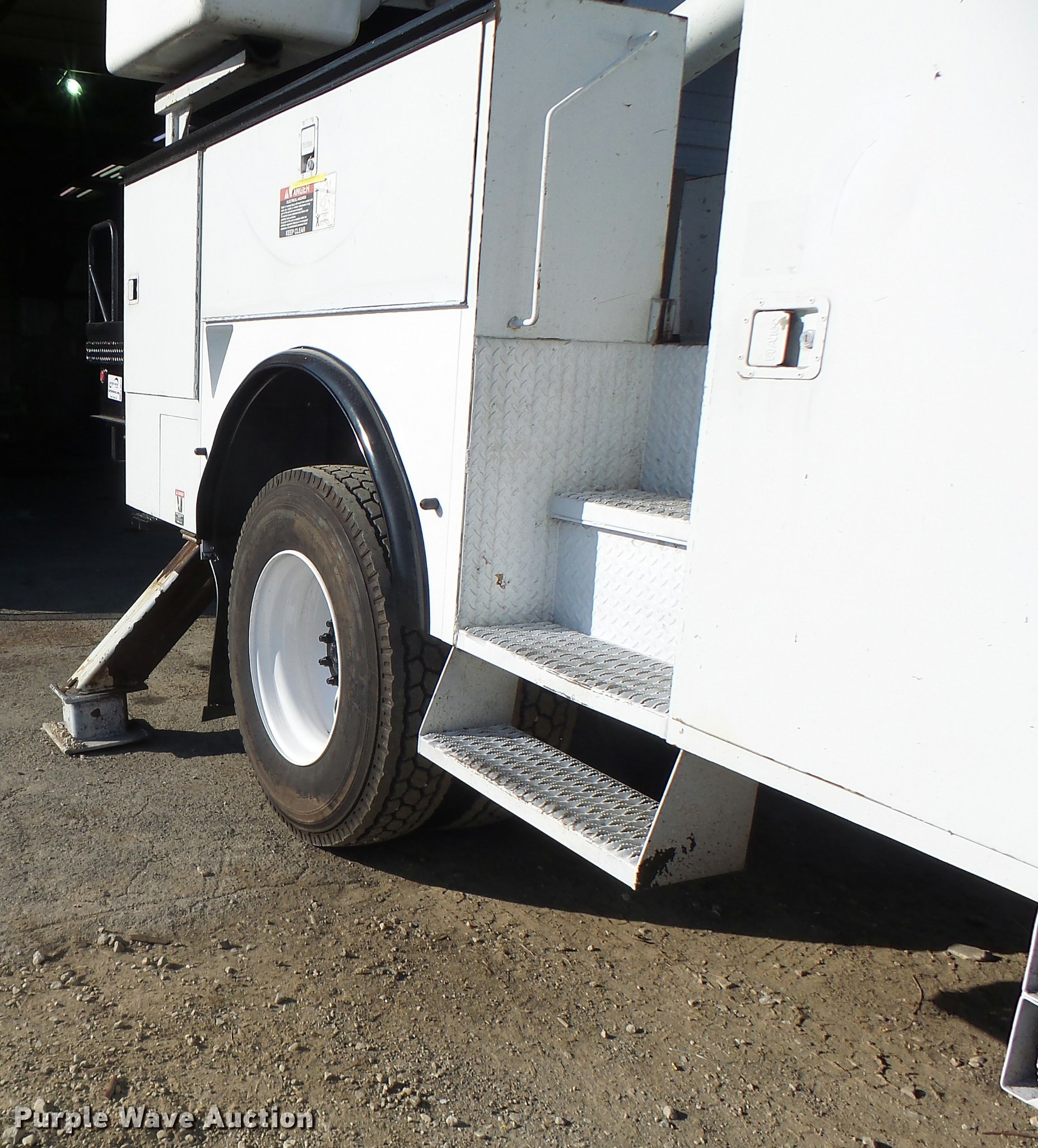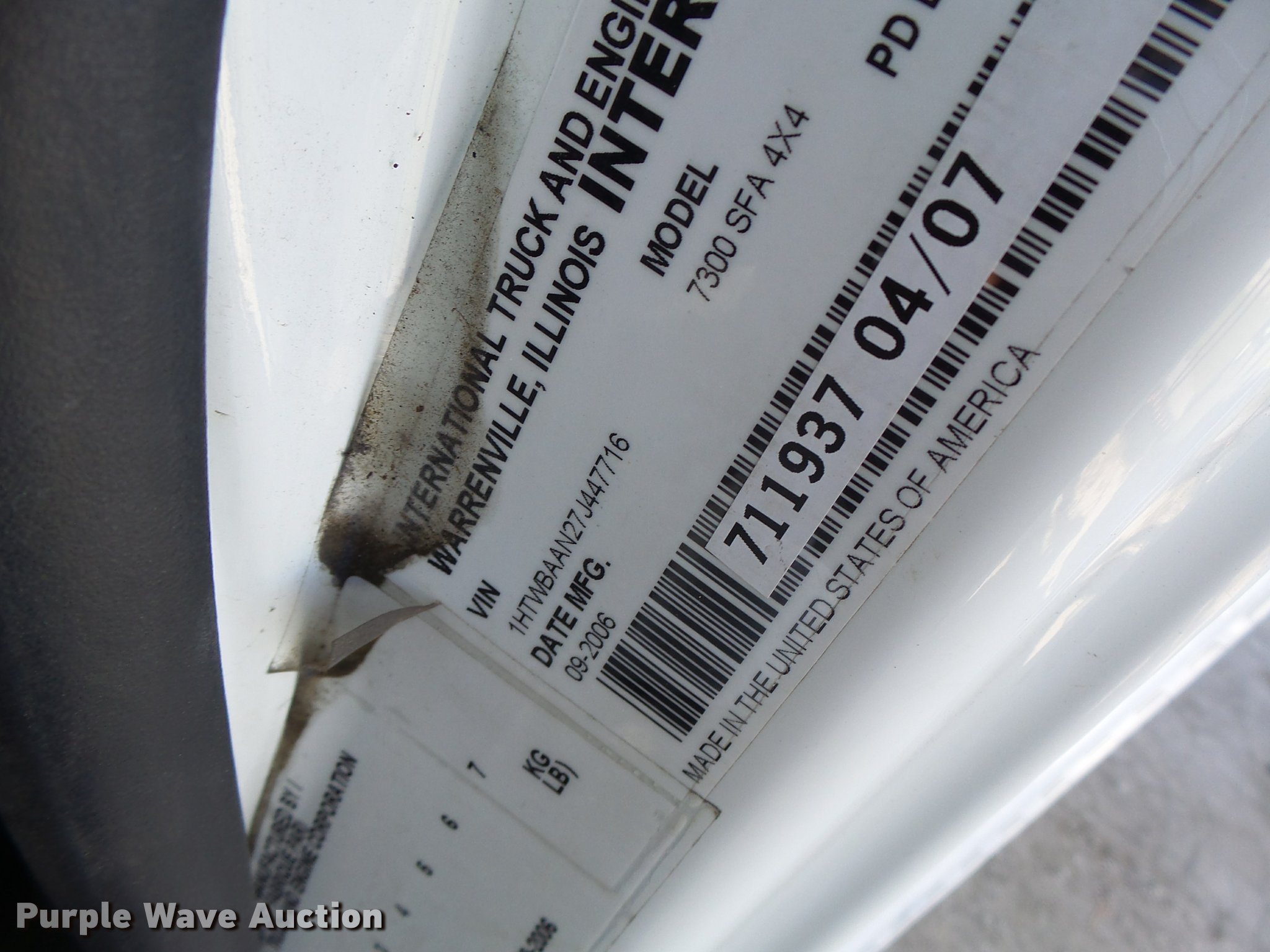 Purple Wave is selling a used Bucket Truck in Missouri. This item is a 2007 International 7300 bucket truck with the following: 68,630 miles on odometer, International DT466 7.6L L6 turbo diesel engine, Six speed manual transmission, Four wheel drive, Single axle, AC and heat, AM/FM, Suspension seat, Front tow hooks, Beacon light, PTO, Knapheide 6170HC service bed, 16'L, Shelving, Altec AA755L boom, 700 lbs max lift capacity, Man basket, 55' max lift height, Ground and platform controls, Articulated and insulated boom, (4) outriggers, Serial 0407BZ5057, Single fuel tank, Pintle hitch, Trailer wiring, Spring suspension, Air brakes, 11R22.5 tires, GVWR 33,000 lbs