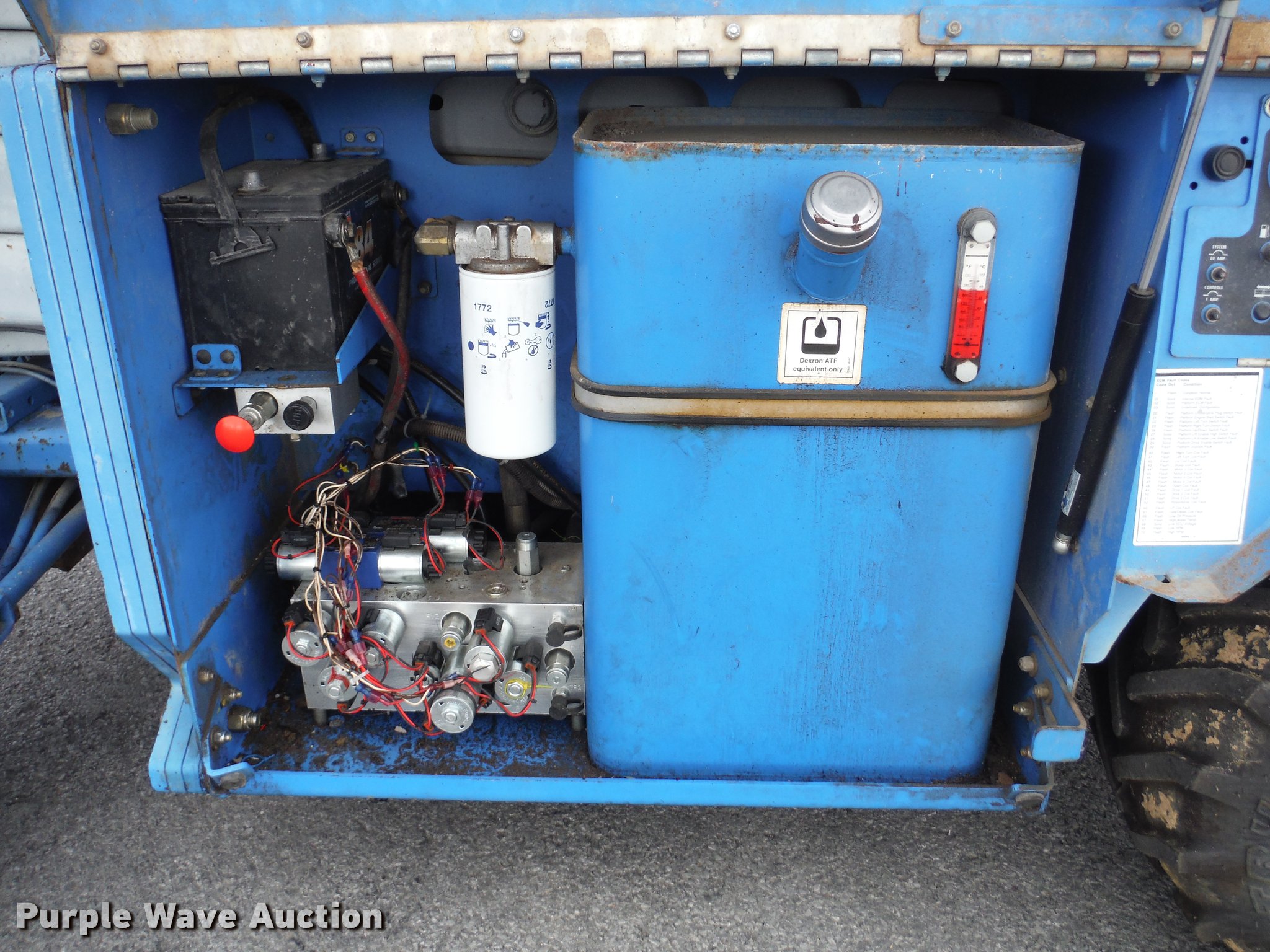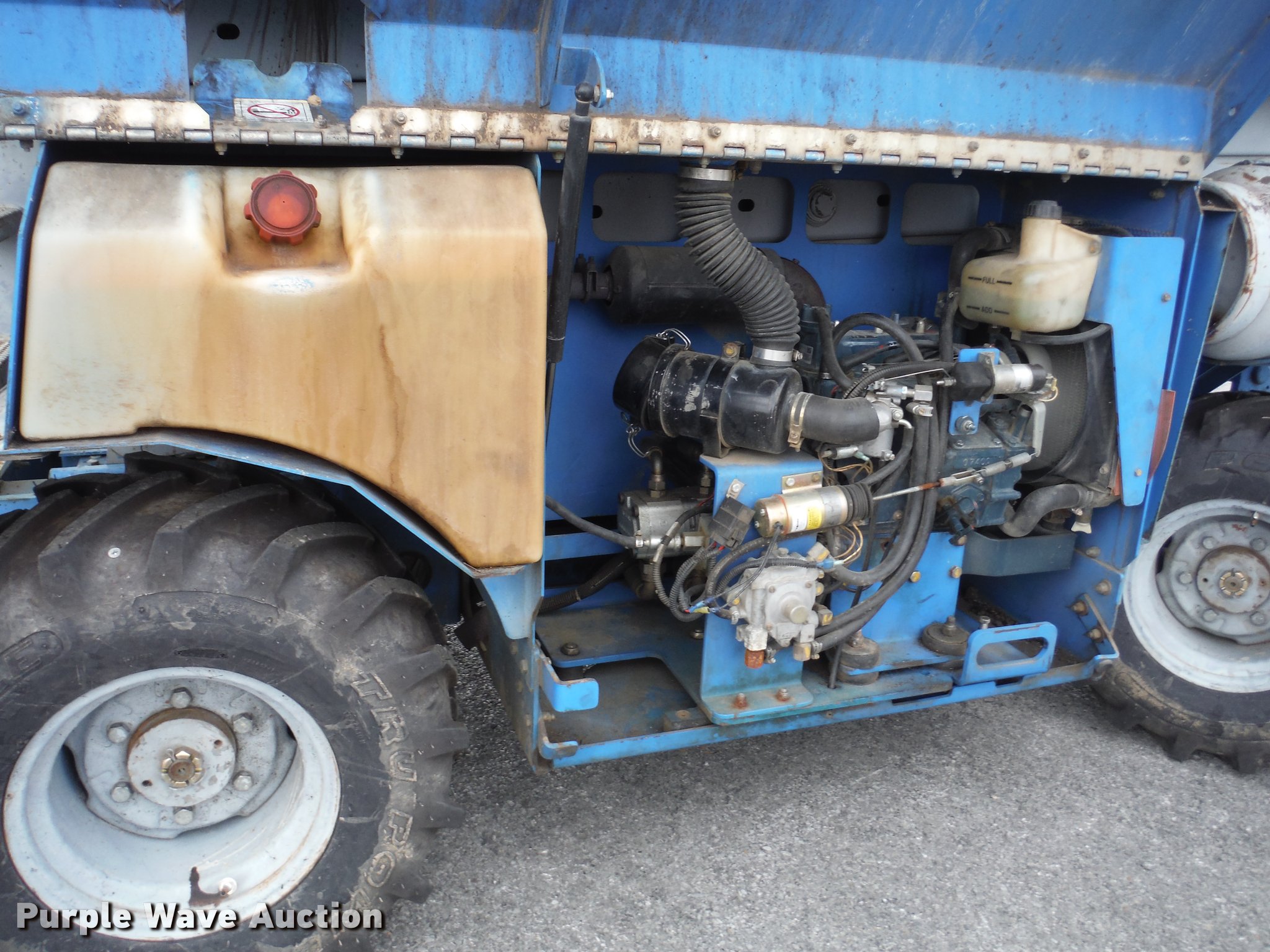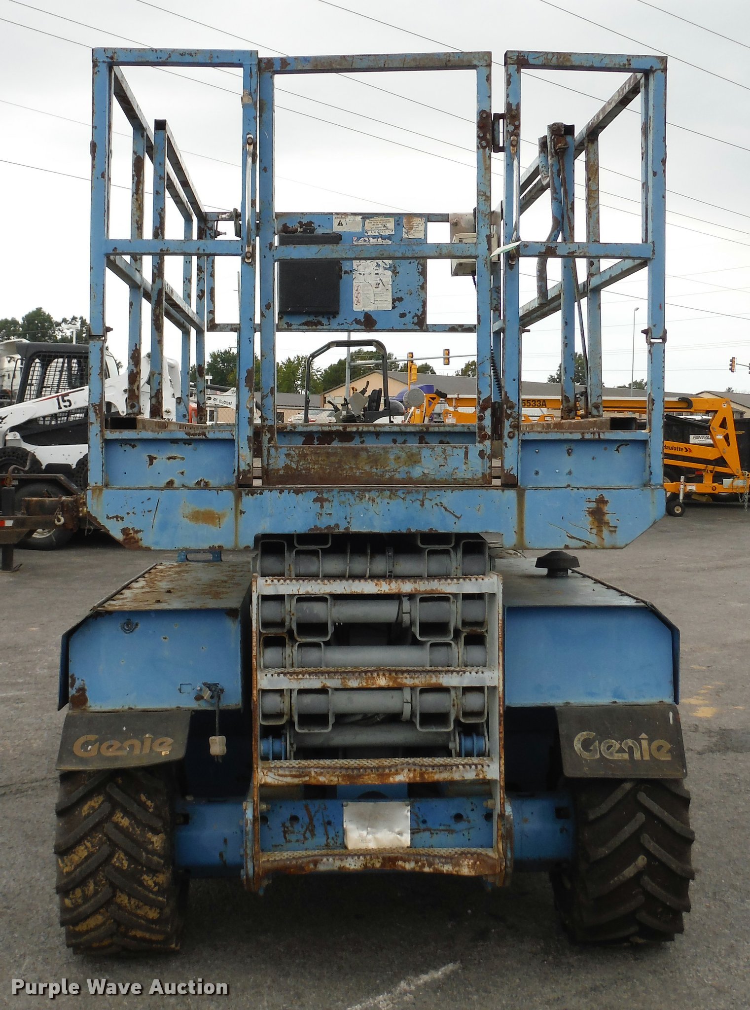 1999 Genie GS-3268RT scissor lift. 2,655 hours on meter, Kubota WG752-GL-ET three cylinder dual fuel engine 23 HP, Four wheel drive, 1,000 lbs maximum lift capacity, 32' maximum lift height, 99"L x 61"W platform Platform and ground controls, Manual platform extensions, 3.6 mph travel speed, Carlisle 26 x 12.00-12 foam filled tires, Foam-filled tires replaced in June 2016, PC board for controller replaced in March 2016, Hydraulic manifold replaced in October 2015, (4) hydraulic ground drive motors replaced in July 2015, Hydraulic pump replaced in April 2015, Engine replaced at 2,150 hours in June 2012, Serial 24102. View repairs. Rent-All & Sales Inc.. 8460 Express Drive. Marion, IL 62959