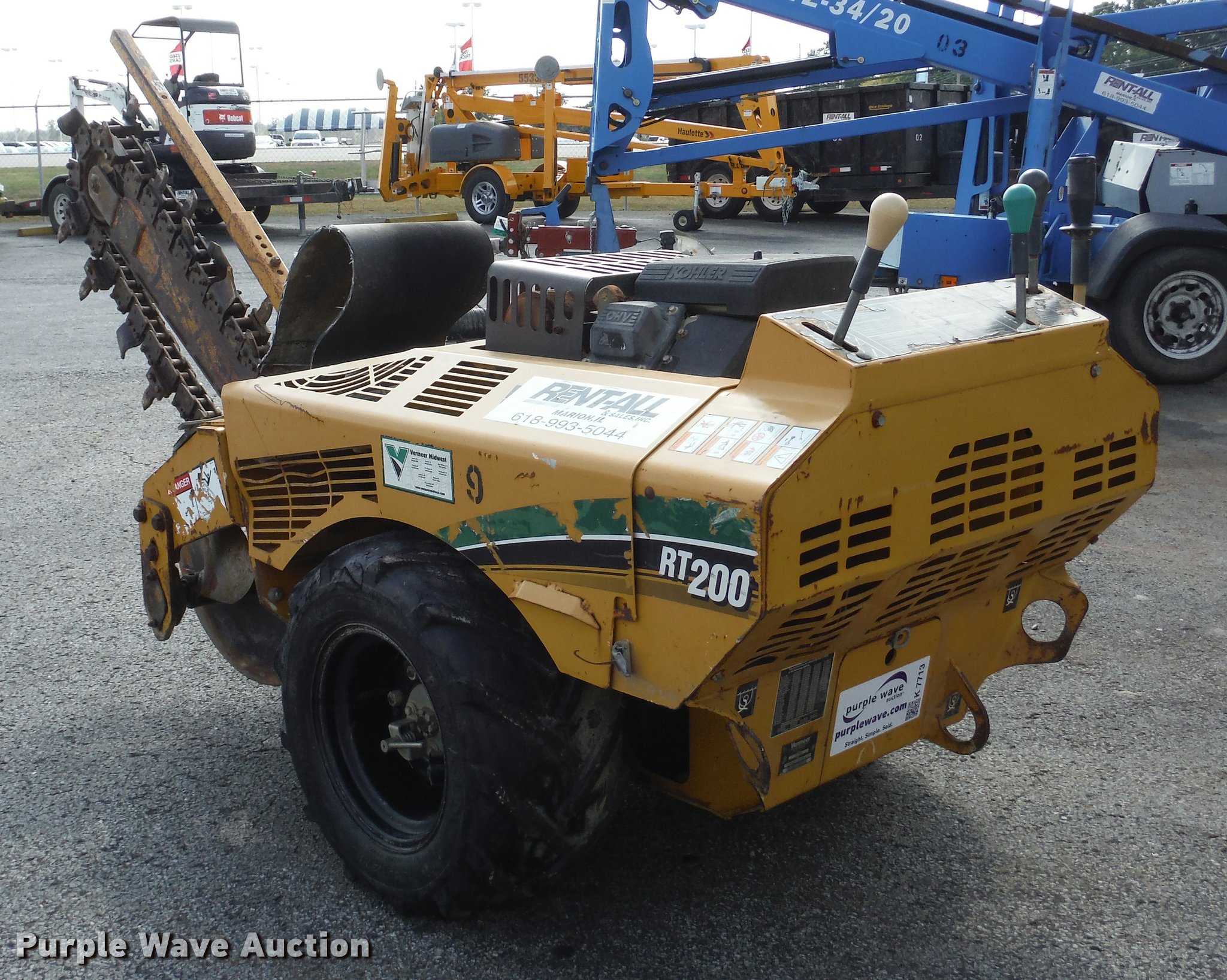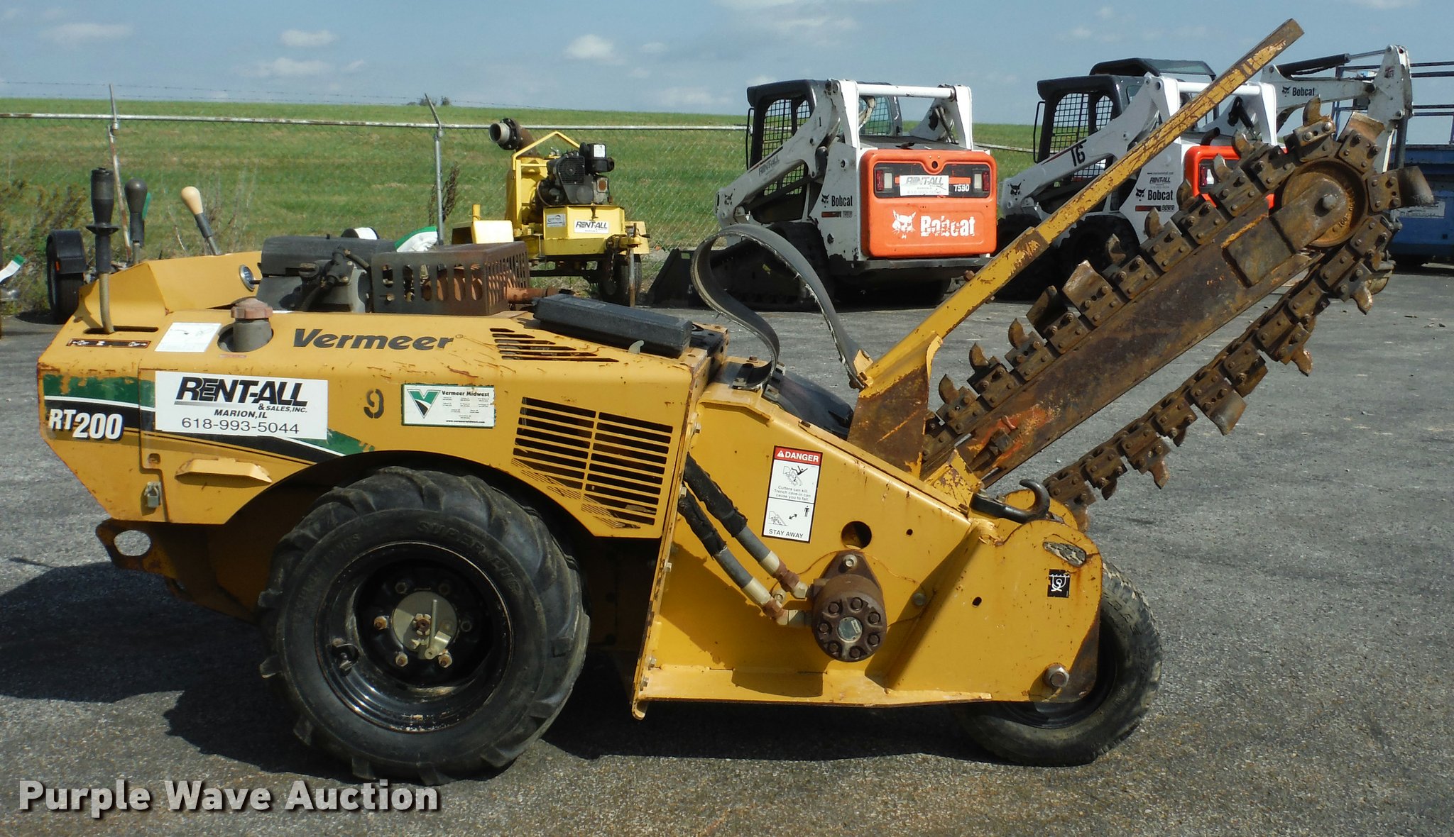 Purple Wave is selling a used Trencher or Rock Saw in Illinois. This item is a 2008 Vermeer RT200 trencher with the following: 71 hours on meter, Hour meter replaced at 620 hours, Kohler CH-23 two cylinder gas engine, 23 HP, Hydrostatic transmission, 36"L trencher boom, 6" cutting width, Rock and dirt chain, Restraint bar, 23 x 10.5-12 front tires, 16 x 7.5-8 rear tires, Serial 1VRX081F681001515