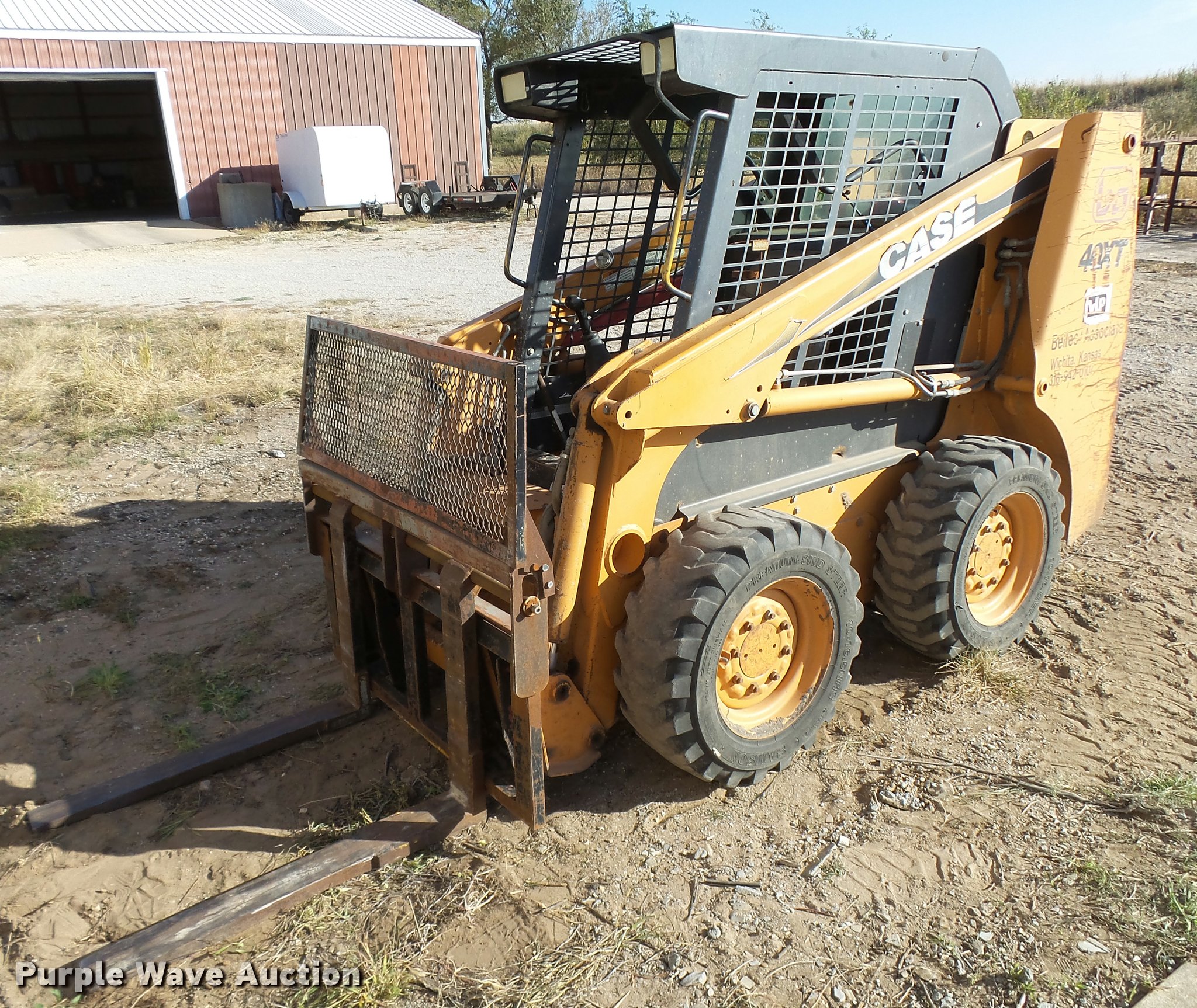 2002 Case 40XT skid steer. 5,422 hours on meter, Hour meter replaced at 2,775 hours on meter 5,422 total machine hours, Hours may vary, unit is still in use, Four cylinder diesel engine, Hydrostatic transmission, Open station/canopy Joystick controls, Spring suspension seat, Front and rear work lights, 65"W bucket, 36"L pallet forks, Front and rear work lights, 10-16.5 tires, Serial JAF0385062. Belles And Associates Retirement. 2148 S. Hoover Road. Wichita, KS 67277