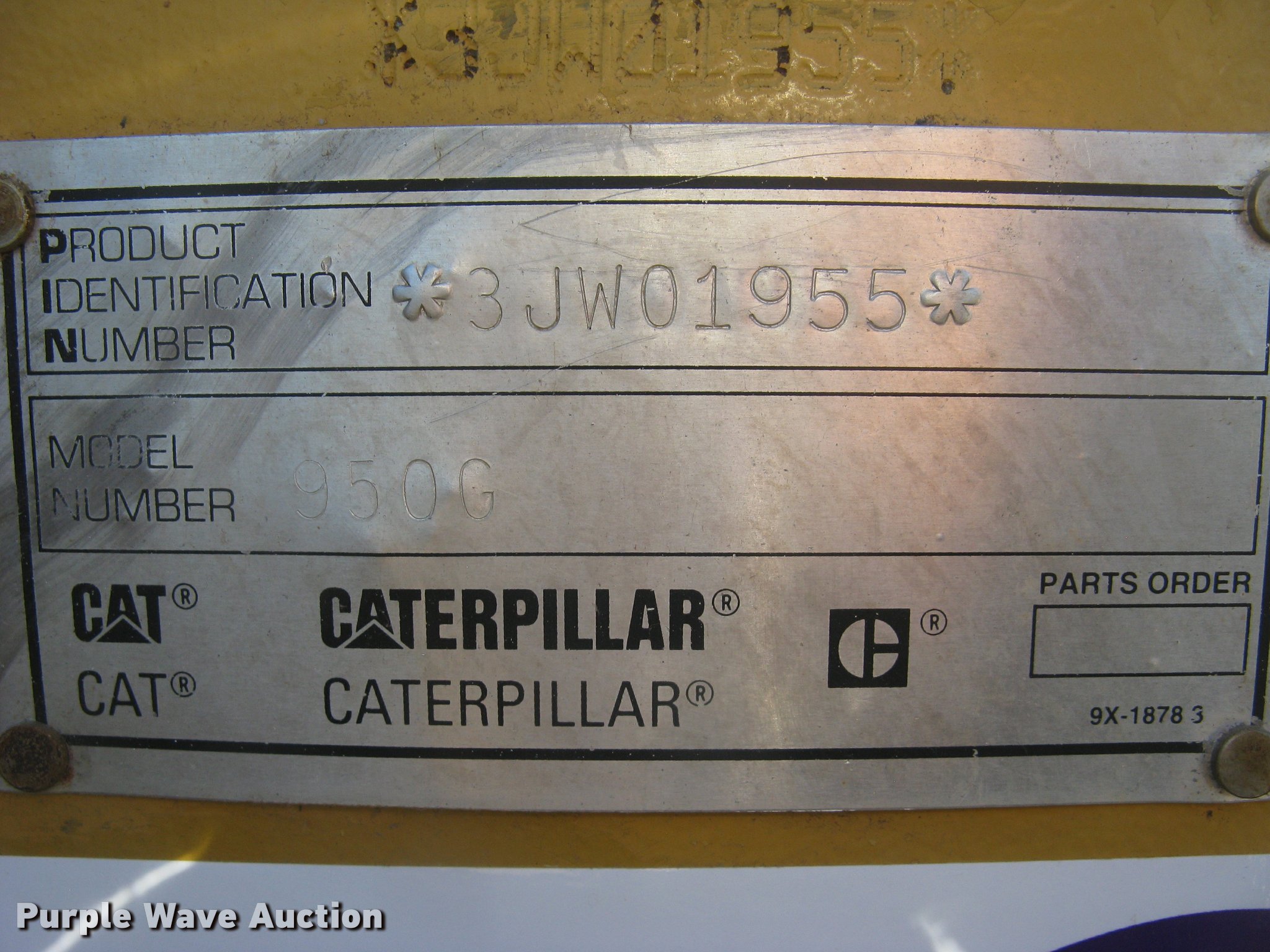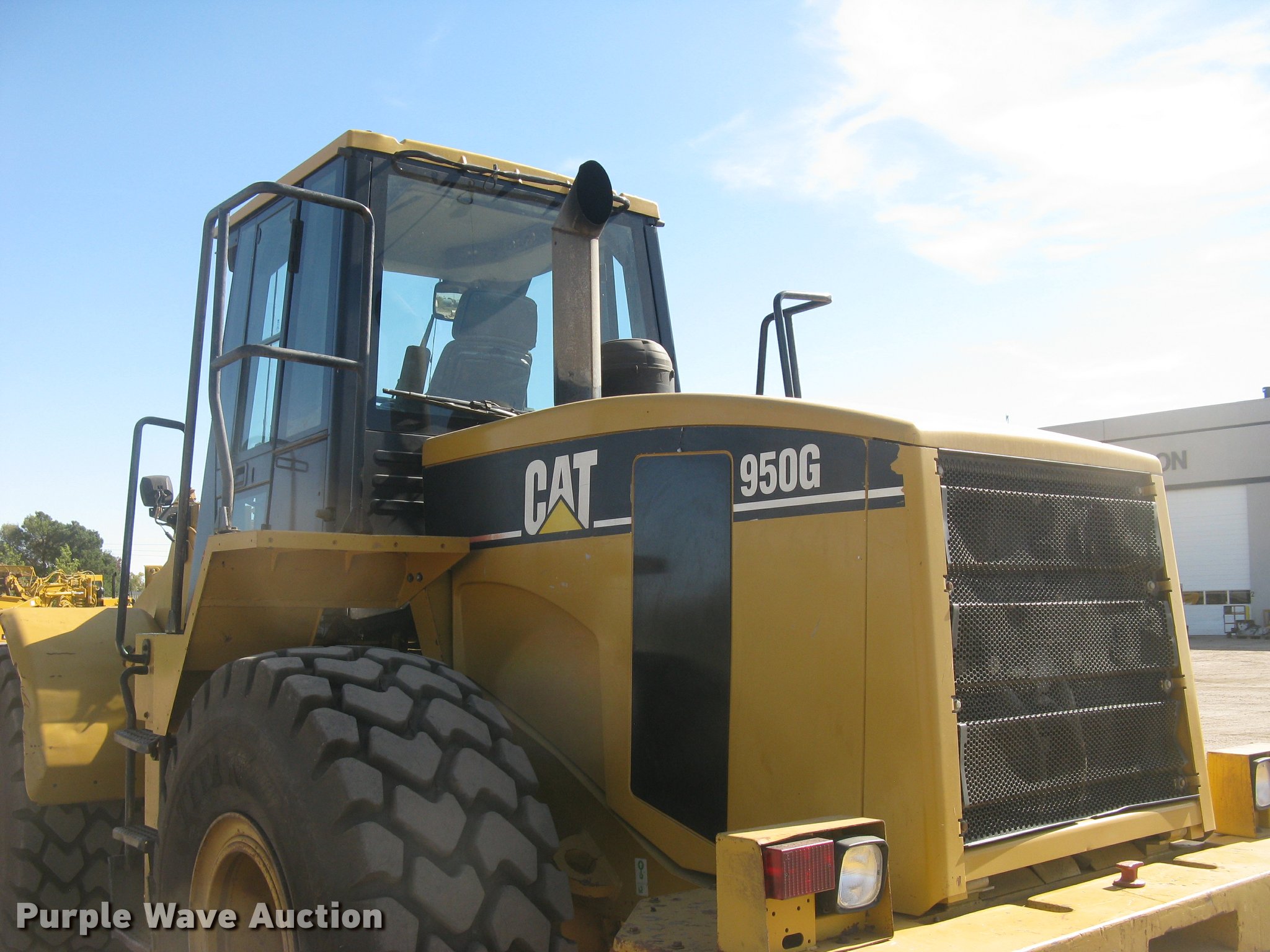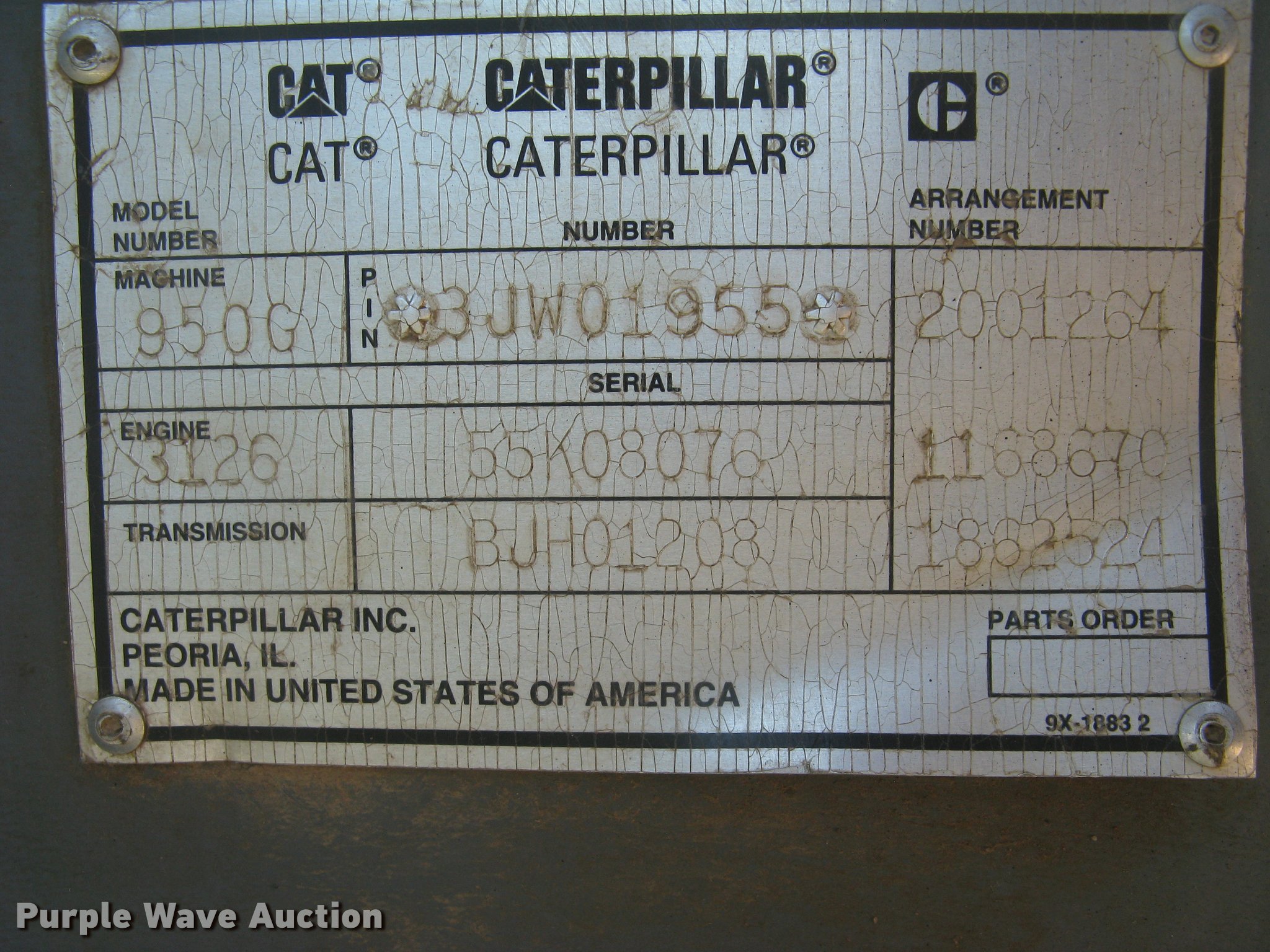 Purple Wave is selling a used Wheel Loader in Kansas. This item is a 2001 Caterpillar 950G wheel loader with the following: 13,153 hours on meter, Caterpillar 3126 7.2L six cylinder turbo diesel engine, 260 HP, Serial 55K08076, Powershift transmission, 4F-4R gears, EROPS, AC and heat, Tilt steering wheel, Air suspension seat, Two-lever bucket controls, Wipers, Backup alarm, 114"W general purpose bucket, Bolt-on cutting edge, Caterpillar pallet forks, 72"L x 7"W, 8'W carriage, Hydraulic quick coupler, Front auxiliary hydraulics, Counterweights, Power hood lift, Titan 23.5R25 tires, Transmission rebuilt March 2016, Serial 3JW01955, Unit# 46.64L
