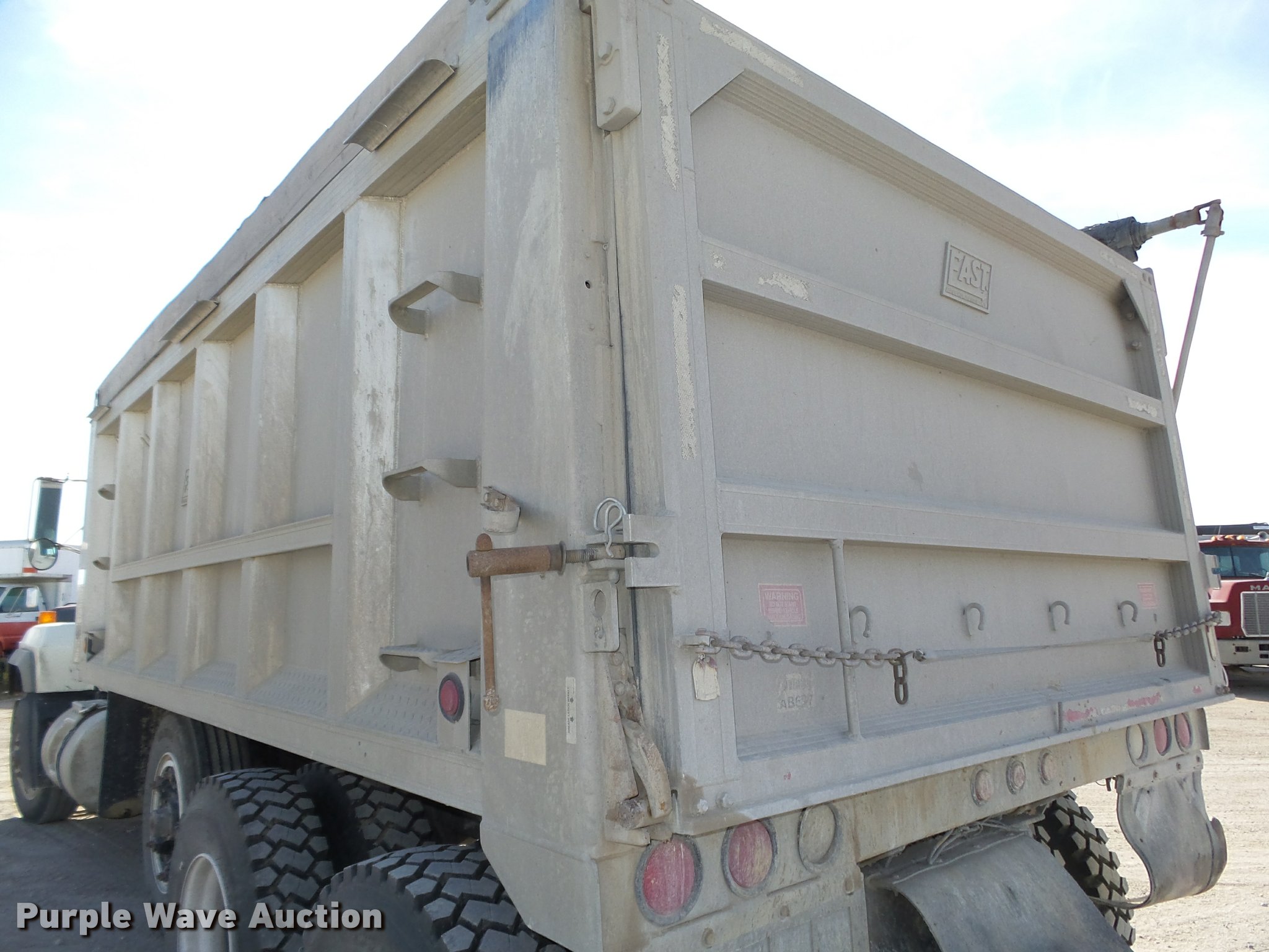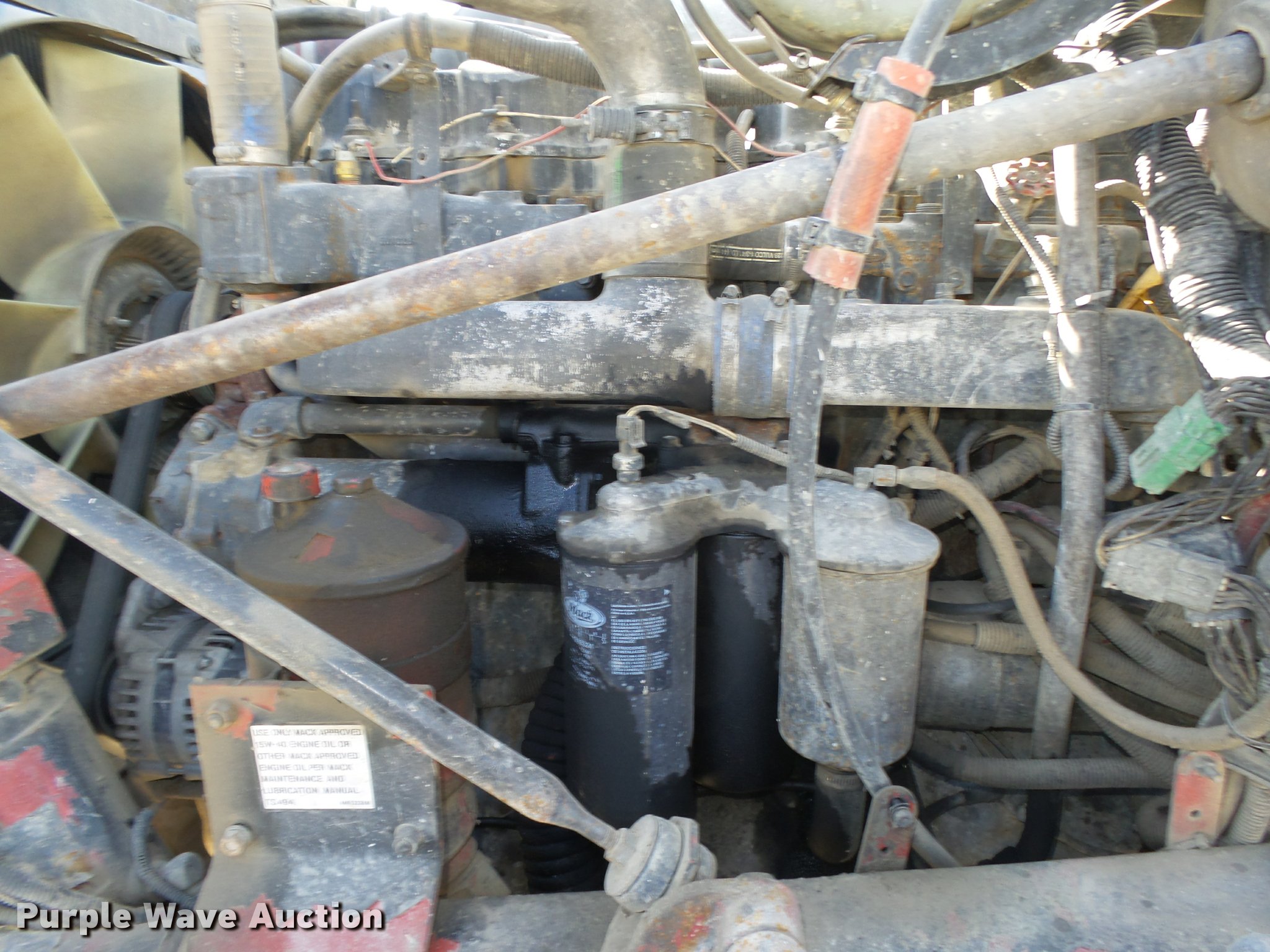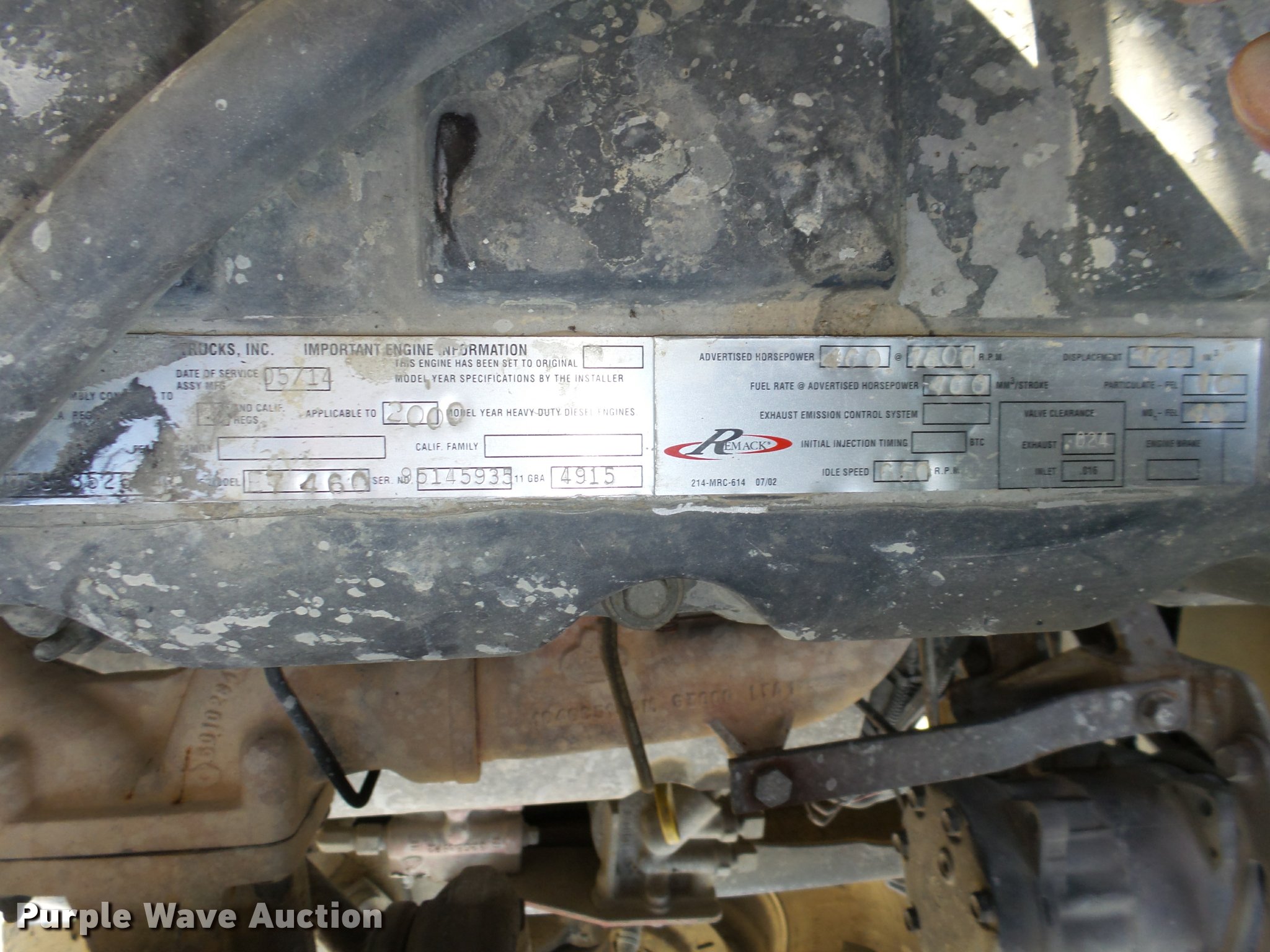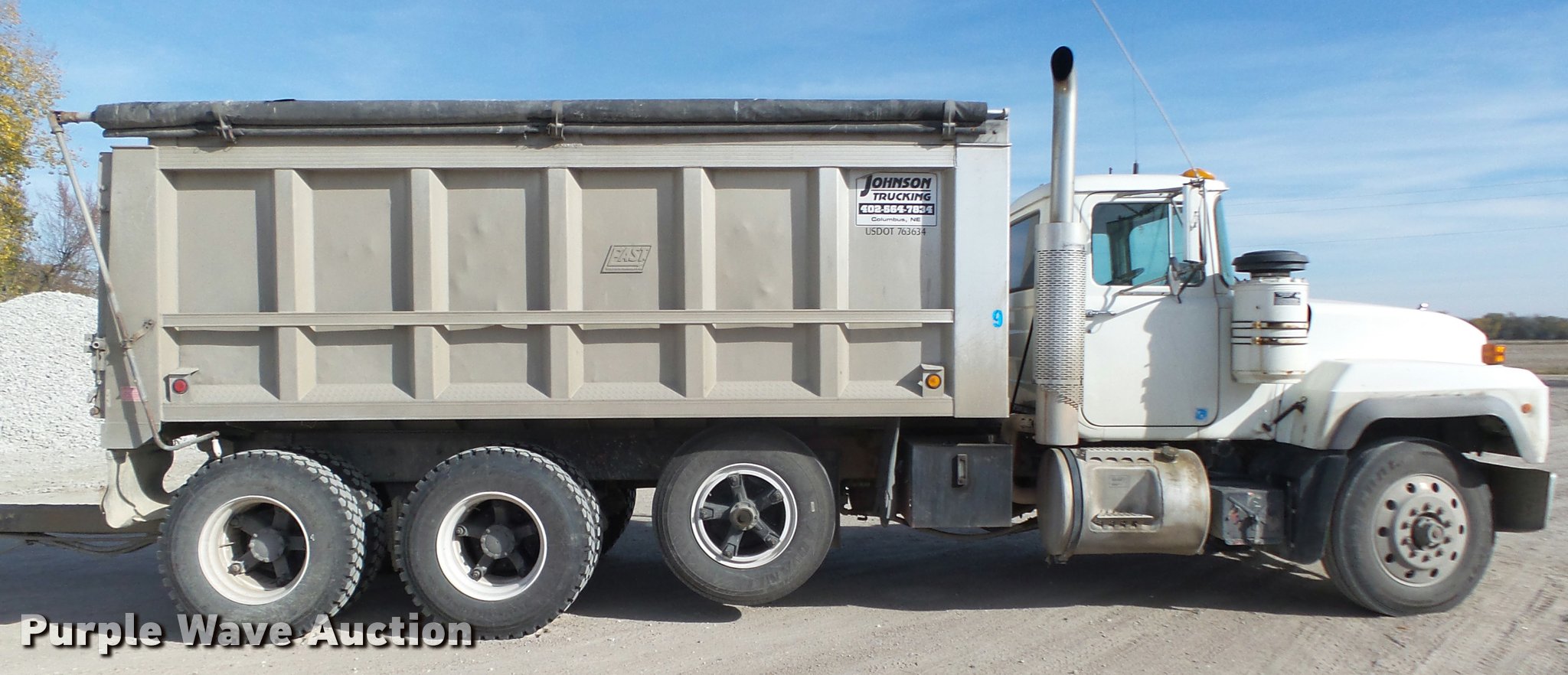 2000 Mack RD688S dump truck. 862,927 miles on odometer, 30,094 hours on meter Miles and hours may vary, unit is still in use, Mack E7 12.0L L6 turbo diesel engine 460 HP, Maxitorque T2130 13 speed manual transmission, Triple axle, Inter-axle differential lock, AC and heat, AM/FM, Heated mirrors, Air suspension seat, Cobra 29LTD Classic CB radio, Air ride cab, Backup alarm, Block heater, PTO, East aluminum dump bed 16'L x 96"W, 53" side height, 2" x 8" wood side boards, 113" from ground to top of sides, Single ram hoist, Rollover tarp, Air operated end gate, Serial AB637, Dual fuel tanks, Rear electric, hydraulic, and gladhand couplers, Single rear exhaust stack, Tow hooks, Pintle hitch, Trailer wiring, 228" wheelbase, Camelback suspension, Air brakes, Engine brake, Aluminum front wheels, 285/75R24.5 front tires, 11R22.5 air lift pusher axle tires, 11R22.5 rear tires, Remanufactured engine installed June 2014, Remanufactured transmission installed June 2015, Seat torn, Windshield cracked, Trailer is not included, Unit# 9. View repairs. Nebraska title. 1M2P324C5YM052990. Johnson Trucking Sand & Gravel. 3163 S. 16th Street. Columbus, NE 68601
