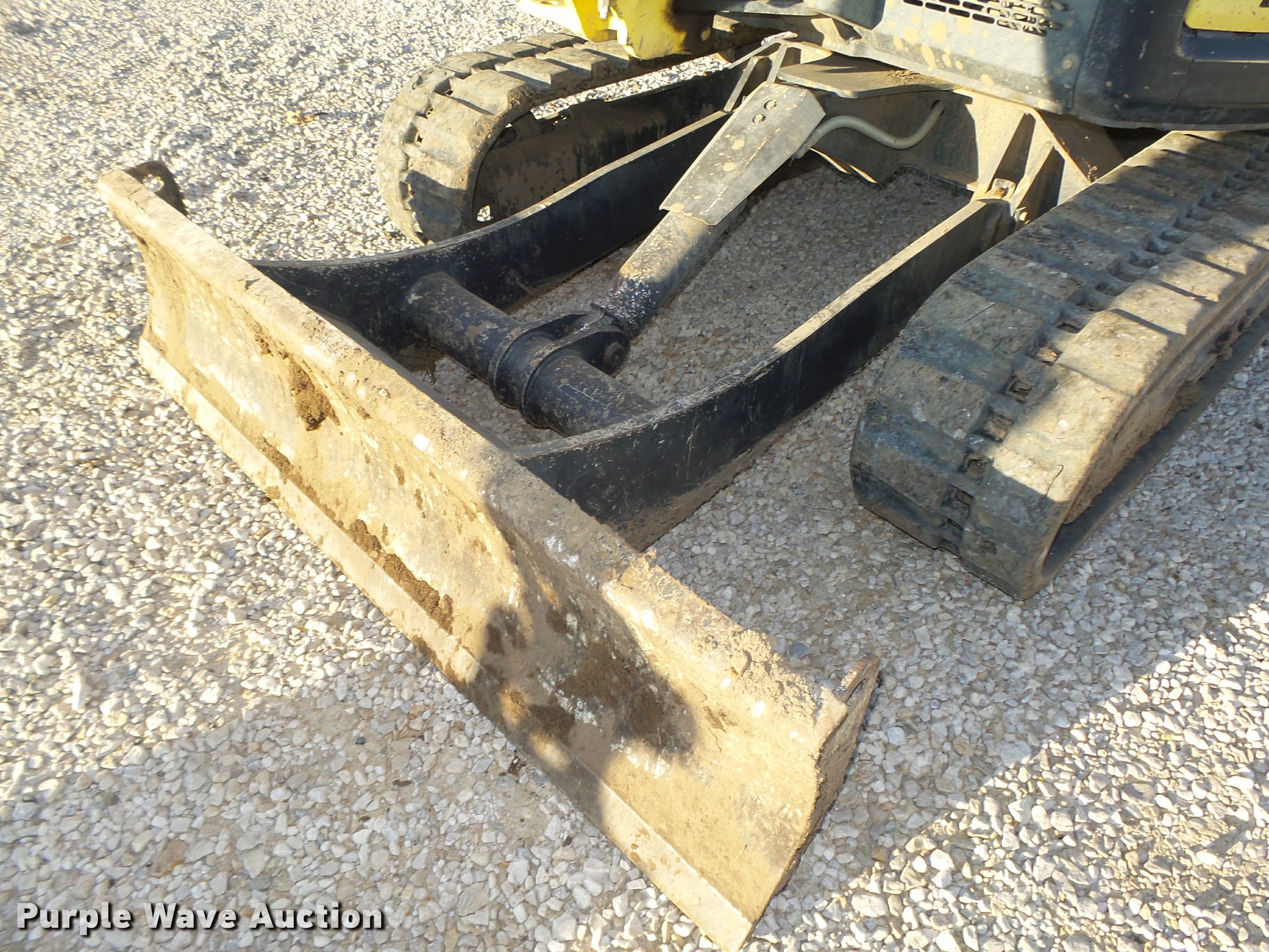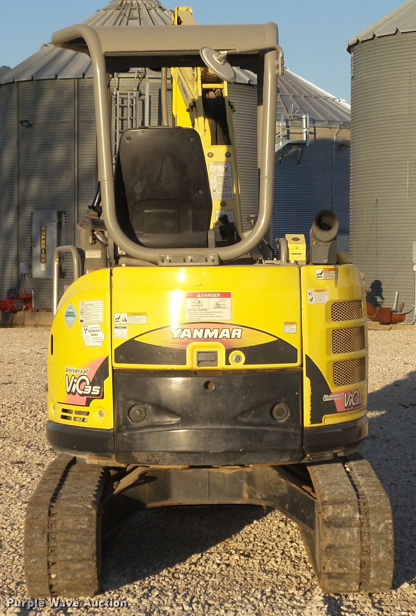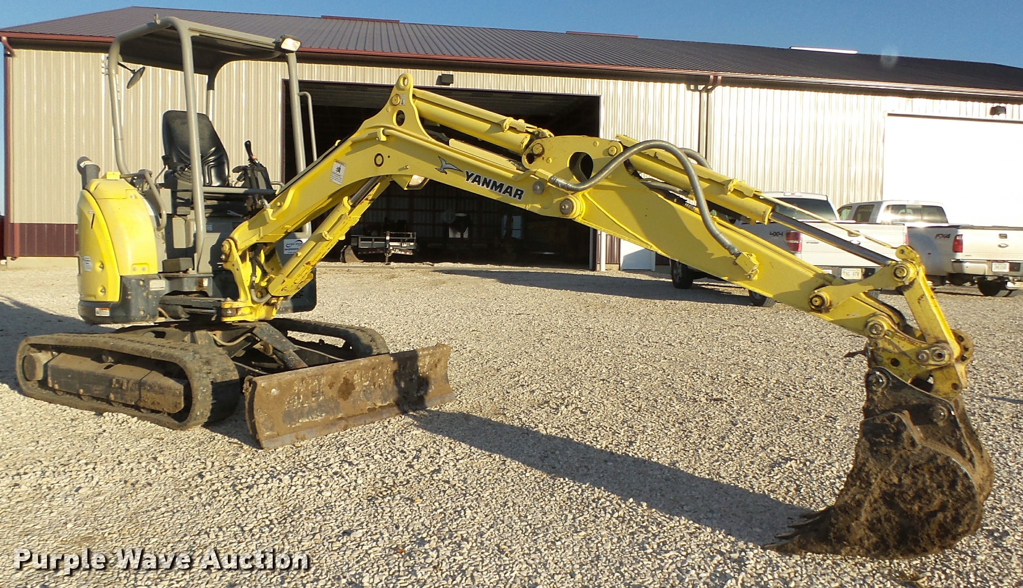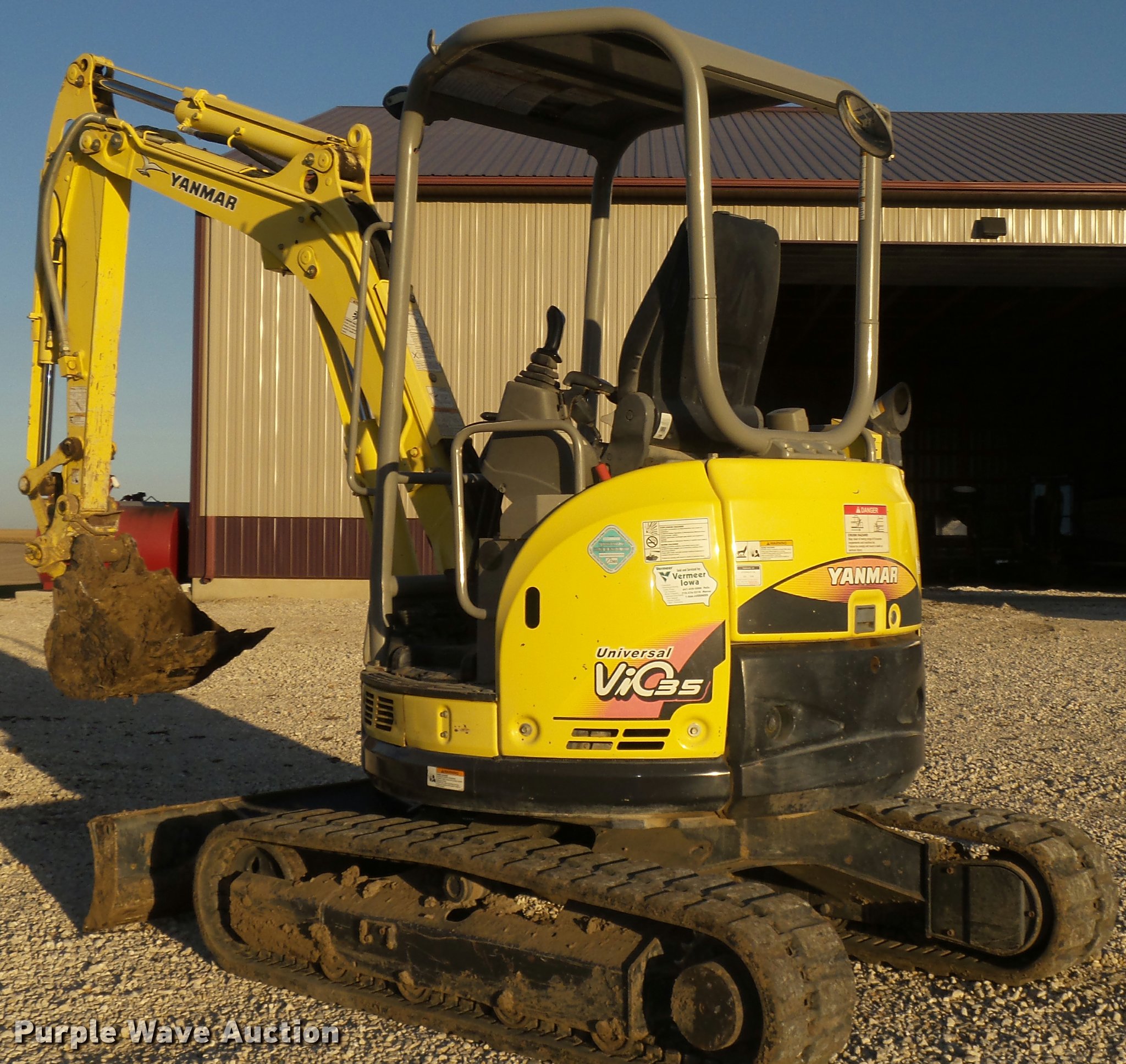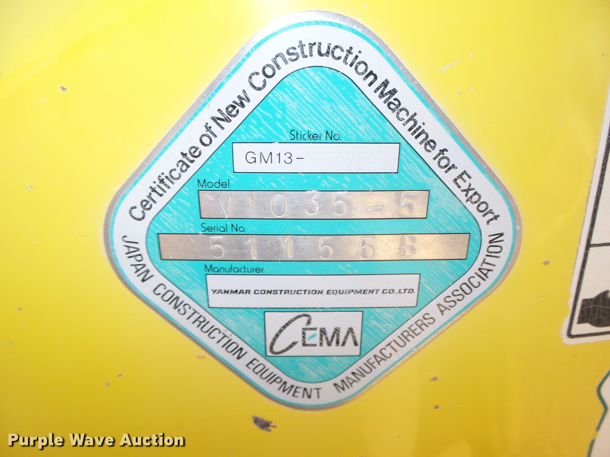 Purple Wave is selling a used Mini Excavator in Iowa. This item is a 2007 Yanmar VI035-5 mini excavator with the following: 1,556 hours on meter, Hours may vary, still in use, Yanmar three cylinder diesel engine, 28.1 HP, Serial 61384, Two speed hydrostatic transmission, OROPS, Serial 620645, Suspension seat, Pattern changer, Front work lights, Backup alarm, Travel alarm, 61"W backfill blade, Standard boom, 53" stick length, Two-way auxiliary hydraulics, Plumbed and capped off, Hydraulic quick coupler, 11' digging depth, Yanmar 18"W bucket, Zero tail swing, Four bottom rollers, 12"W rubber tracks, 7,850 lbs. base operating weight, Serial YMRVI035C7YY51155B, Unit# 5155B