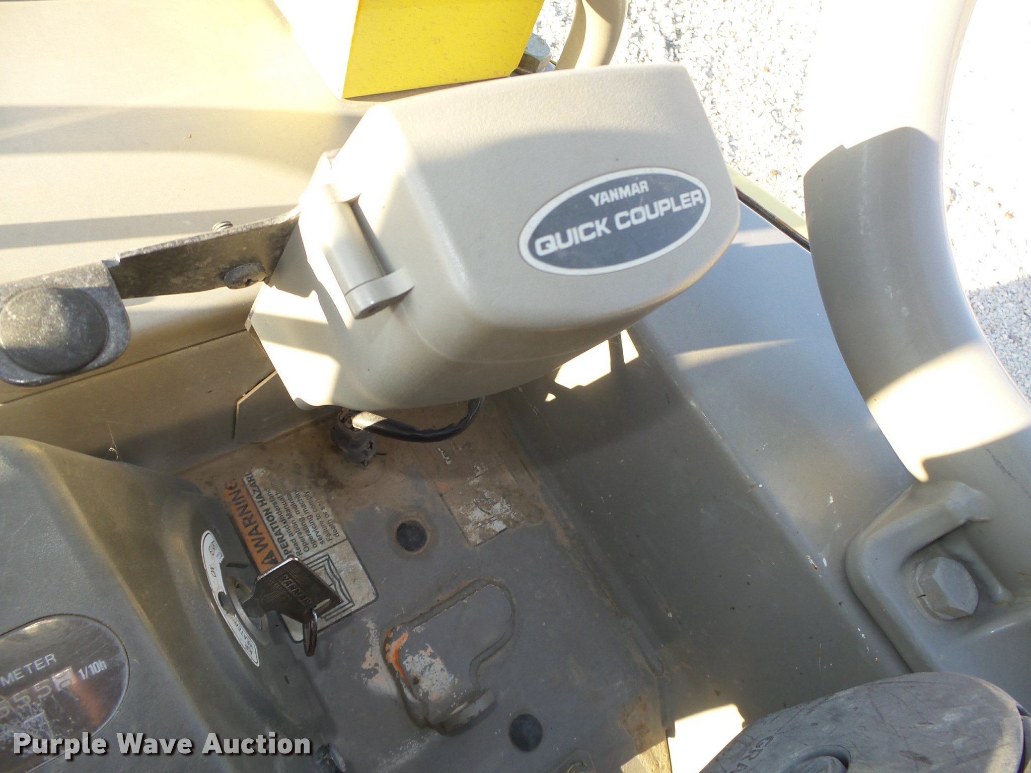 2007 Yanmar VI035-5 mini excavator. 1,556 hours on meter Hours may vary, still in use, Yanmar three cylinder diesel engine 28.1 HP, Serial 61384, Two speed hydrostatic transmission, OROPS Serial 620645, Suspension seat, Pattern changer, Front work lights, Backup alarm, Travel alarm, 61"W backfill blade, Standard boom, 53" stick length, Two-way auxiliary hydraulics Plumbed and capped off, Hydraulic quick coupler, 11' digging depth, Yanmar 18"W bucket, Zero tail swing, Four bottom rollers, 12"W rubber tracks, 7,850 lbs. base operating weight, Serial YMRVI035C7YY51155B, Unit# 5155B. Barrys Electric. 11234 L22. Remsen, IA 51050