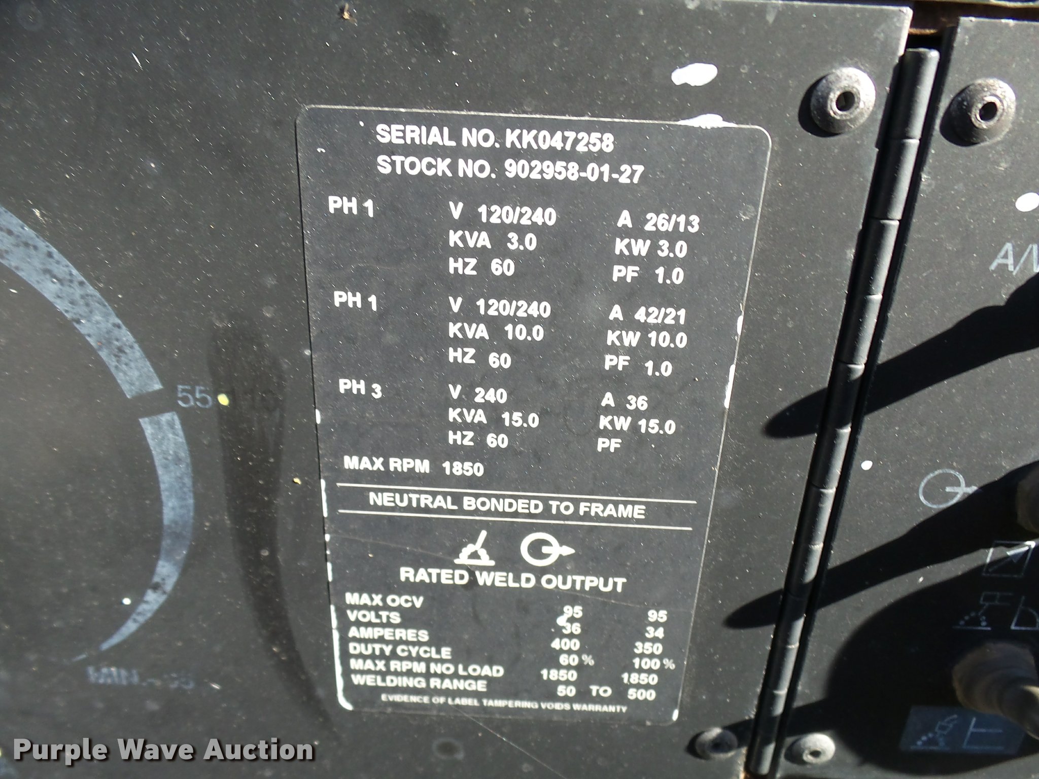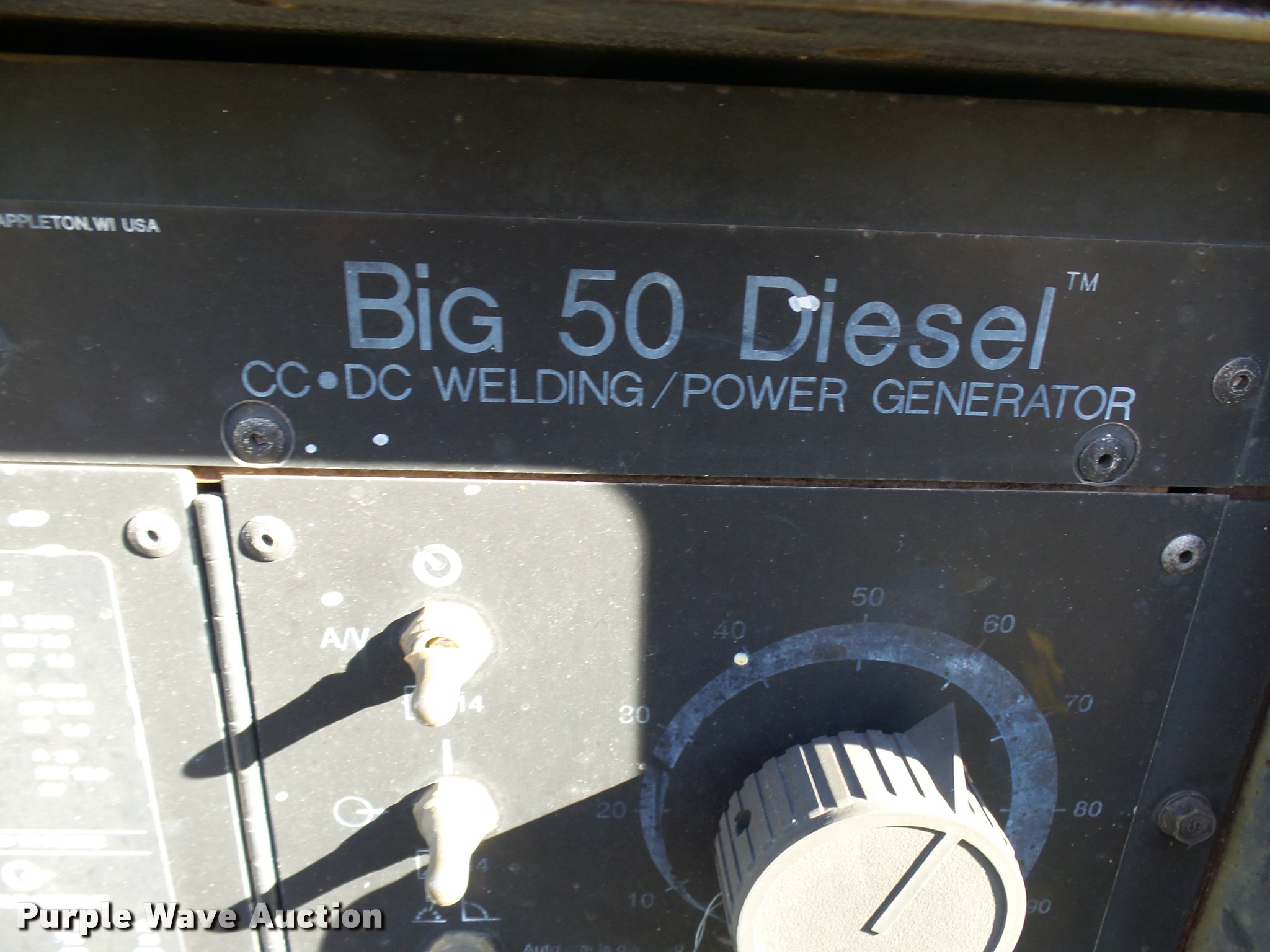 Purple Wave is selling a used Welder (Manual) in Missouri. This item is a Miller Big 50 welder/generator with the following: 1,993 hours on meter, Continental TMD27 four cylinder diesel engine, Serial 99020031, (4) 110V outlets, 240V outlet, Lifting eye, Tongue mounted jack stand, Pin hitch, 175/80R13 tires, Serial KK047258