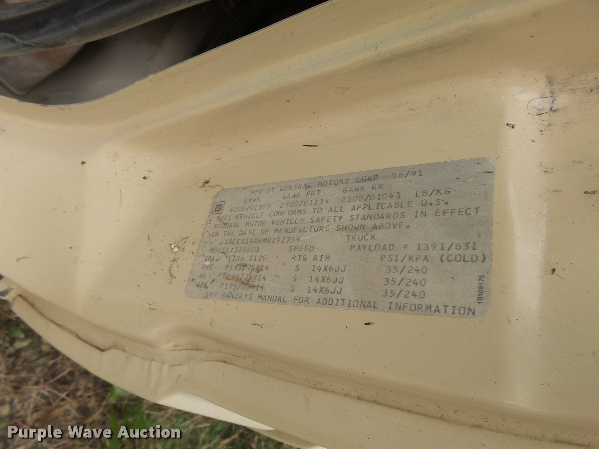 Purple Wave is selling a used Compact Pickup or Van in Kansas. This item is a 1991 Chevrolet S10 pickup truck with the following: 133,265 miles on odometer, 2.5L L4 OHV 8V gas engine, Automatic transmission, Heat, Manual windows and locks, Vinyl interior, 195/75R14 tires, Engine oil leaks, Stereo removed, Rust, Unit turns over, but will not start