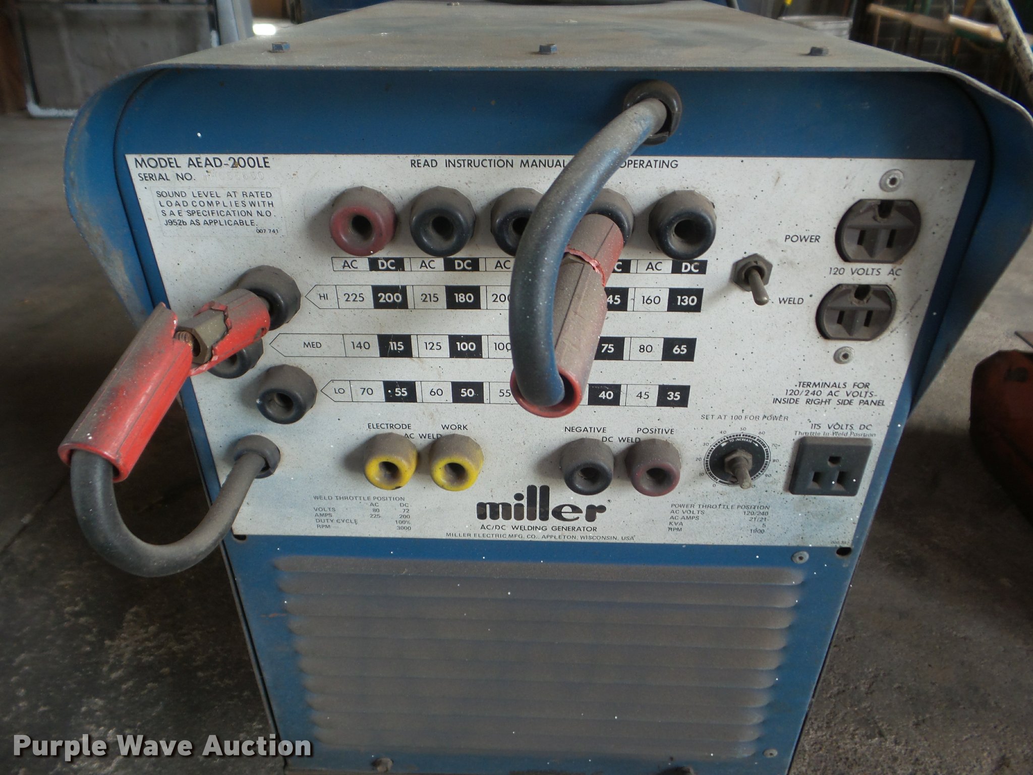 Purple Wave is selling a used Welder (Manual) in Kansas. This item is a Miller 200LE arc welder/generator with the following: AC/DC, Leads, 120V outlet, Non-operational generator