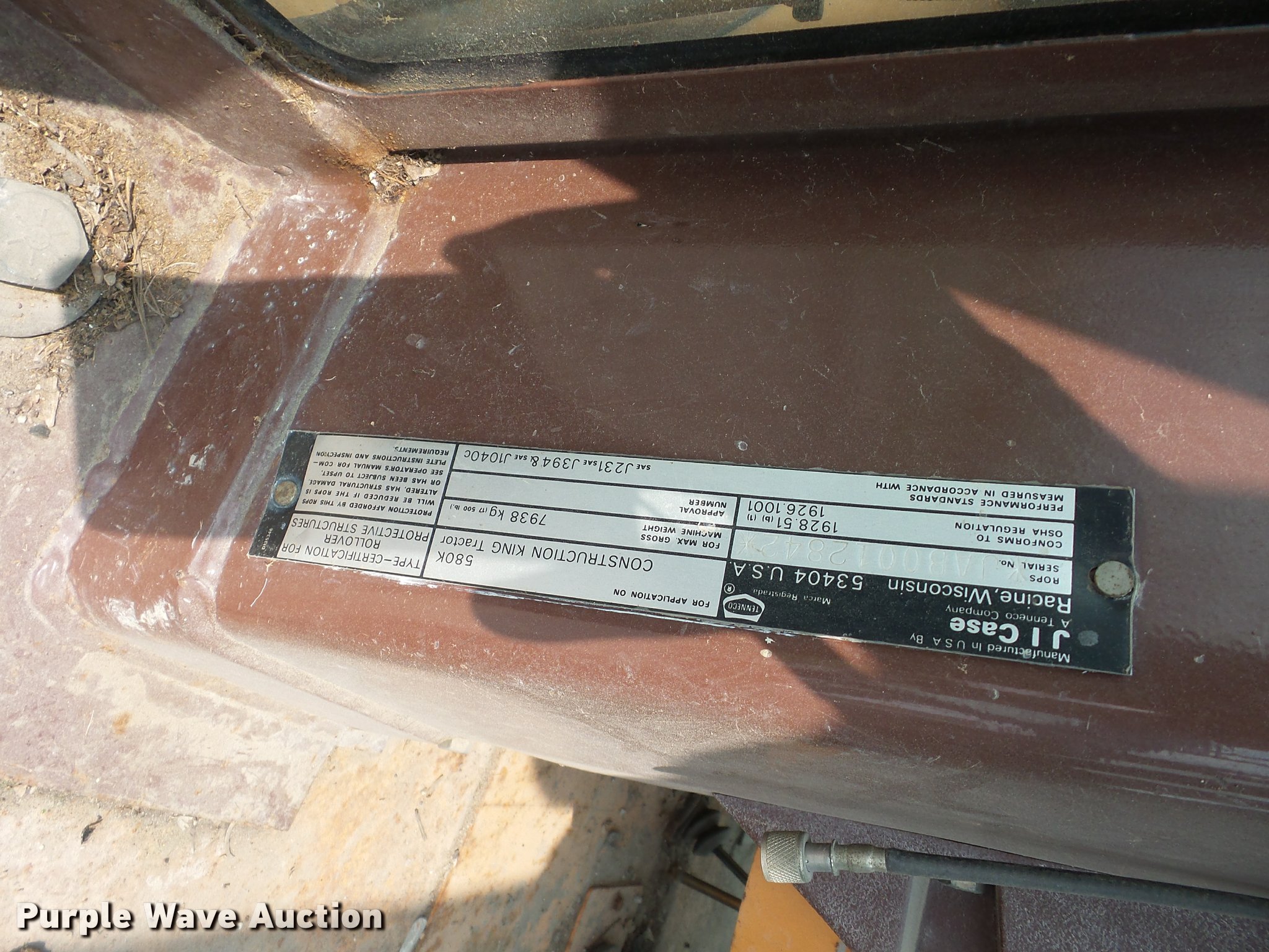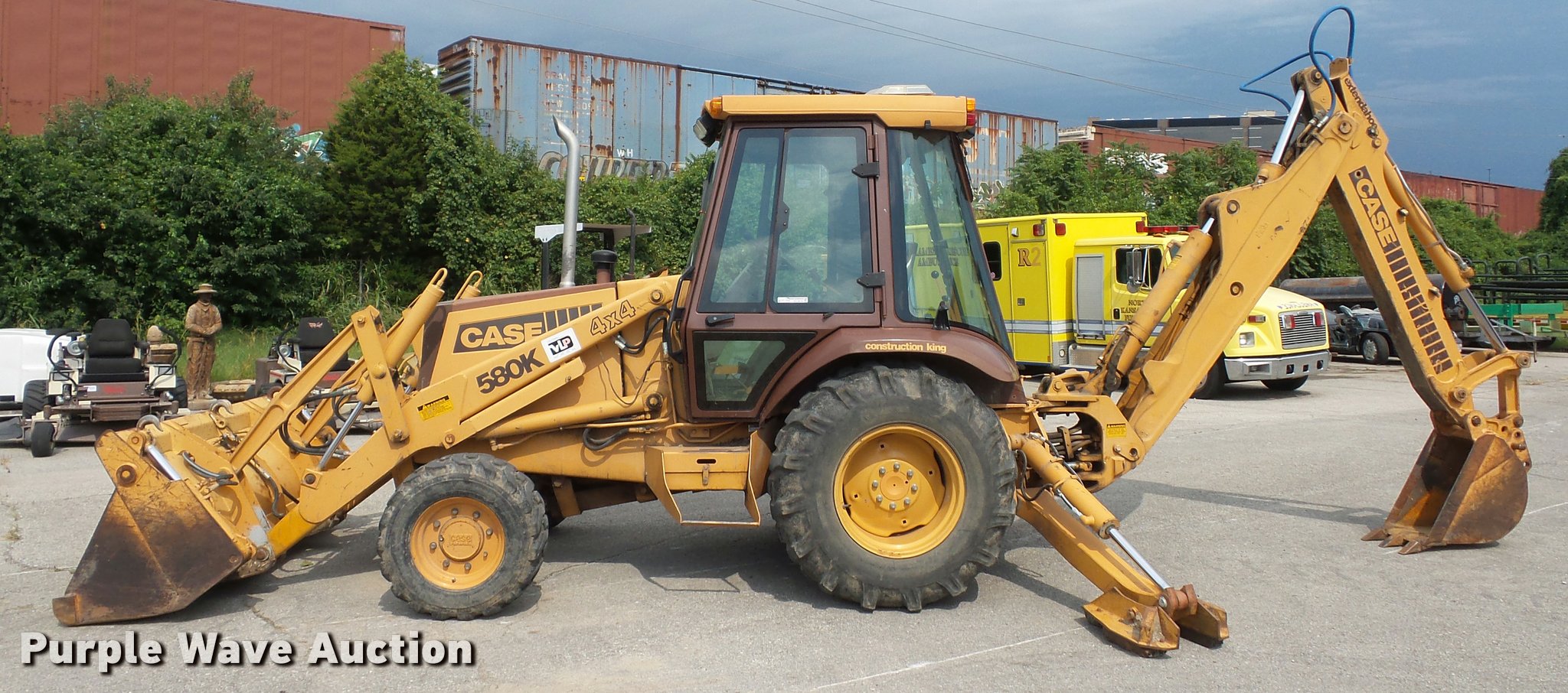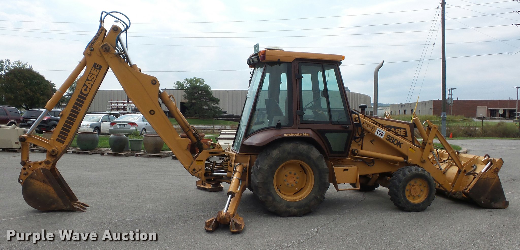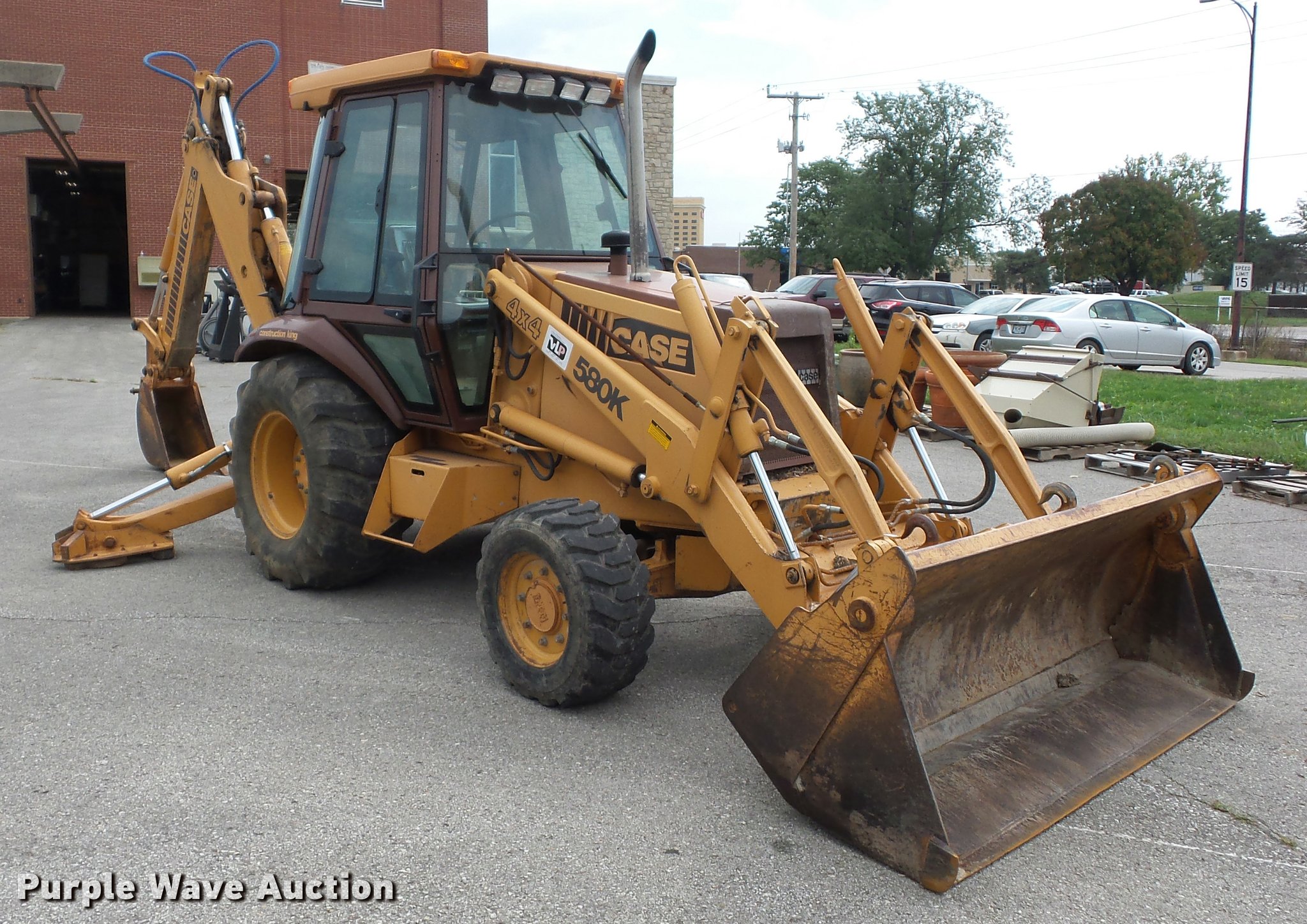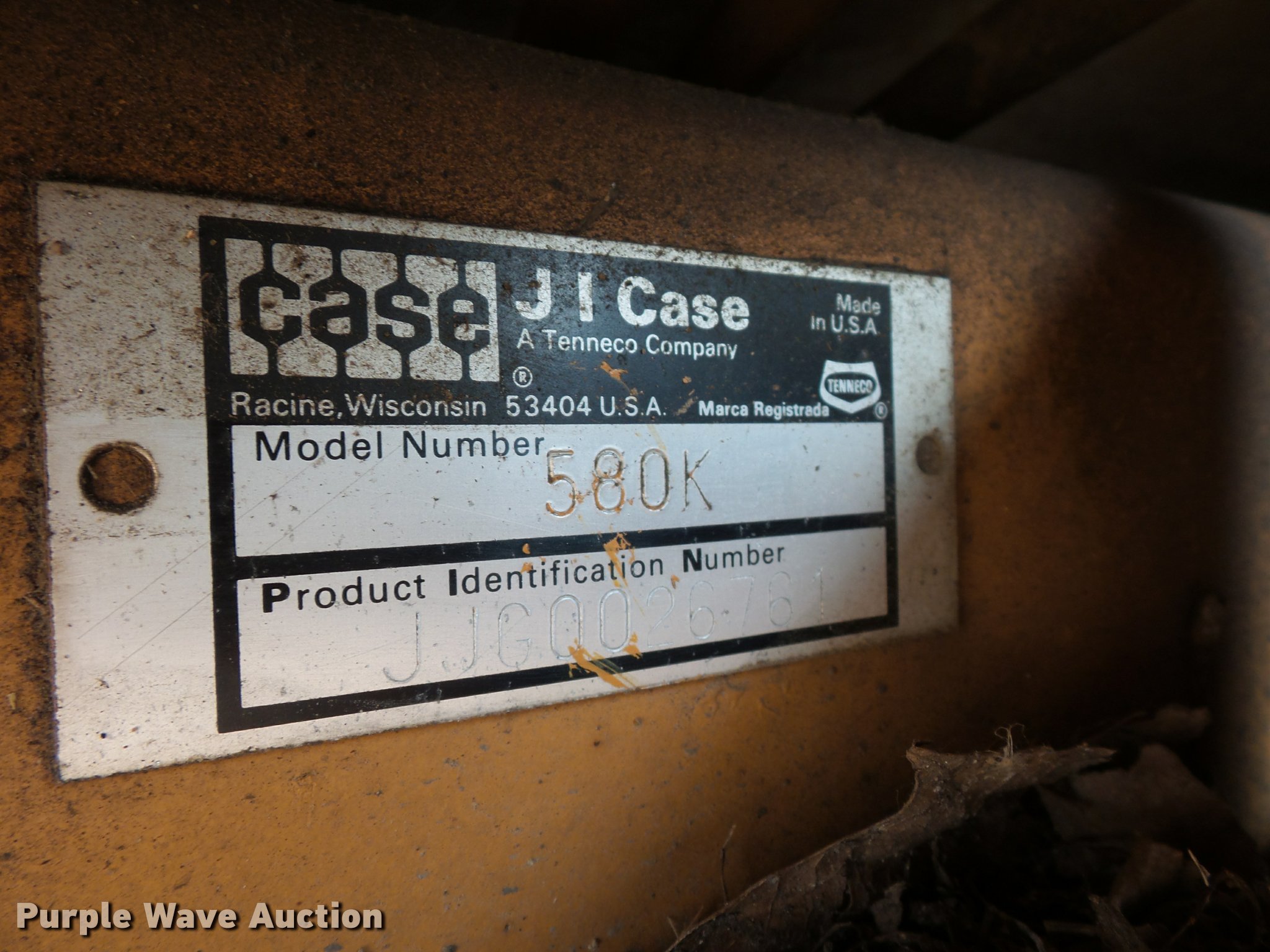 Purple Wave is selling a used Tractor Loader Backhoe in Missouri. This item is a Case 580K backhoe with the following: 3,323 hours on meter, Four cylinder turbo diesel engine, Shuttle shift transmission, 4F-4R gears, Four wheel drive, EROPS, Heat, Wobble stick backhoe controls, Front and rear work lights, 82"W loader bucket, E-stick, 16"W backhoe bucket, 12-16.5 front tires, 16.5-24 rear tires, Serial JJG0026761
