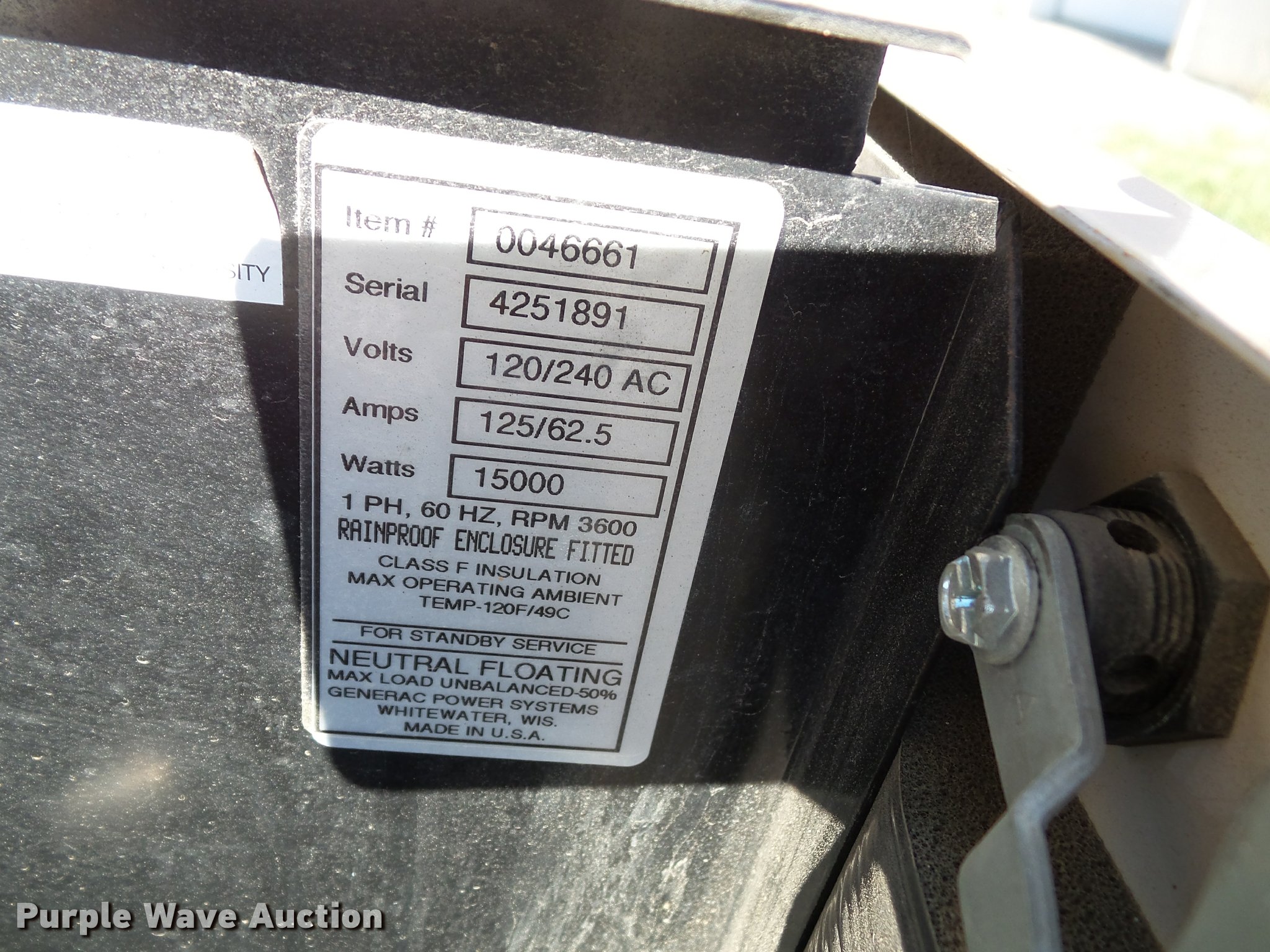 Purple Wave is selling a used Generator Set in Kansas. This item is a Generac Centurion generator with the following: Natural gas or propane fired, 15,000 watts, Single phase, Transfer switch needs to be replaced, Serial 4251891