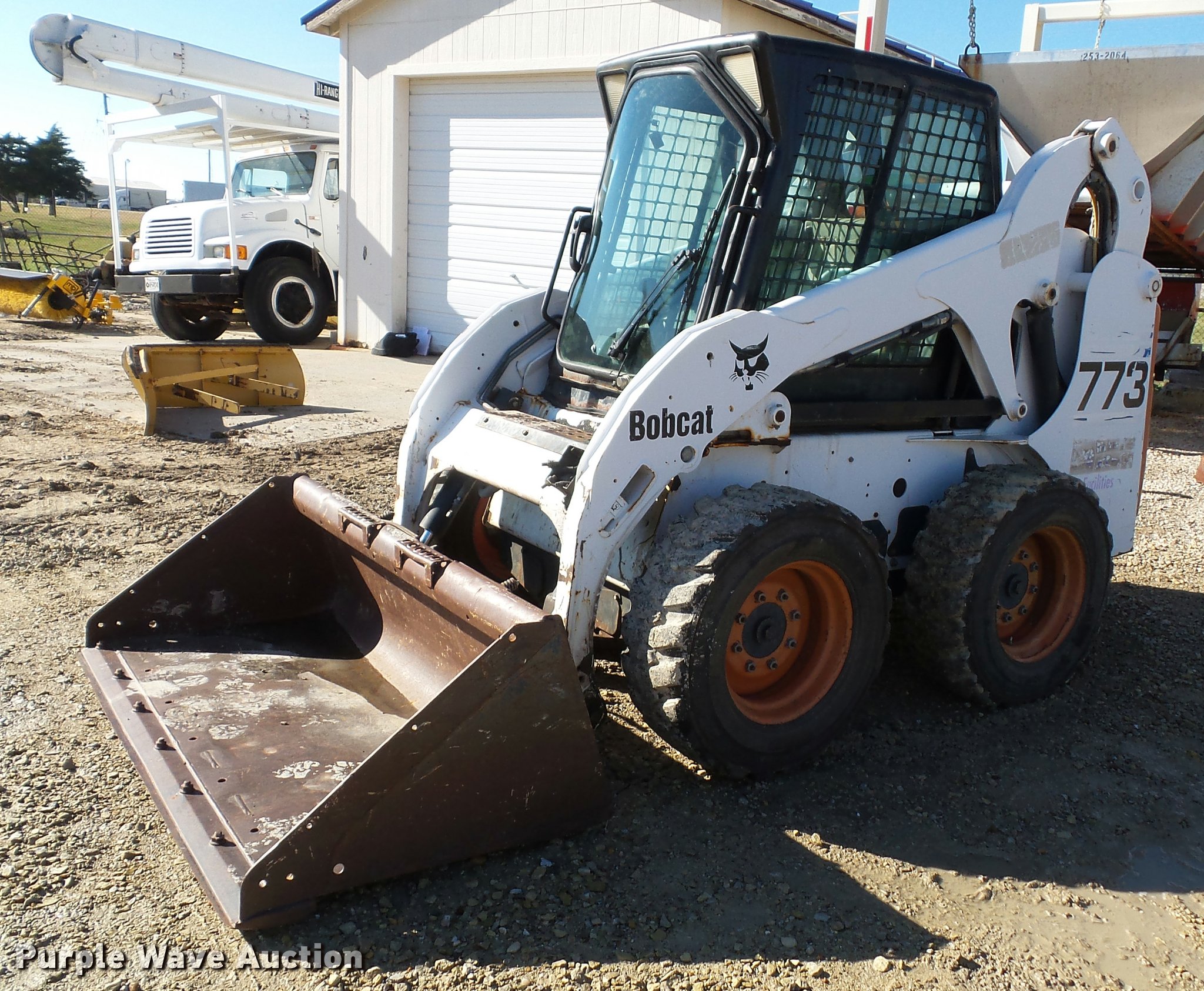 Purple Wave is selling a used Skid Steer Loader in Kansas. This item is a 2001 Bobcat 773 skid steer with the following: 1,887 hours on meter, Kubota V2203-E 2.2L diesel engine, 36.1 kW, Serial 0YW3491, Hydrostatic transmission, Enclosed cab, Heat, Hand and foot controls, Front work lights, Backup alarm, Block heater, Auxiliary hydraulics, 67"W bucket, Weld-on cutting edge, Titan 10-16.5 tires, Serial 517619143