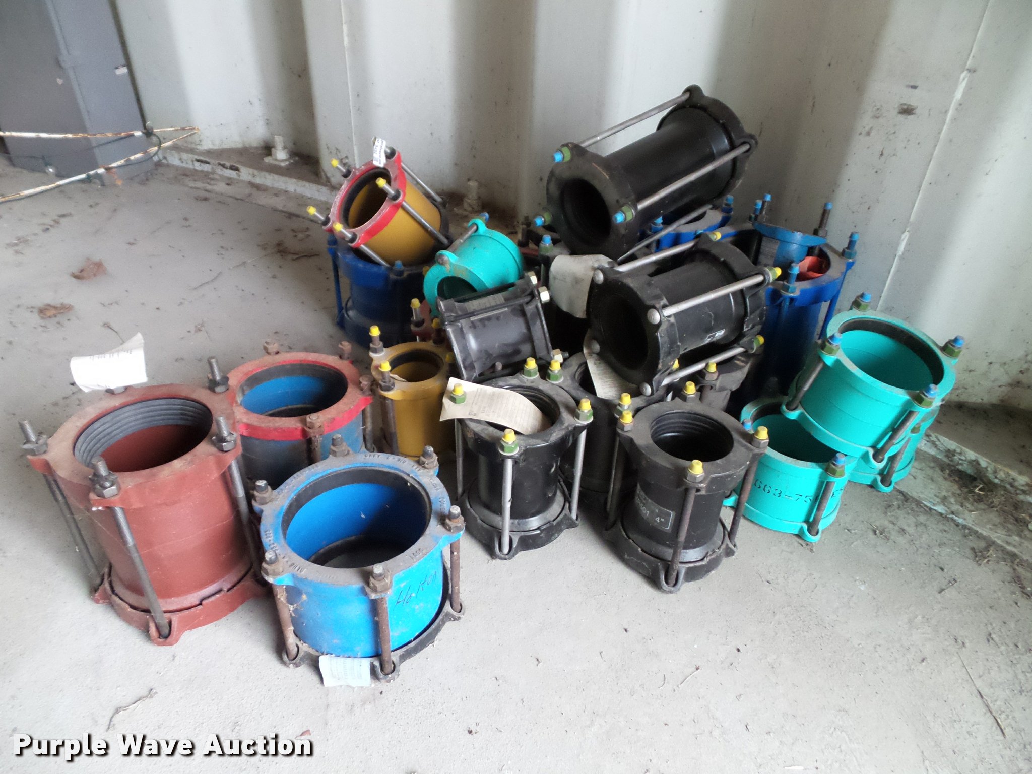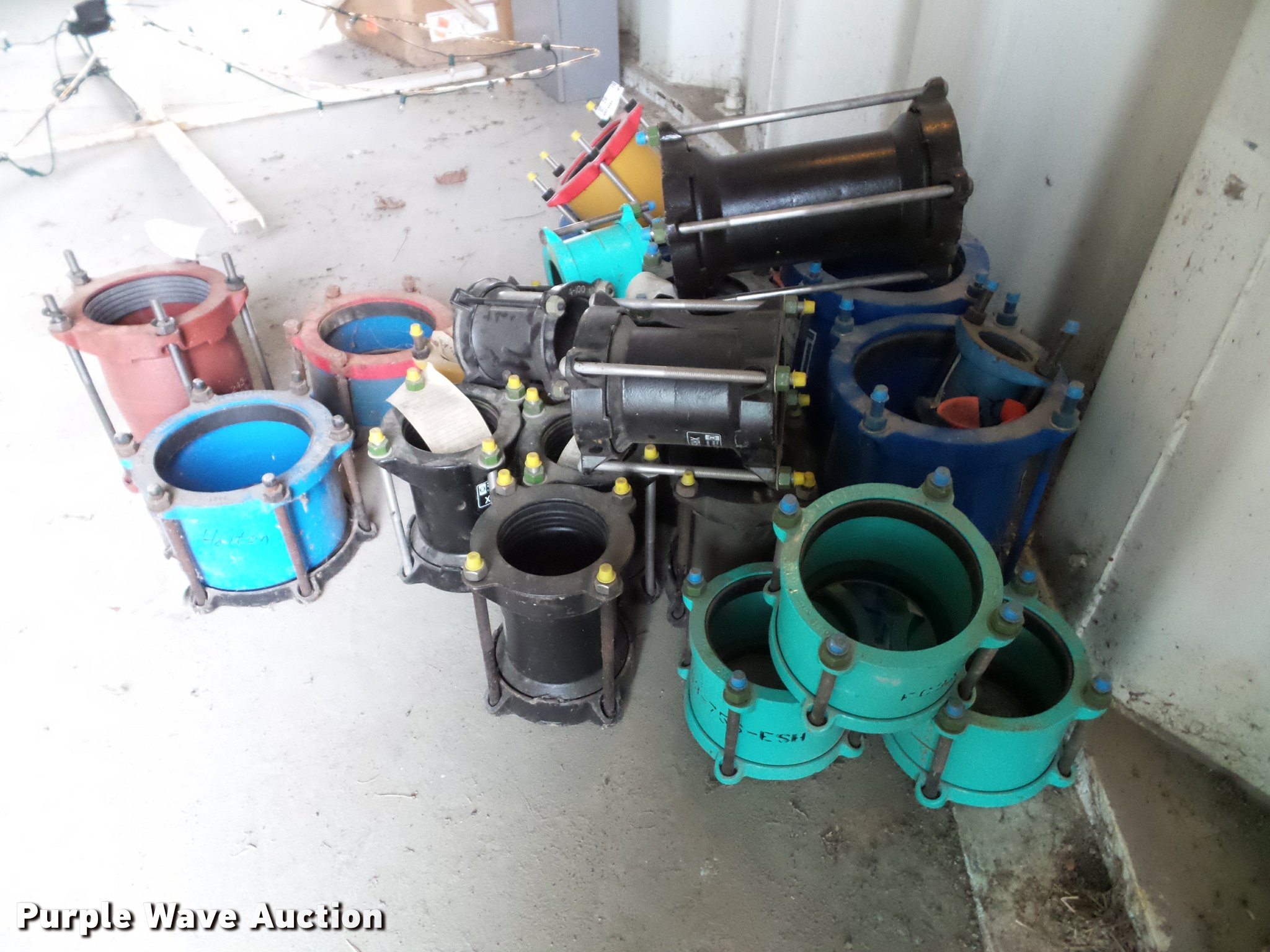 Purple Wave is selling a used Pipe in Kansas. This item is a Approximately 25 water main couplers with the following: 2.5", 4", 8"