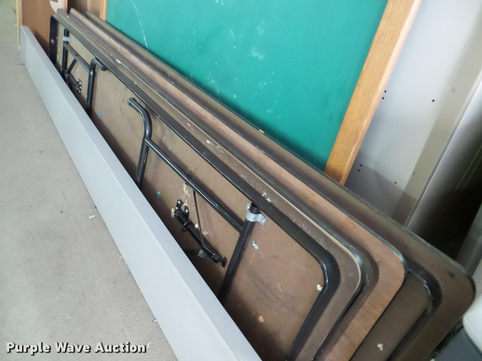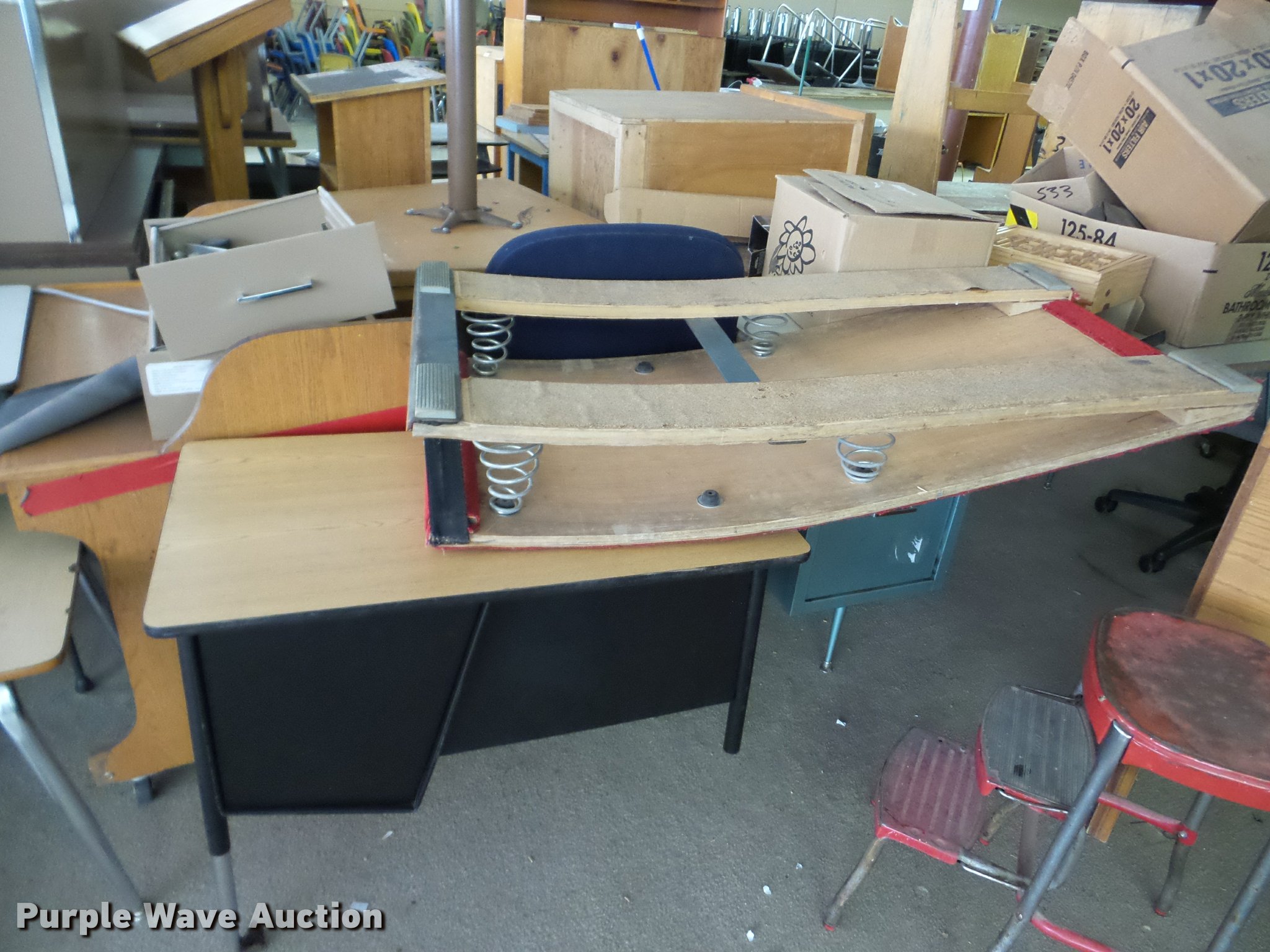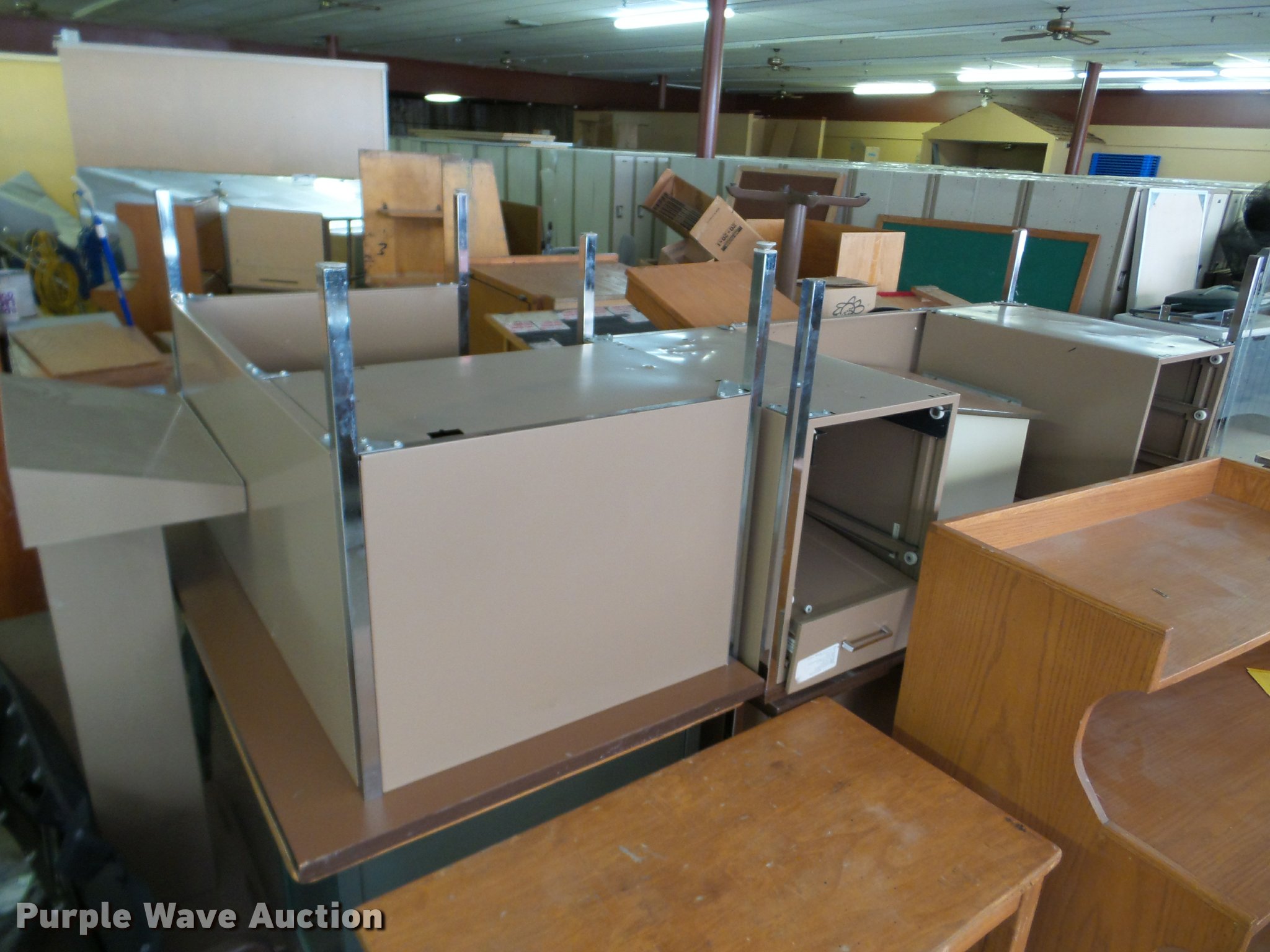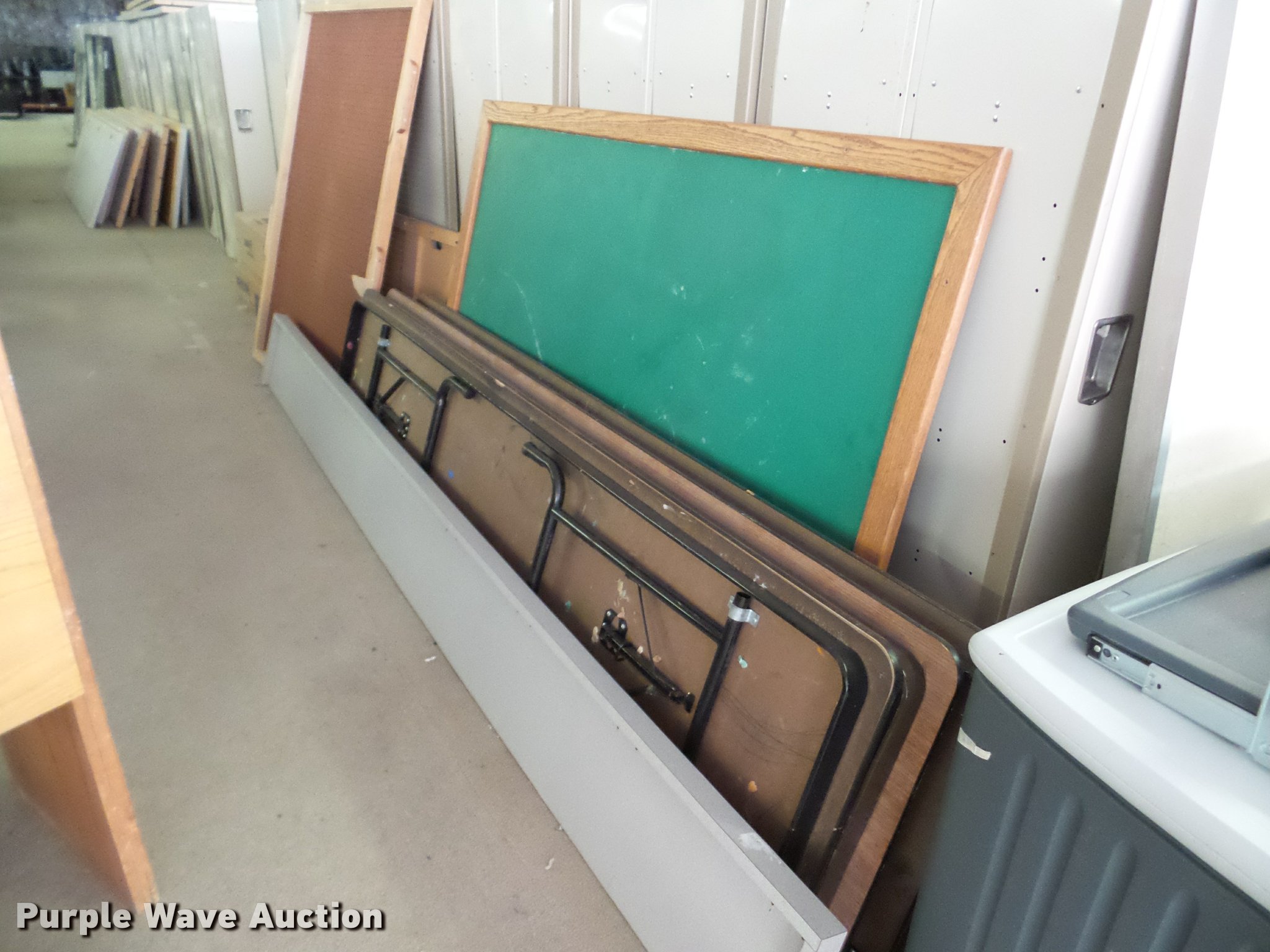 Purple Wave is selling a used Office Supplies and Equip. in Kansas. This item is a Office supplies with the following: Approximately 10 desks, Cabinets, Approximately 15 wood desk tops, Chalk board, (3) wood folding tables, (3) podiums