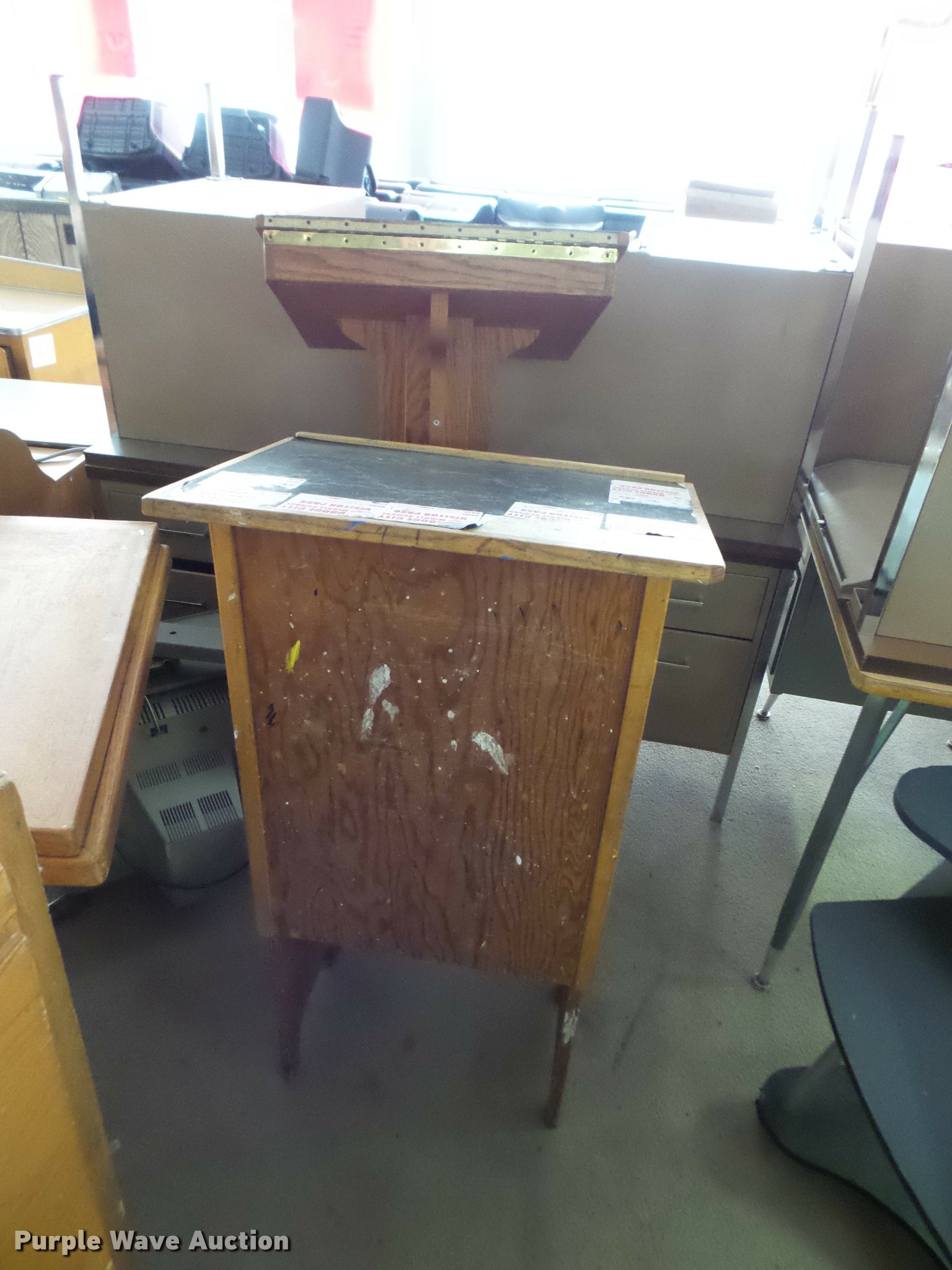 Office supplies. Approximately 10 desks, Cabinets, Approximately 15 wood desk tops, Chalk board, (3) wood folding tables, (3) podiums. USD 443. Dodge City, KS 67801