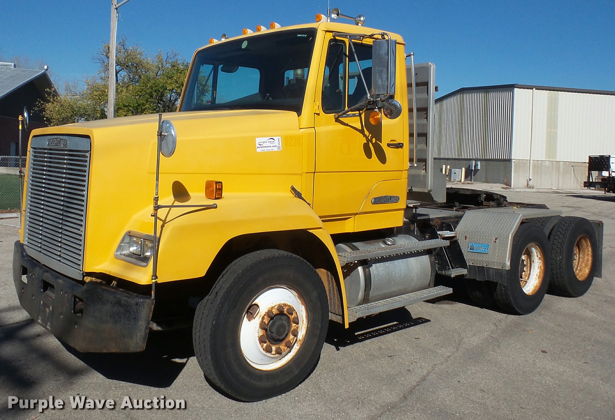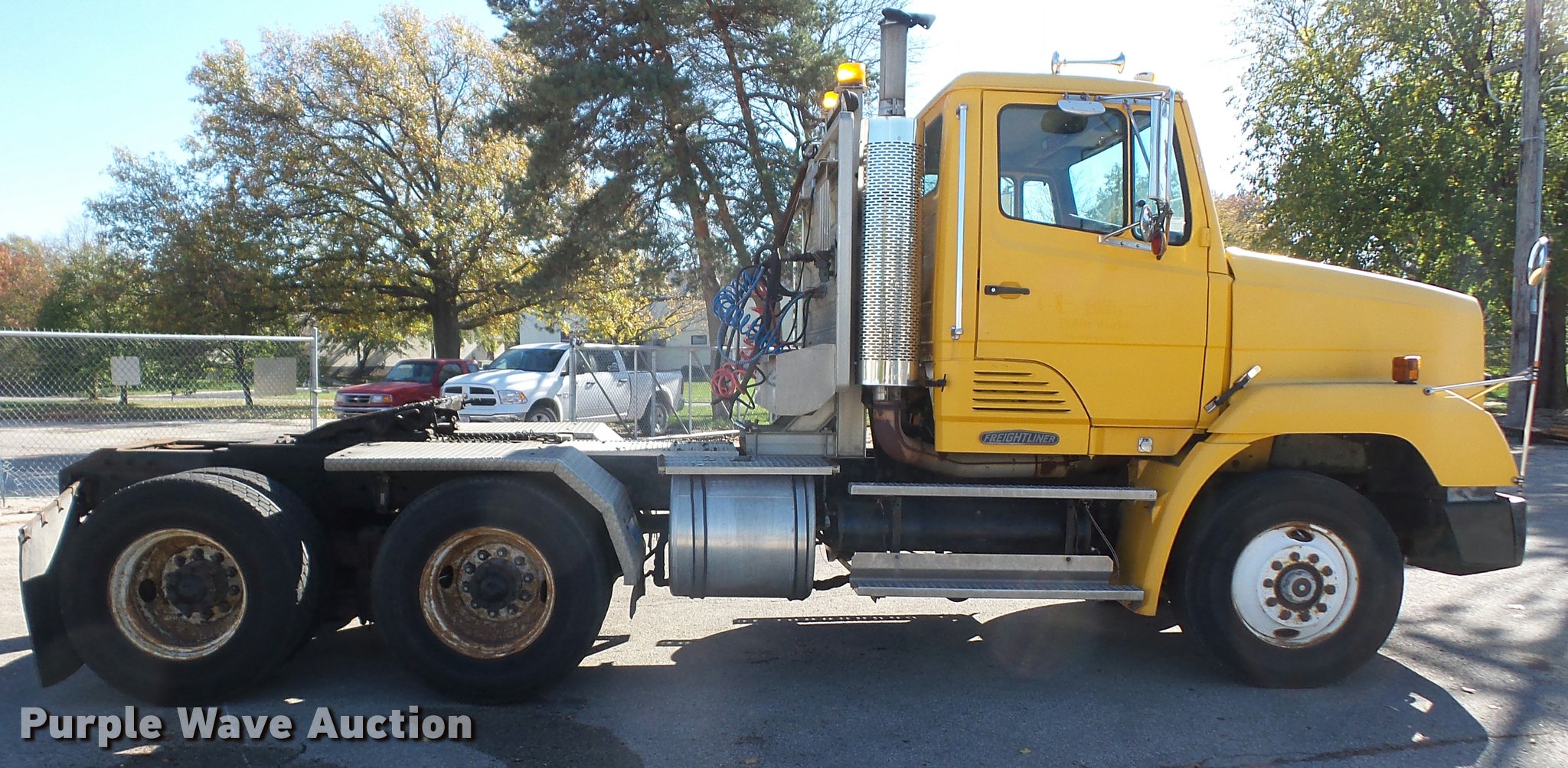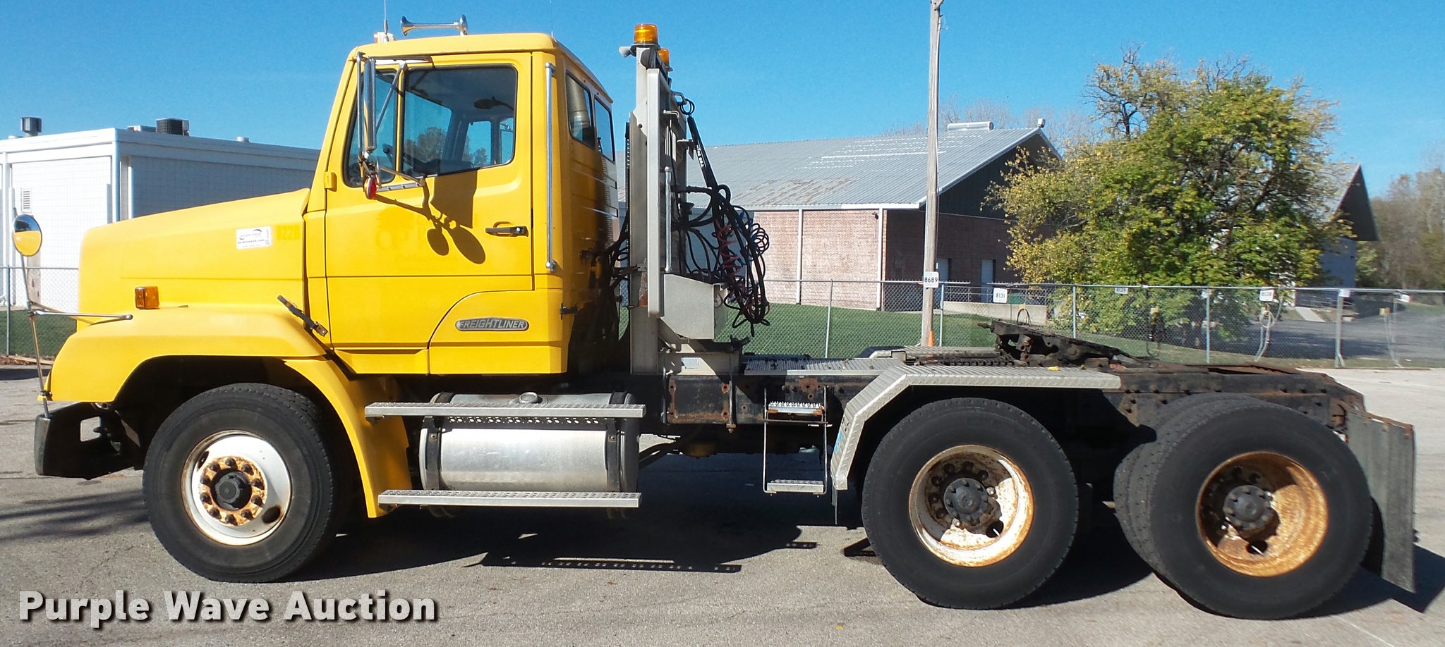 Purple Wave is selling a used Truck Tractor in Kansas. This item is a 1991 Freightliner semi truck with the following: 116,364 miles on odometer, Caterpillar 3406B 14.6L L6 turbo diesel engine, Eaton Fuller 13 speed manual transmission, Tandem axle, Inter-axle differential lock, AC and heat, AM/FM, Air suspension seat, PTO, Wet kit, Single rear exhaust stack, Aluminum deck plate, Sliding fifth wheel plate, Aluminum headache rack, Chain hanger, Storage, Single fuel tank, Aluminum half fenders, Spring over walking beam suspension, Air brakes, GVWR 52,220 lbs, FAWR 13,220 lbs, IAWR 20,000 lbs, RAWR 20,000 lbs