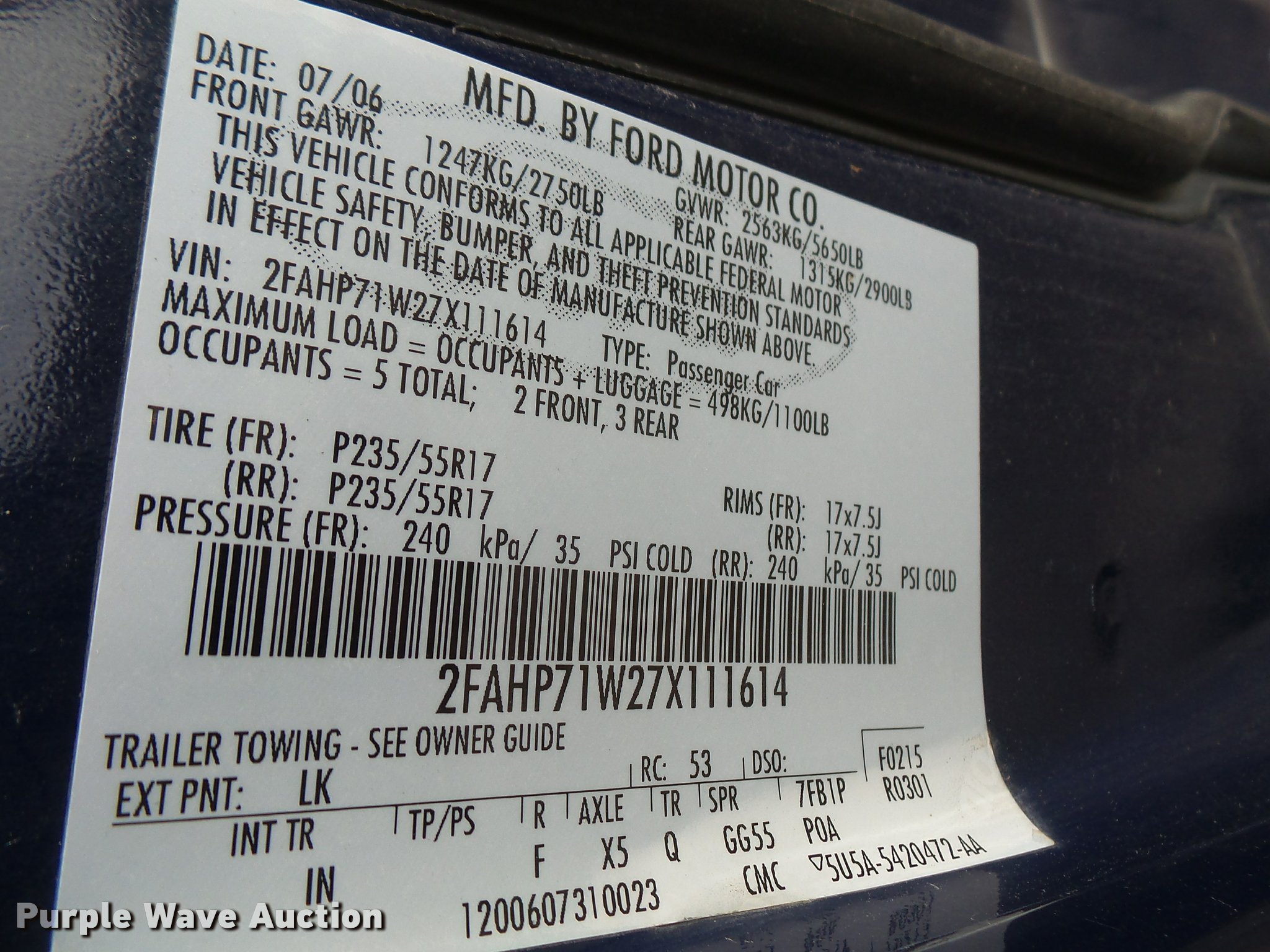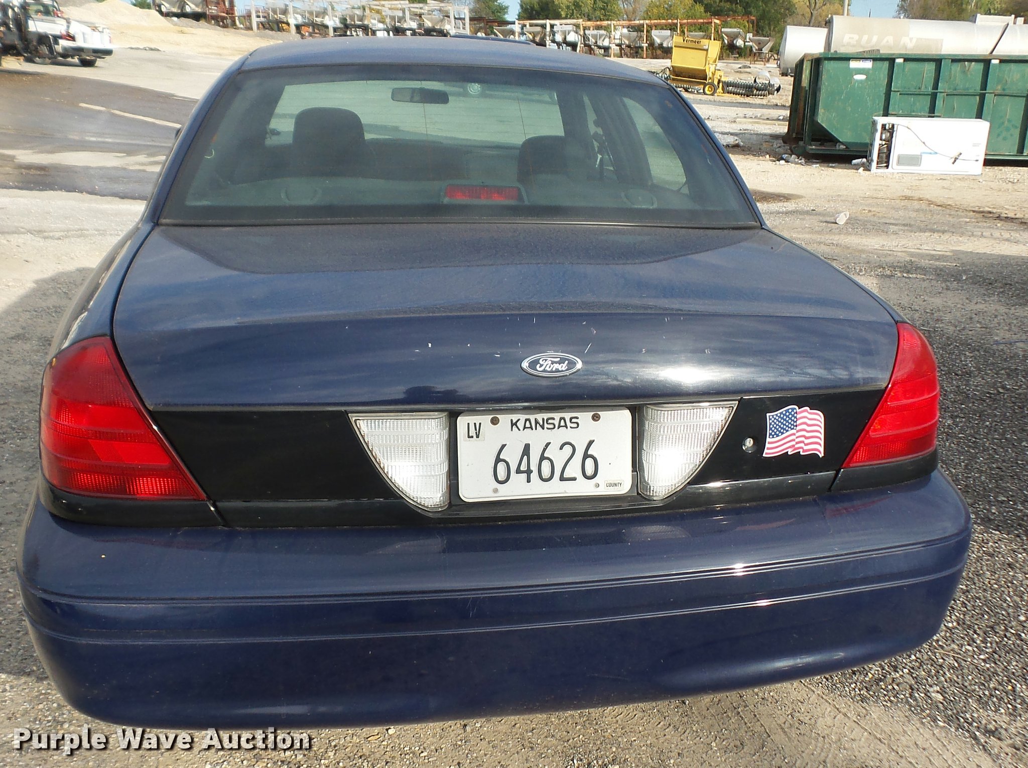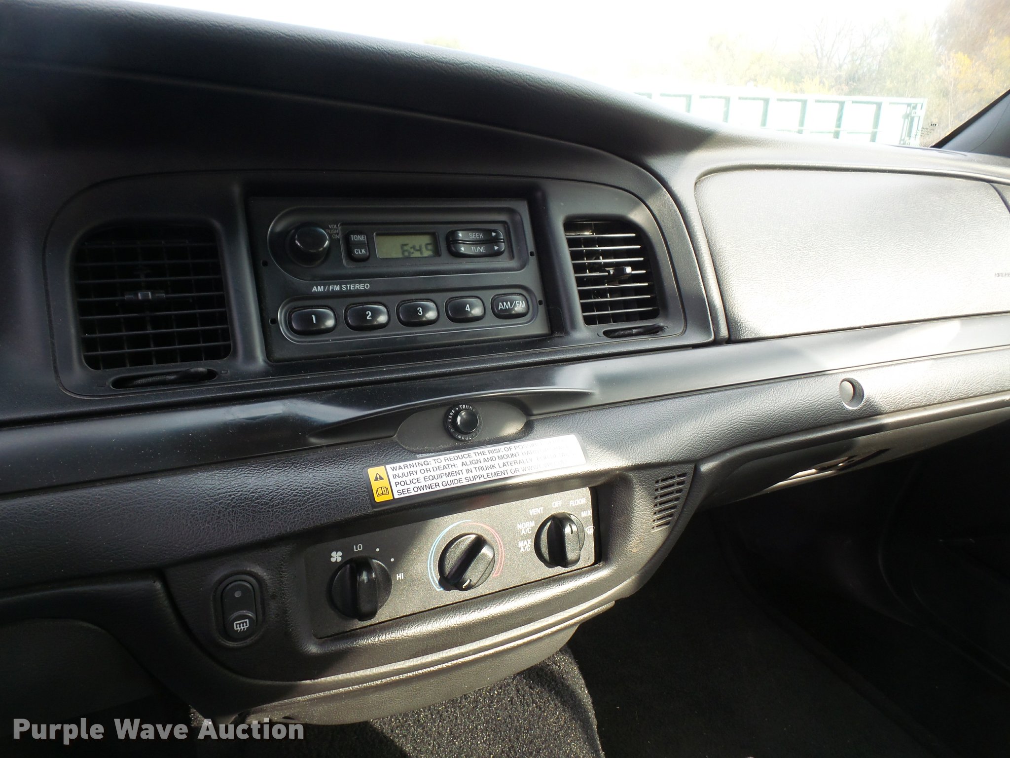 Purple Wave is selling a used Passenger Vehicle in Kansas. This item is a 2007 Ford Crown Victoria Police Interceptor with the following: 112,836 miles on odometer, 4.6L V8 SOHC 16V gas engine, Automatic transmission, AC and heat, Tilt, Cruise, AM/FM, Power windows, locks, mirrors, and seat, Cloth front interior, Vinyl rear interior, Spotlight, 235/55R17 tires, Check engine light on