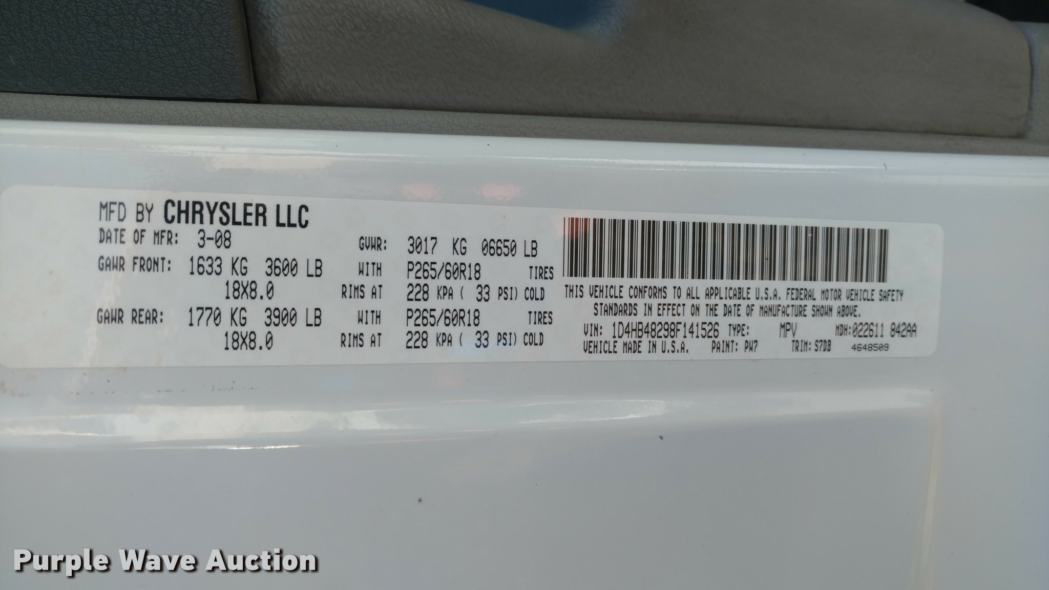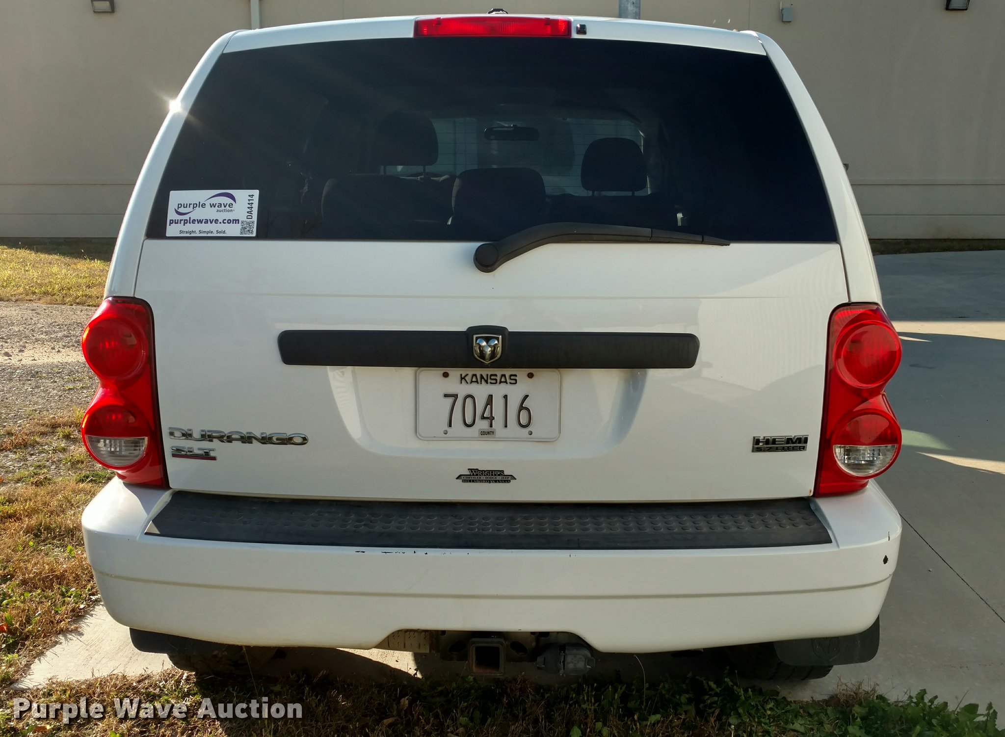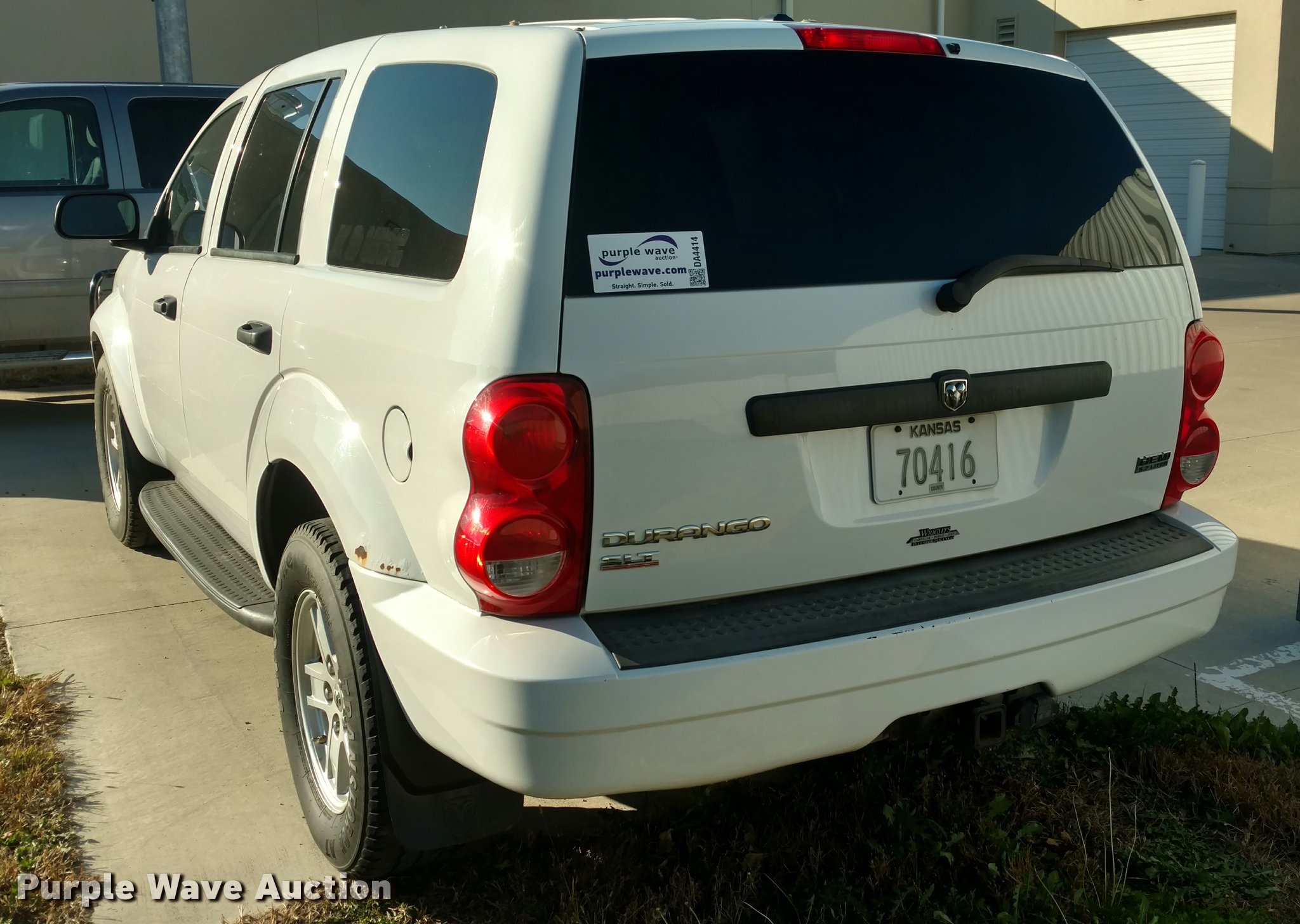 Purple Wave is selling a used Passenger Vehicle in Kansas. This item is a 2008 Dodge Durango SLT SUV with the following: 160,179 miles on odometer, 5.7L V8 OHV 16V gas engine, Automatic transmission, Four wheel drive, AC and heat, Tilt, Cruise, AM/FM/CD, Power windows, locks, and mirrors, Cloth interior, 275/65R18 tires, Third row seat is not bolted in, Previous K-9 vehicle