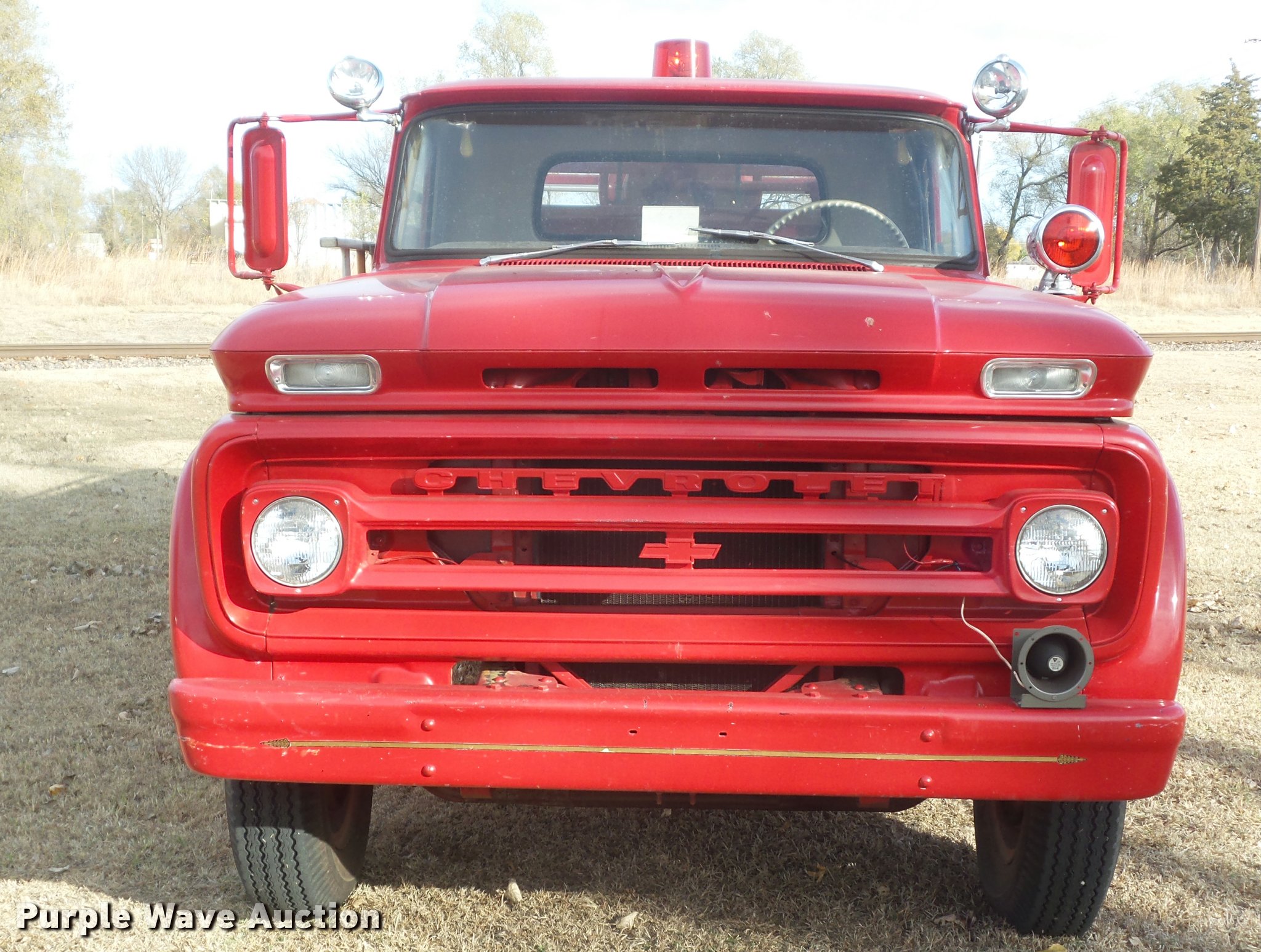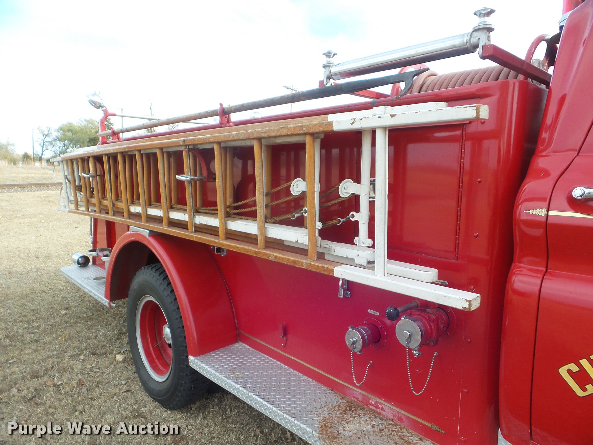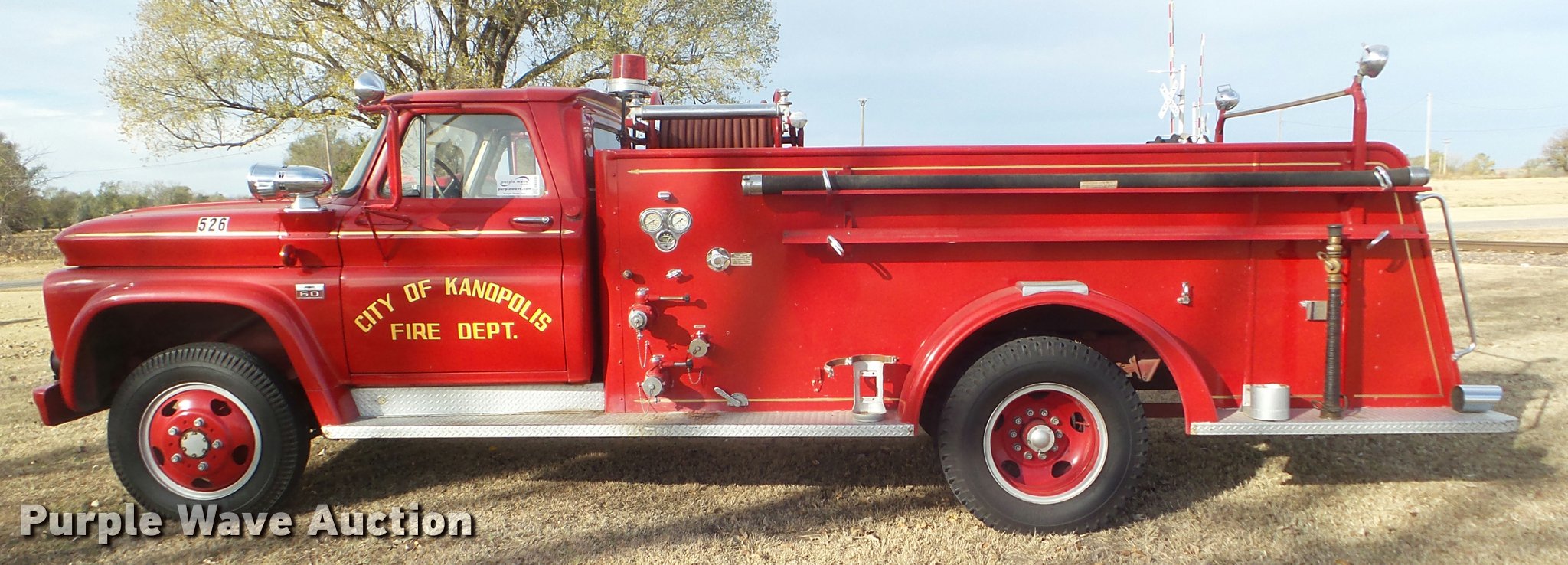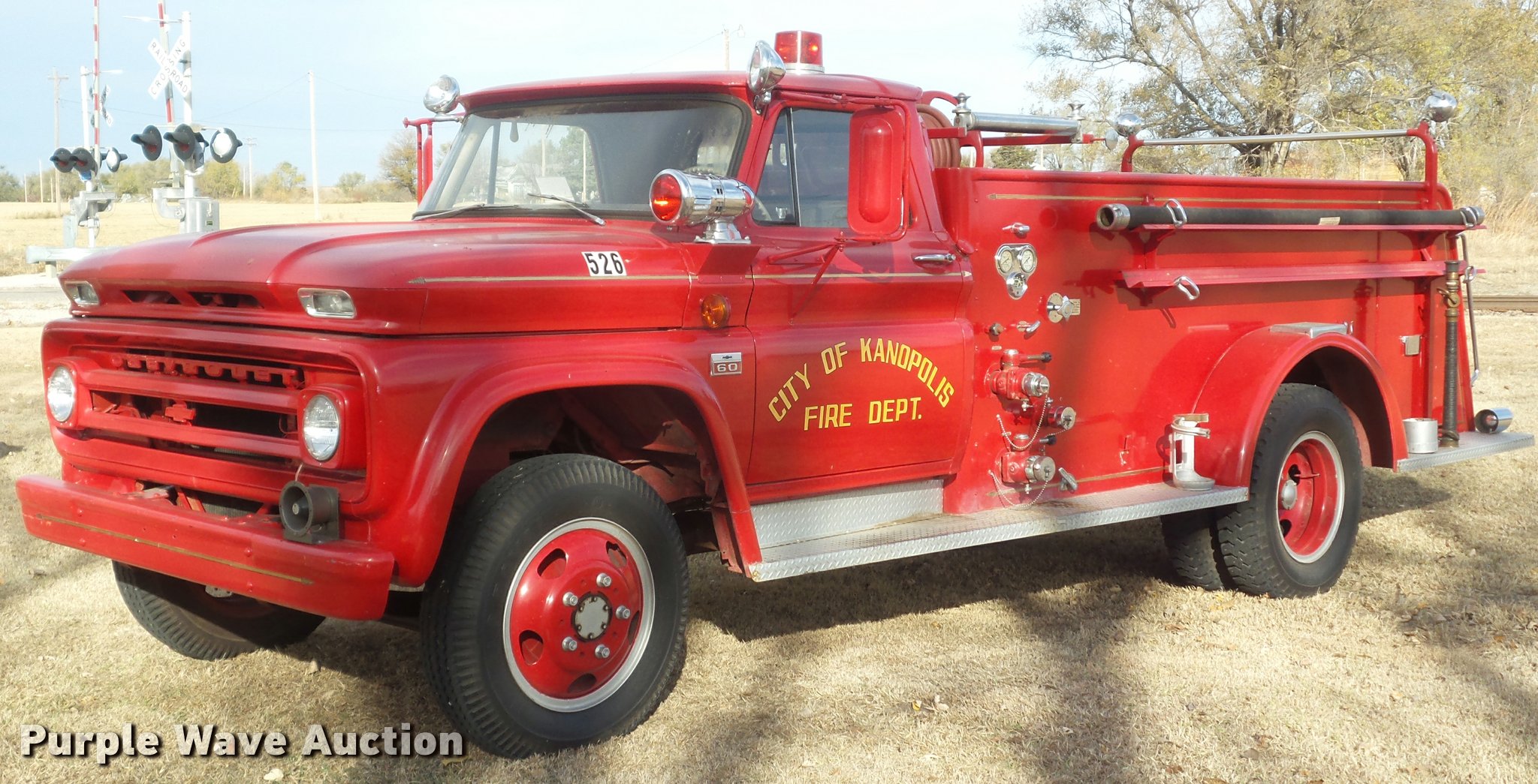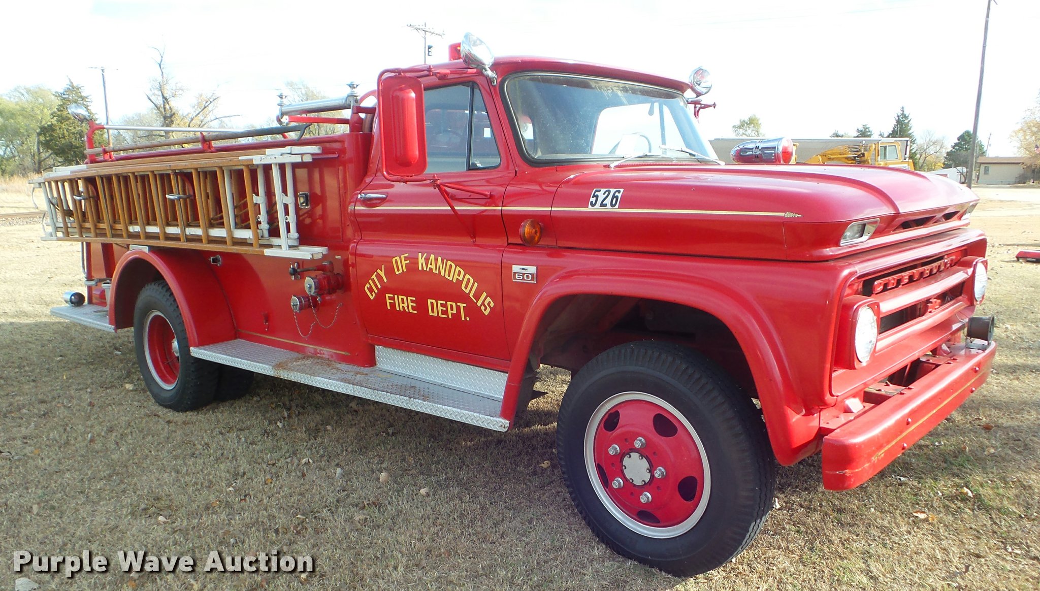 Purple Wave is selling a used Fire Truck or Emergency Vehicle in Kansas. This item is a 1966 Chevrolet C60 fire truck with the following: 1,414 miles on odometer, Chevrolet 292 C.I.D. six cylinder gas engine, Four speed manual transmission, Single axle, Heat, Suspension seat, PTO, American fire apparatus, Work lights, Hose, Ladder, 7.50-20 front tires, 8.25-20 rear tires