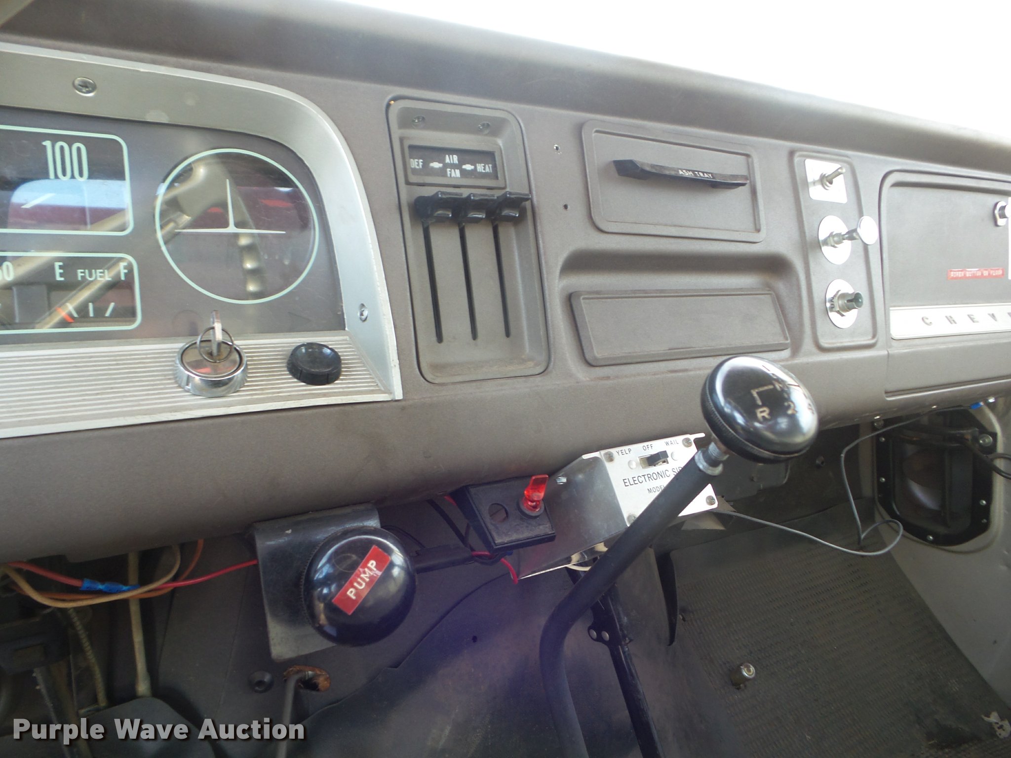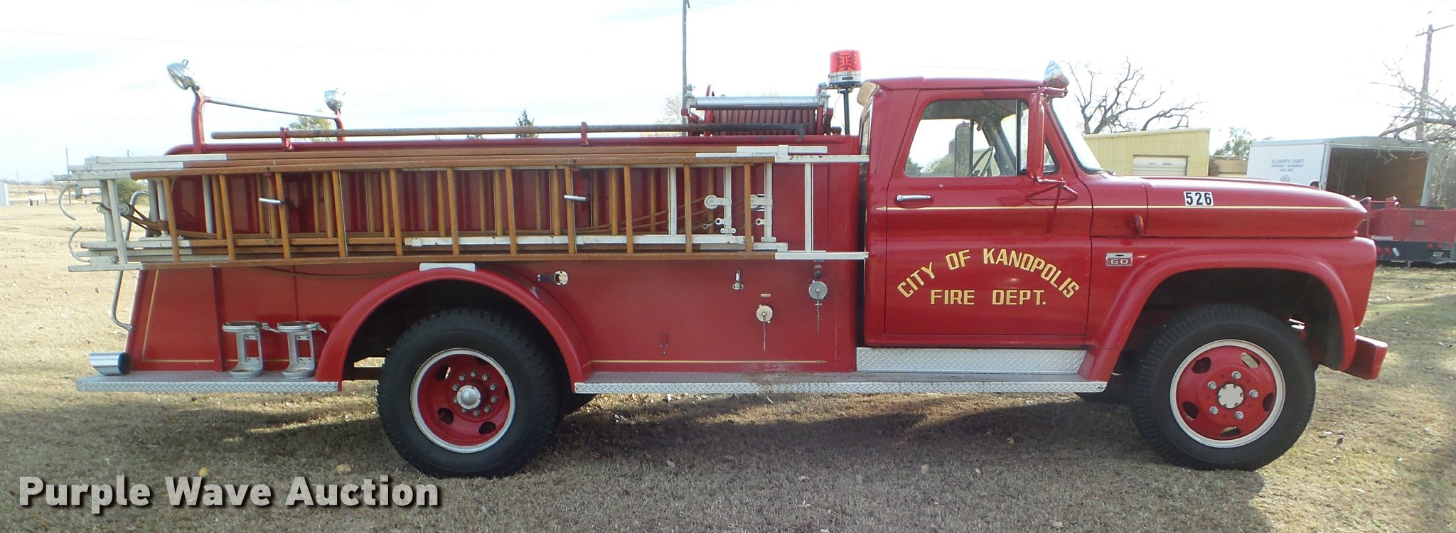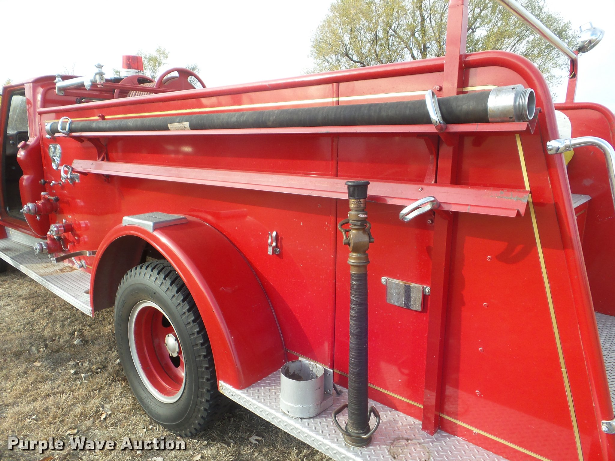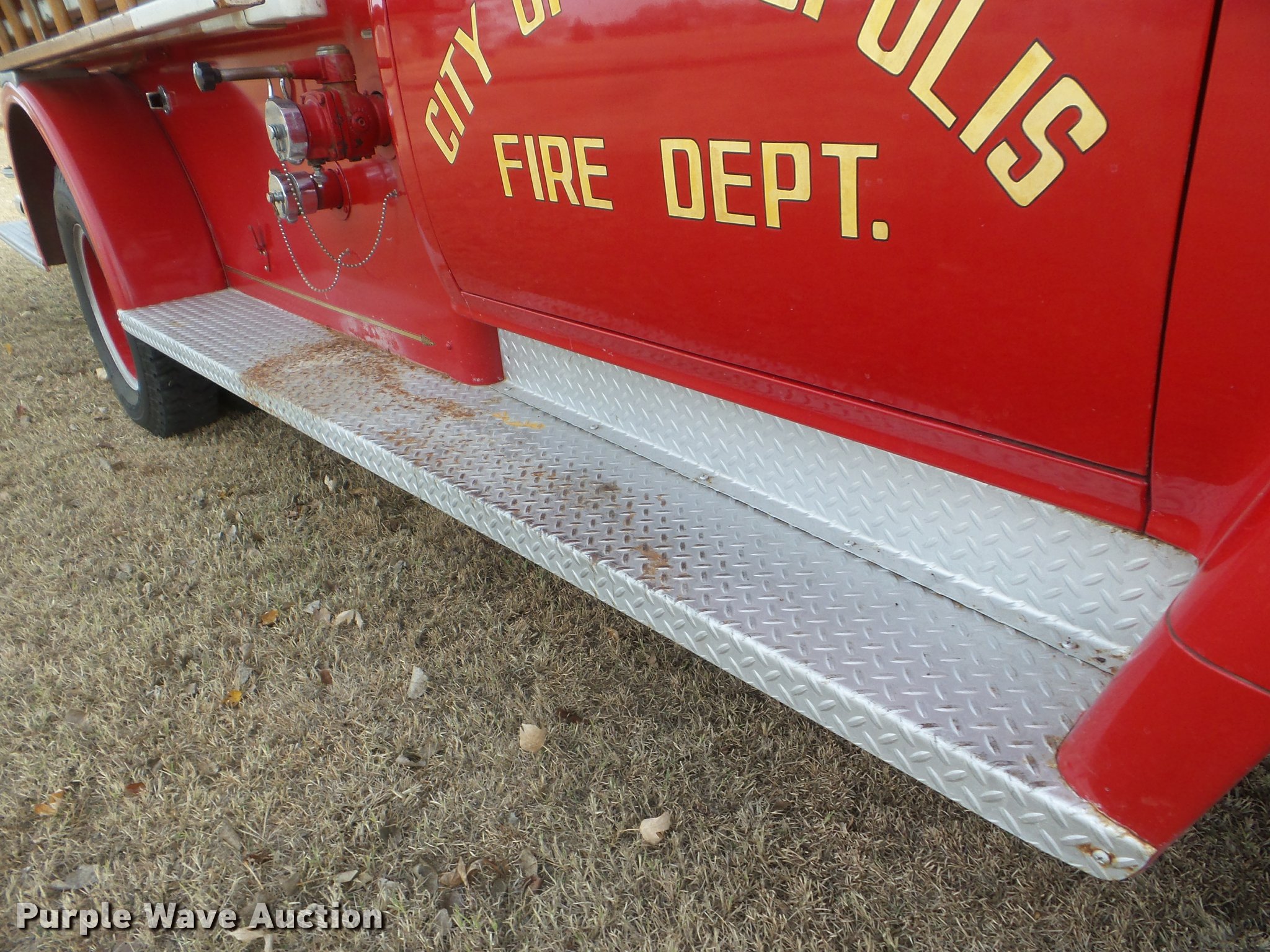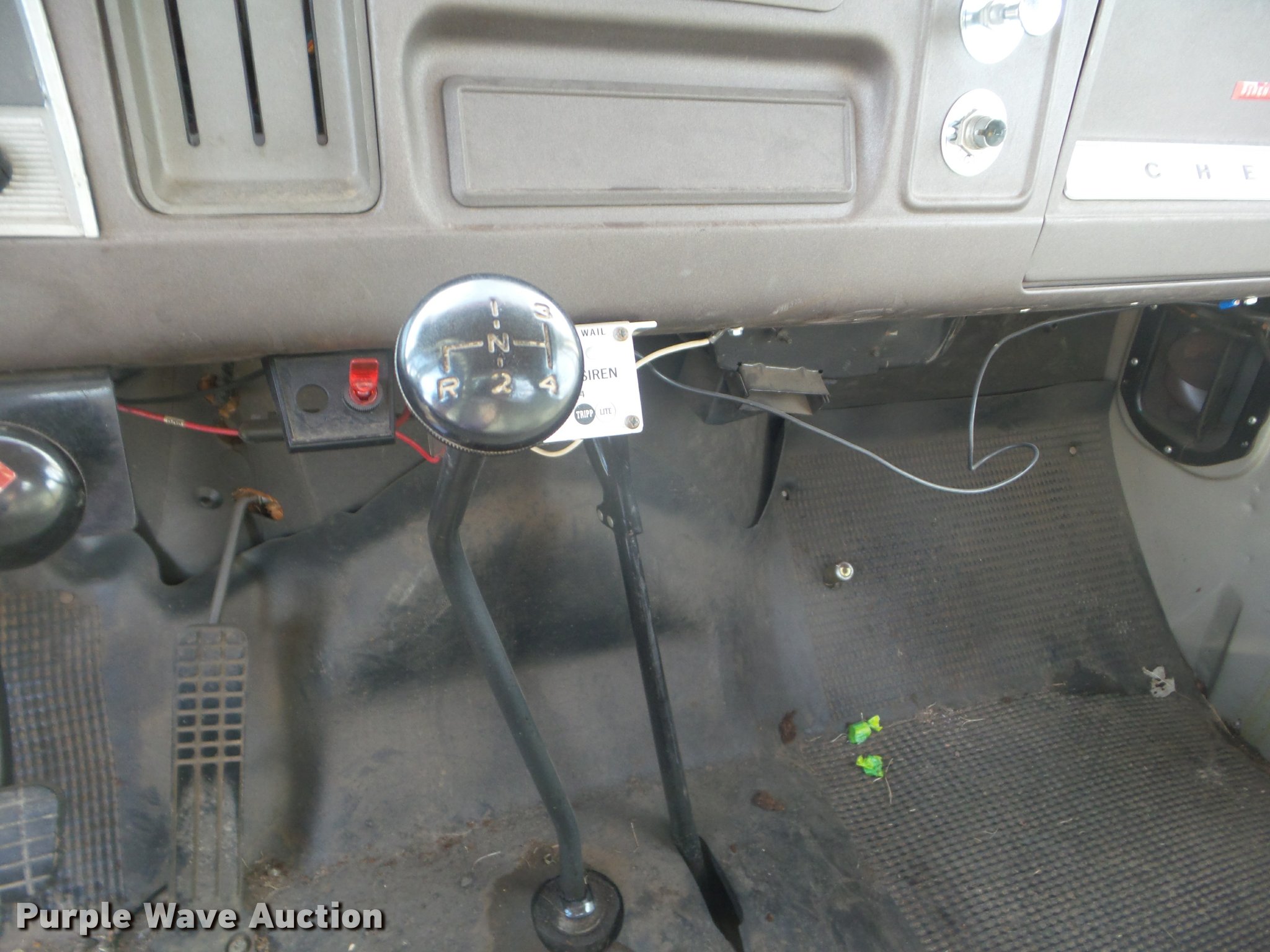 Purple Wave is selling a used Fire Truck or Emergency Vehicle in Kansas. This item is a 1966 Chevrolet C60 fire truck with the following: 1,414 miles on odometer, Chevrolet 292 C.I.D. six cylinder gas engine, Four speed manual transmission, Single axle, Heat, Suspension seat, PTO, American fire apparatus, Work lights, Hose, Ladder, 7.50-20 front tires, 8.25-20 rear tires