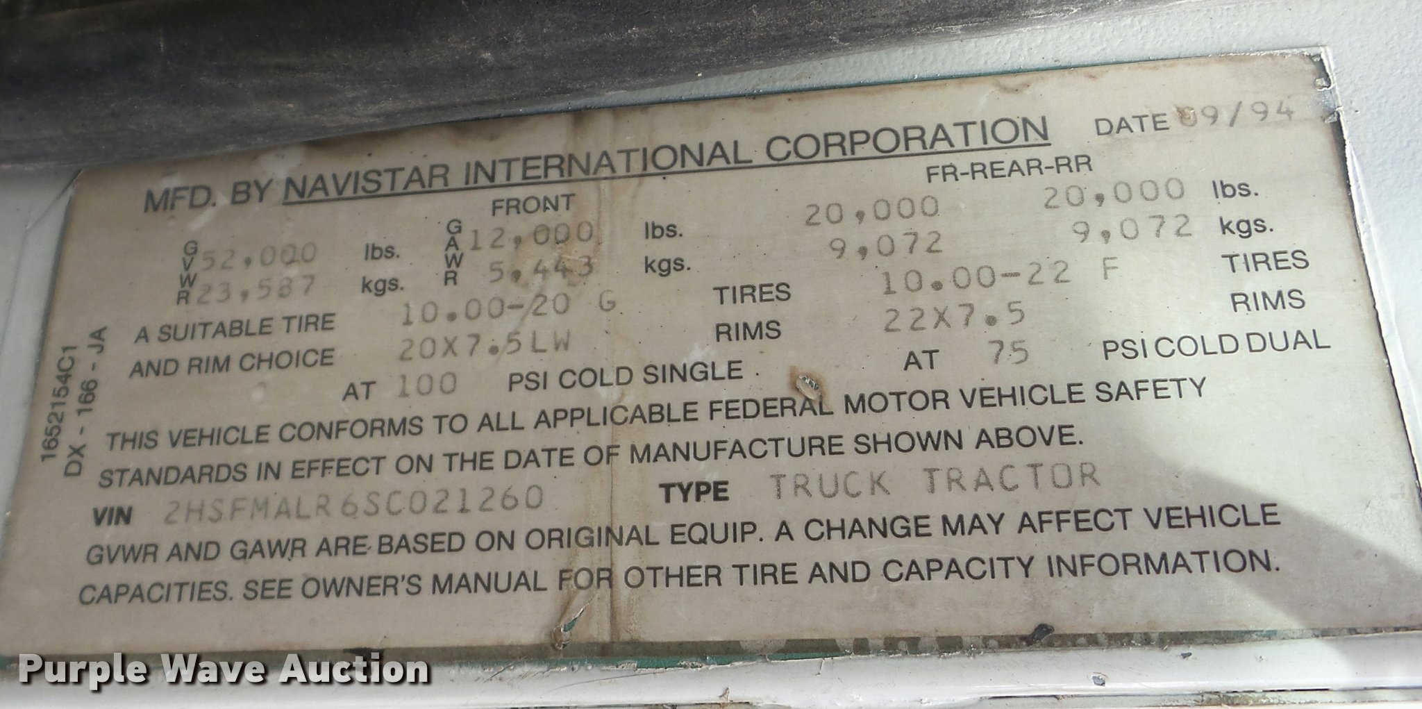 Purple Wave is selling a used Construction Dump Truck in Kansas. This item is a 1995 International 9200 dump truck with the following: 835,318 miles on odometer, Detroit Diesel Series 60 11.1L L6 turbo diesel engine, 365 HP, Spicer nine speed manual transmission, Tandem axle, Inter-axle differential lock, AC and heat, Cruise, AM/FM/CD, Air suspension seat, PTO, Davis steel dump bed, 17'L, 42" side height, Air operated end gate, Single ram hoist, Dual fuel tanks, Air suspension, Air brakes, Engine brake, 11R22.5 tires, GVWR 52,000 lbs, FAWR 12,000 lbs, IAWR 20,000 lbs, RAWR 20,000 lbs, Non-operational engine, possible fuel issues, Unit# 152