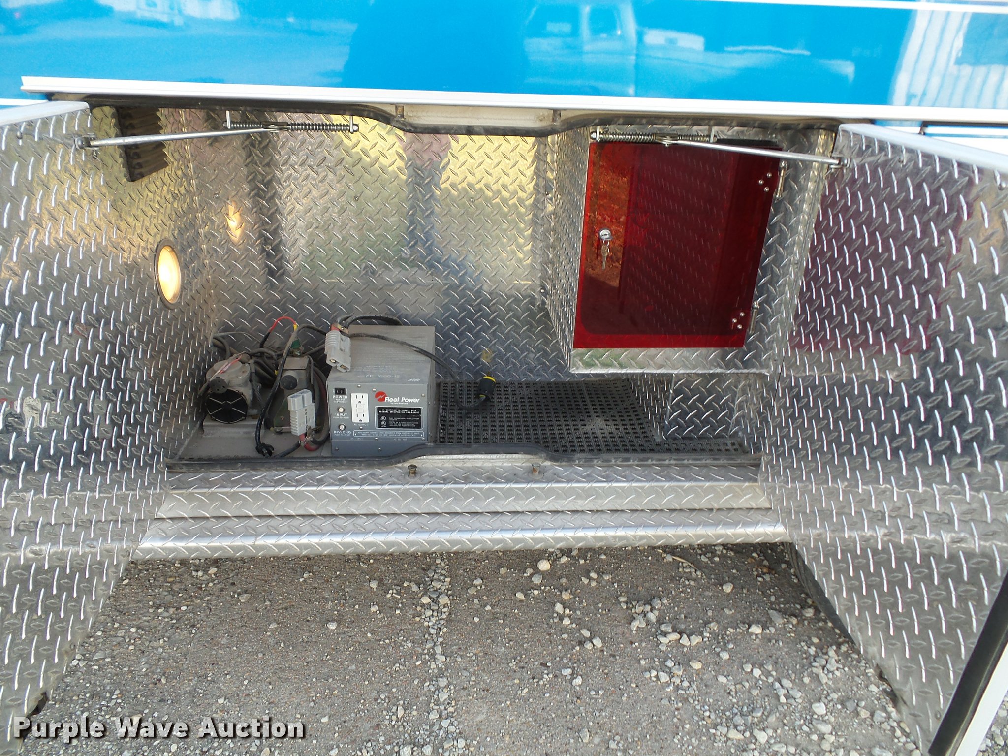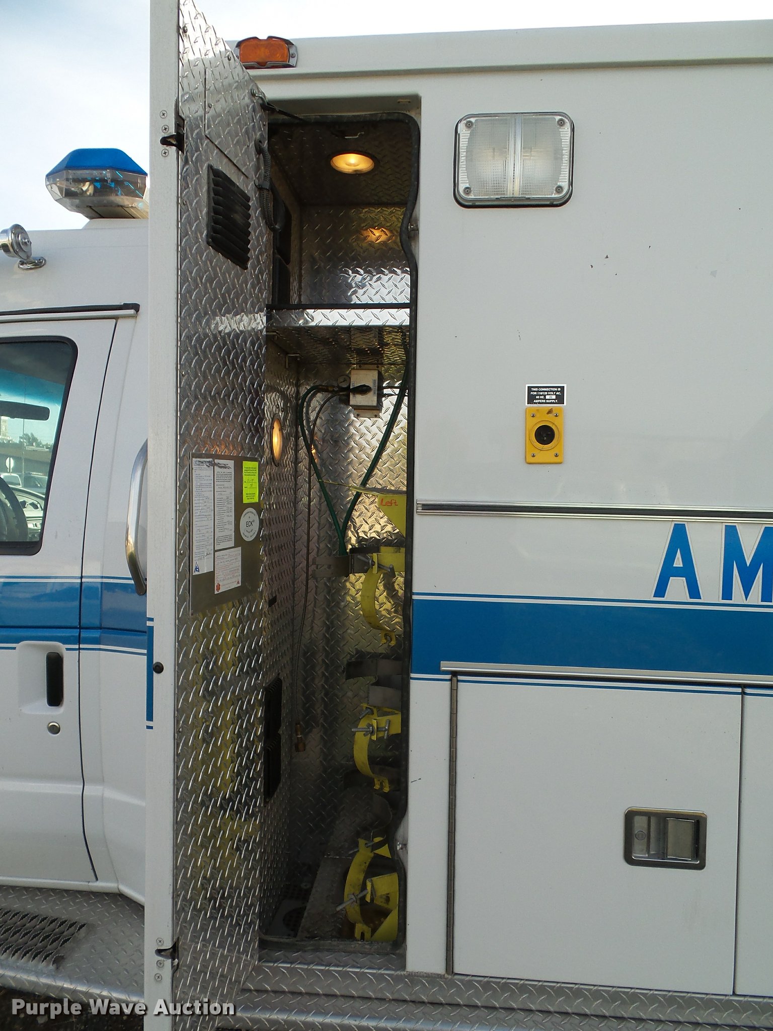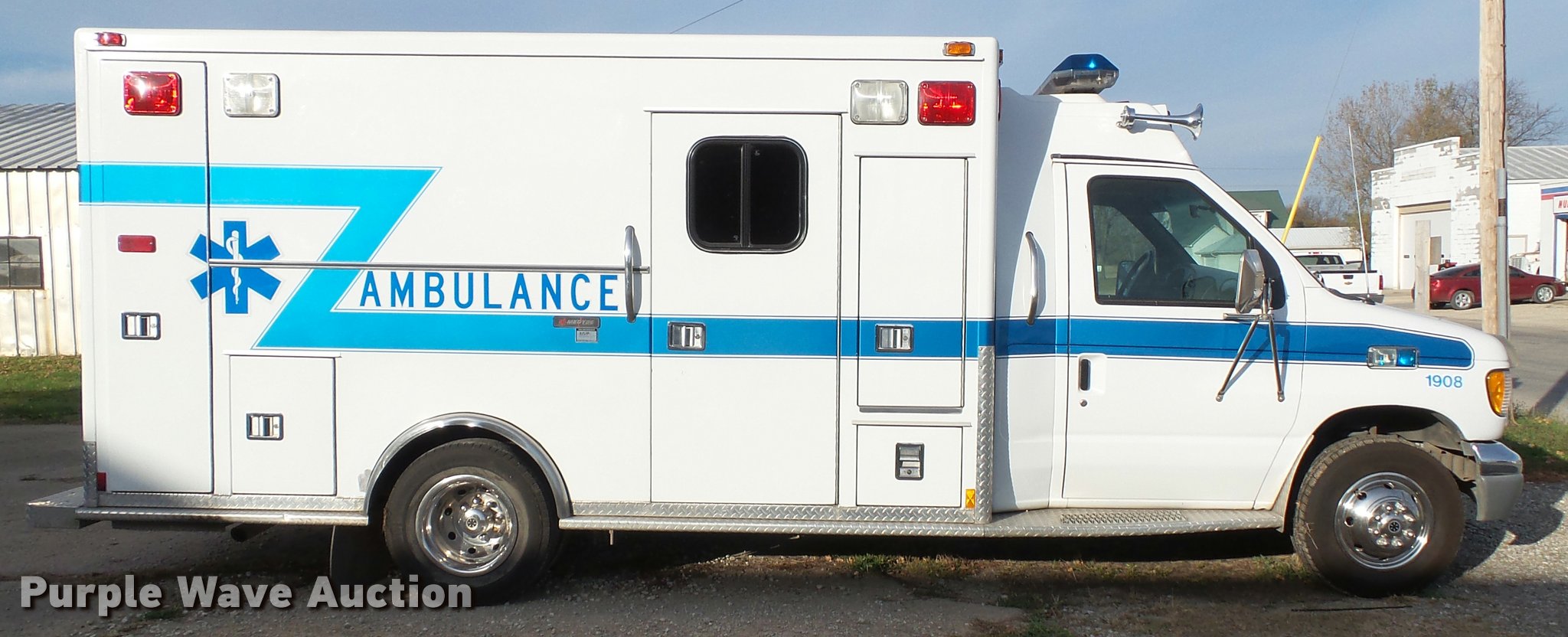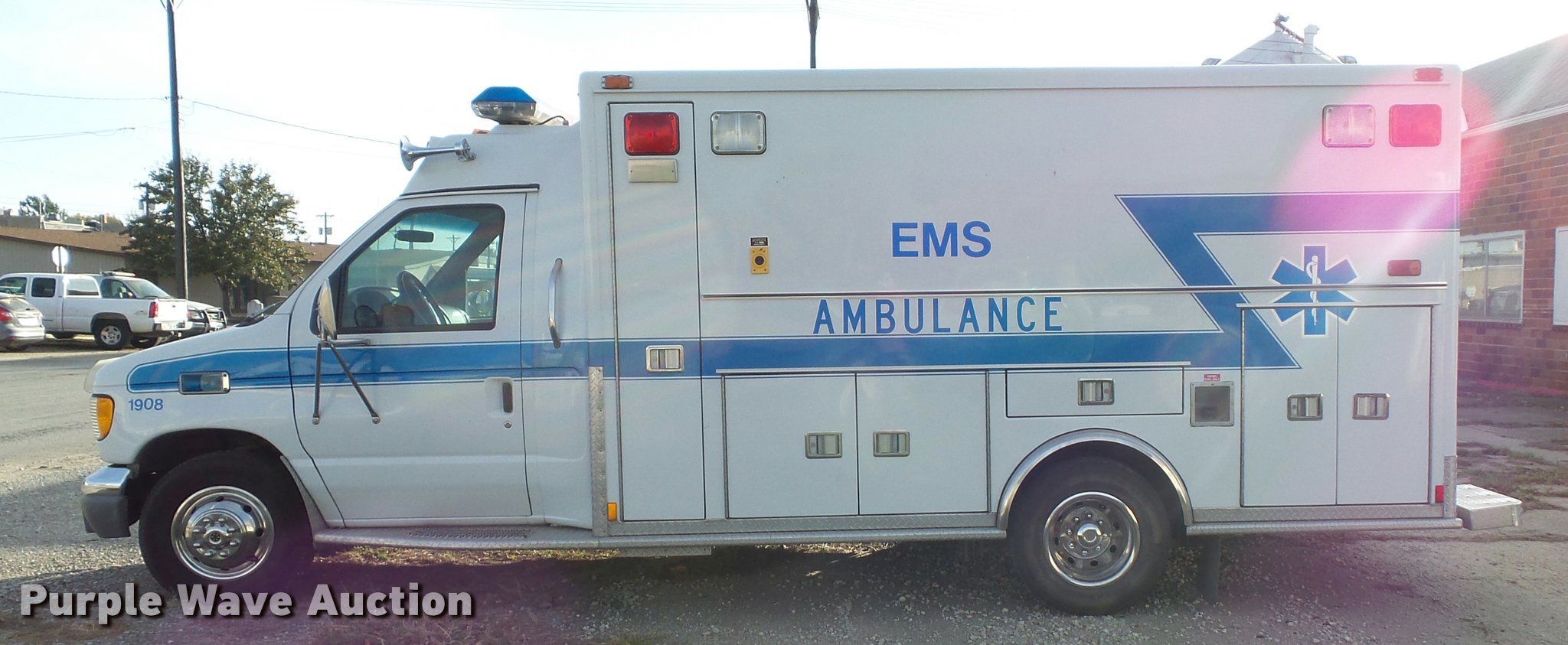 Purple Wave is selling a used Fire Truck or Emergency Vehicle in Kansas. This item is a 1999 Ford Econoline E450 ambulance with the following: 145,284 miles on odometer, 7,178 hours on meter, 7.3L V8 OHV 16V turbo diesel engine, 210 HP, Automatic transmission, Single axle, AC and heat, Cruise, AM/FM, Power windows and locks, Cloth interior, Air horn, Backup alarm, MedTec Type III ambulance body, Emergency lights and sirens, Federal PA/siren controls, (3) oxygen hookups, Vacuum hookup, Michelin 225/75R16 tires, GVWR 14,050 lbs, Inverter inoperable, Batteries need to be replaced, Unit# 1908