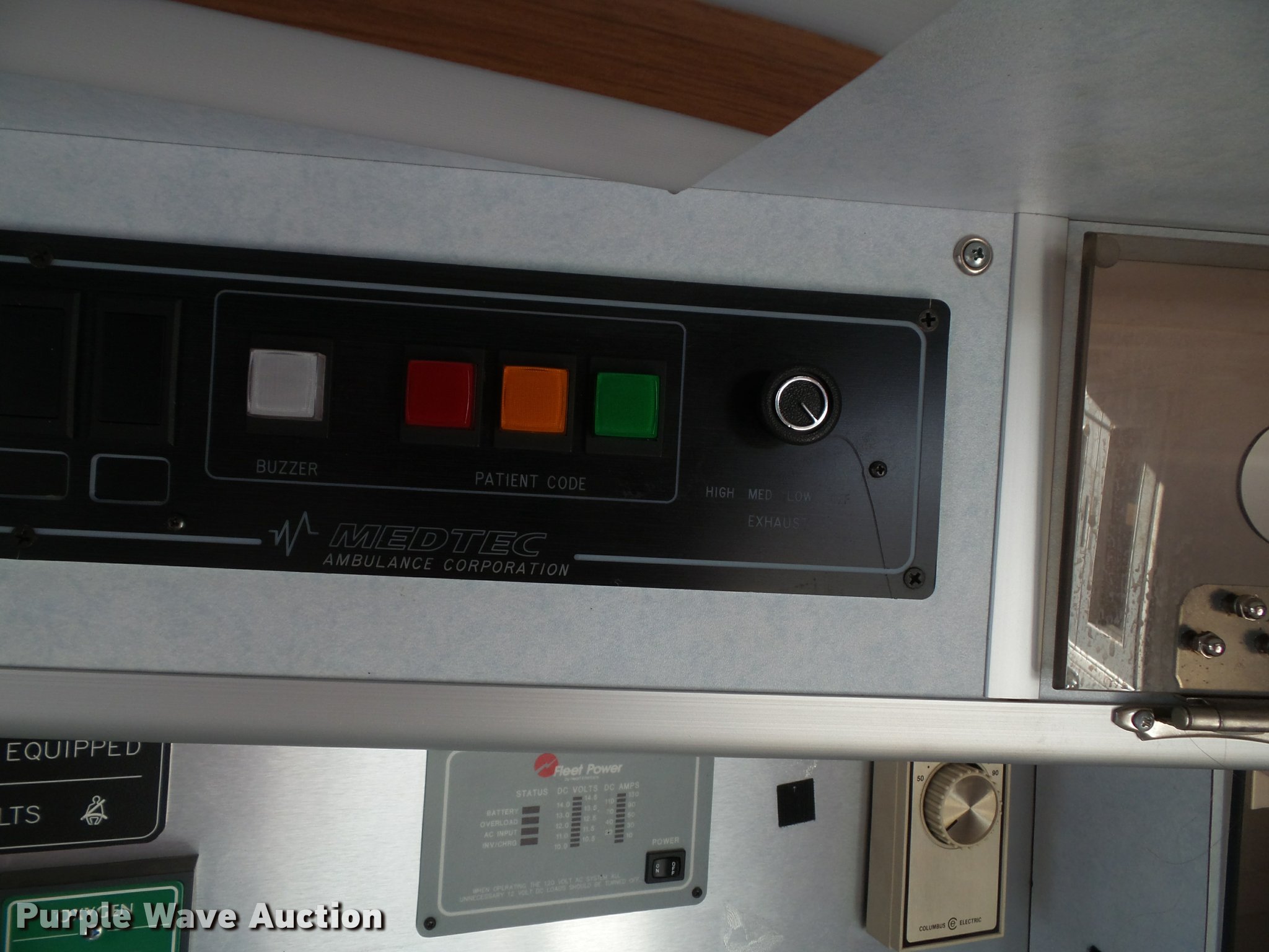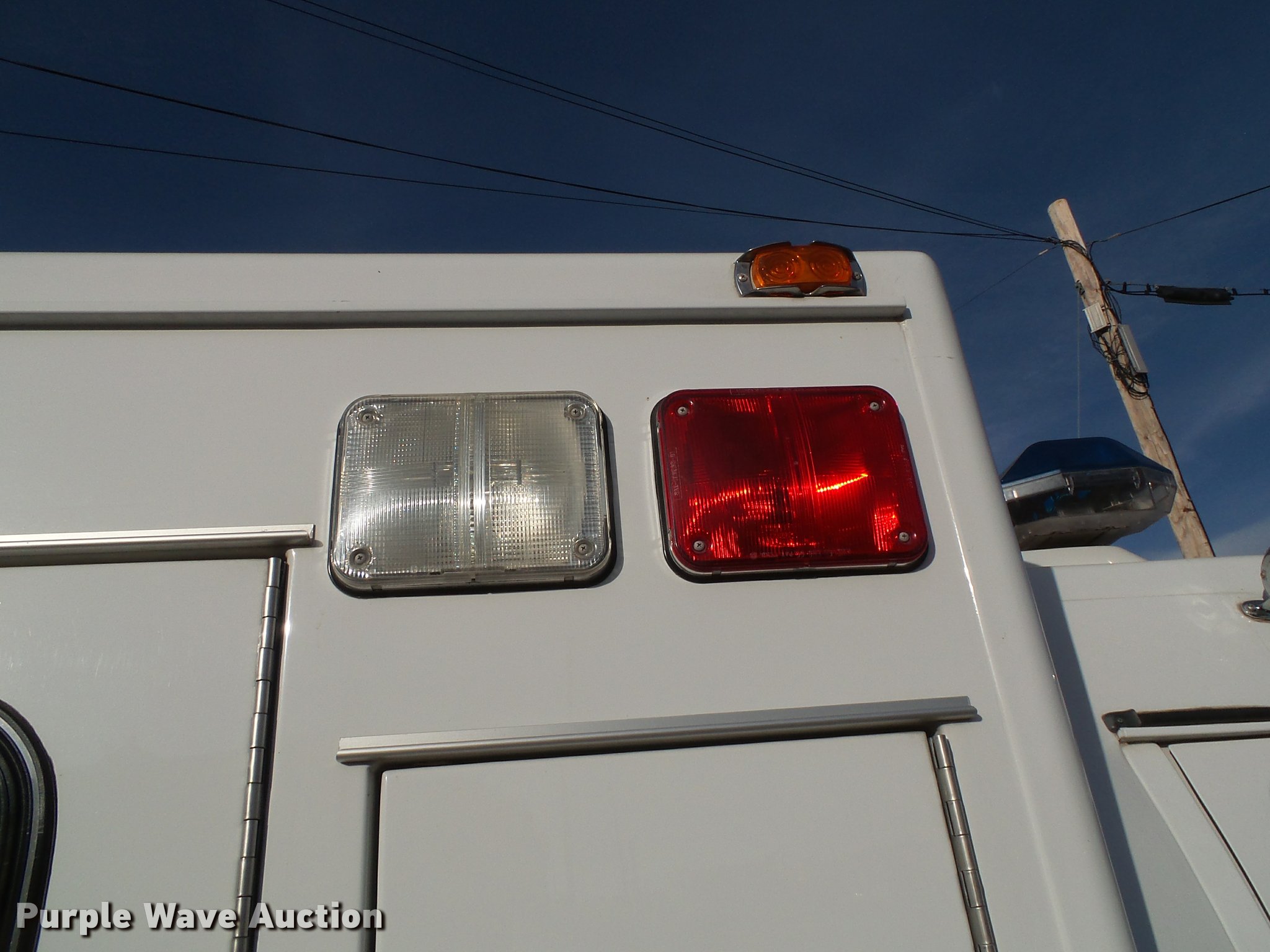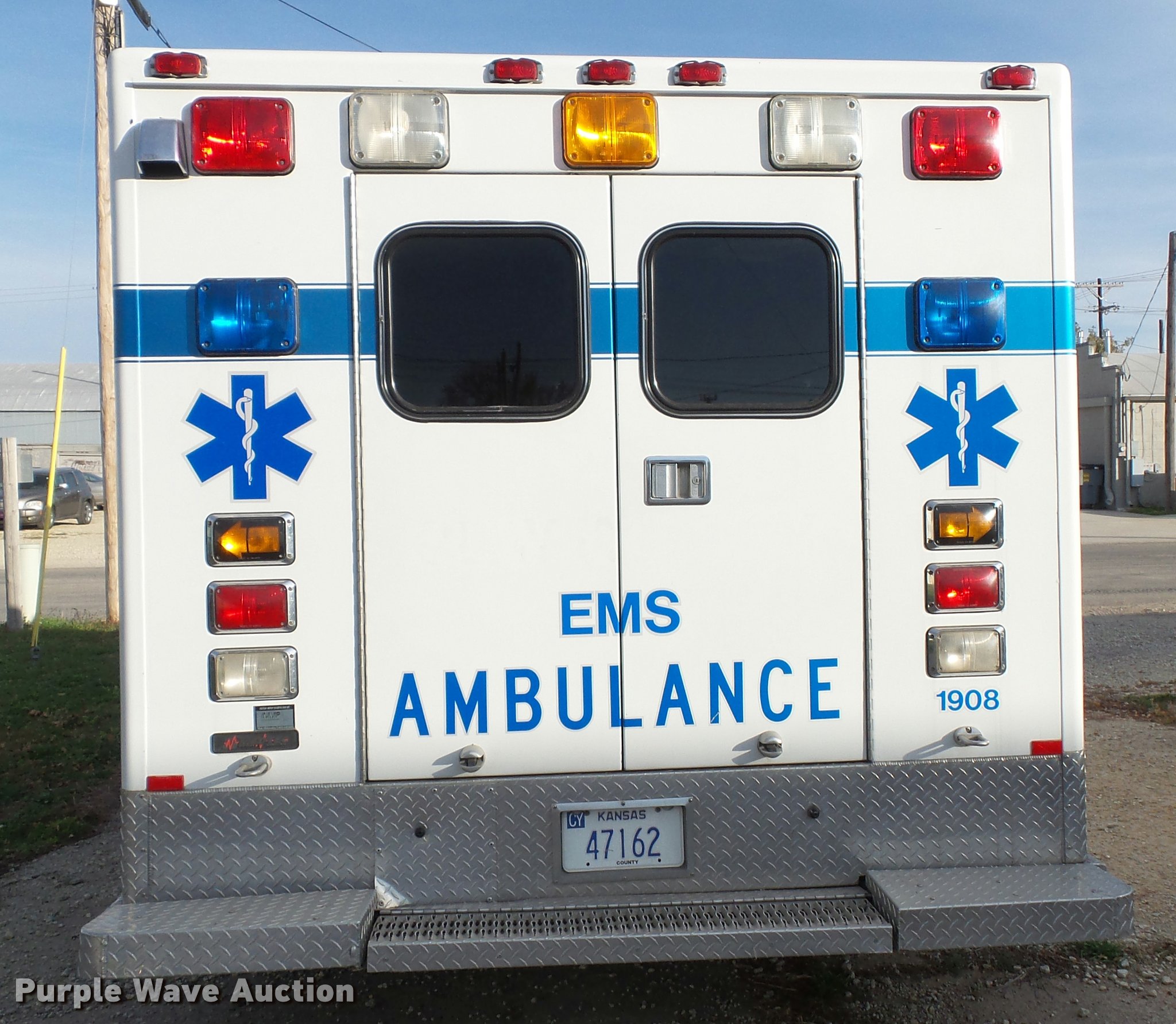 1999 Ford Econoline E450 ambulance. 145,284 miles on odometer, 7,178 hours on meter, 7.3L V8 OHV 16V turbo diesel engine 210 HP, Automatic transmission, Single axle, AC and heat, Cruise, AM/FM, Power windows and locks, Cloth interior, Air horn, Backup alarm, MedTec Type III ambulance body Emergency lights and sirens, Federal PA/siren controls, (3) oxygen hookups, Vacuum hookup, Michelin 225/75R16 tires, GVWR 14,050 lbs, Inverter inoperable, Batteries need to be replaced, Unit# 1908. Kansas title. 1FDXE40F9XHA53069. Clay Center, KS 67432