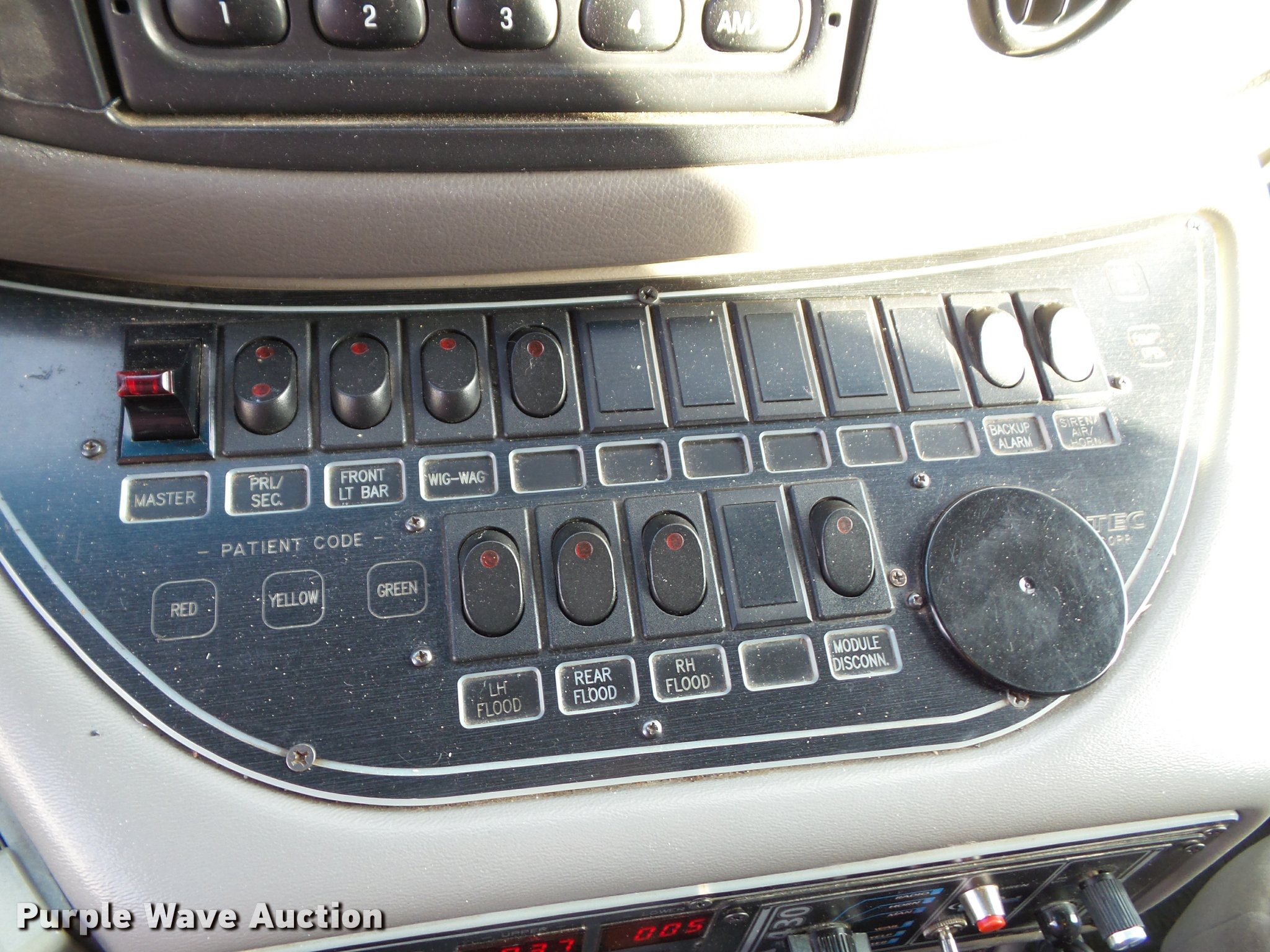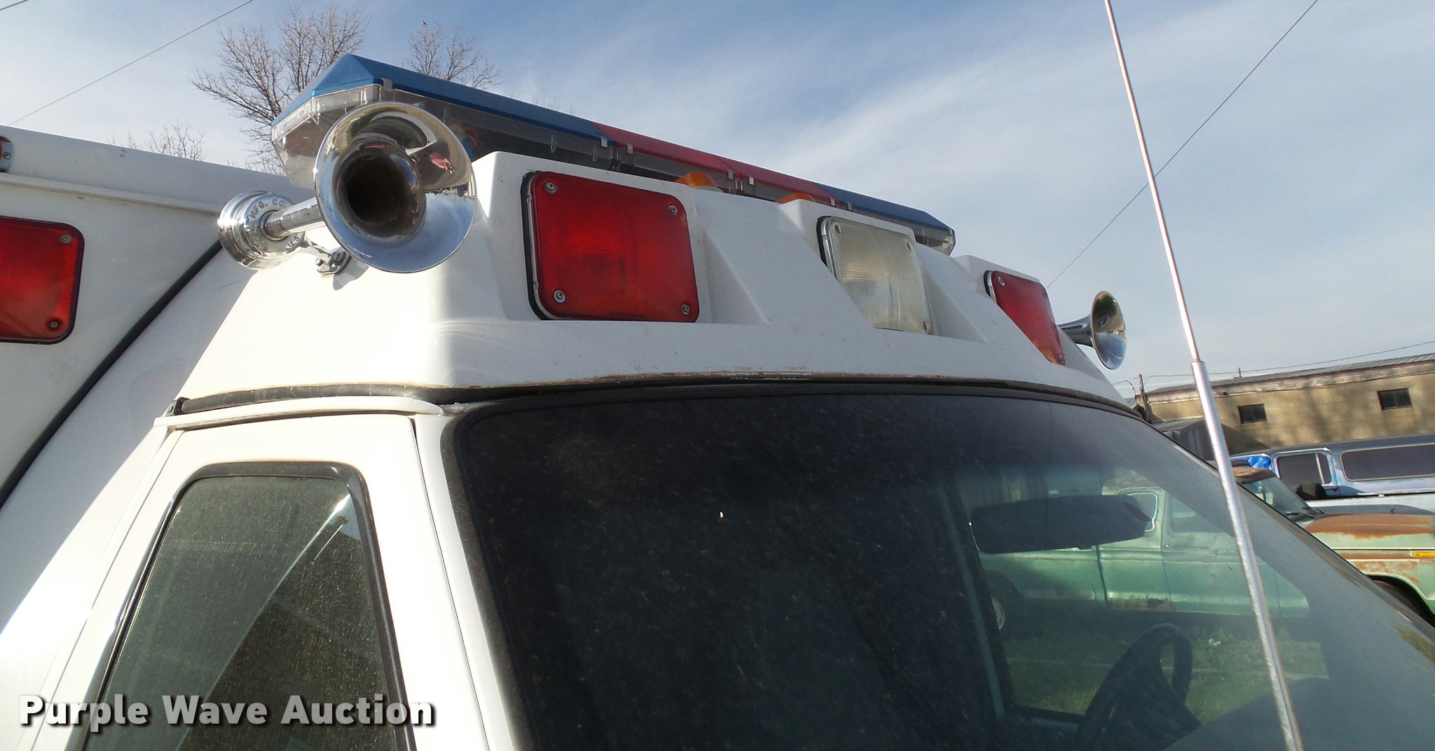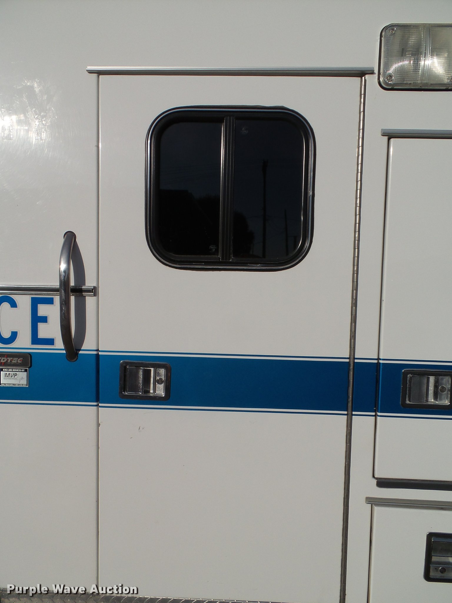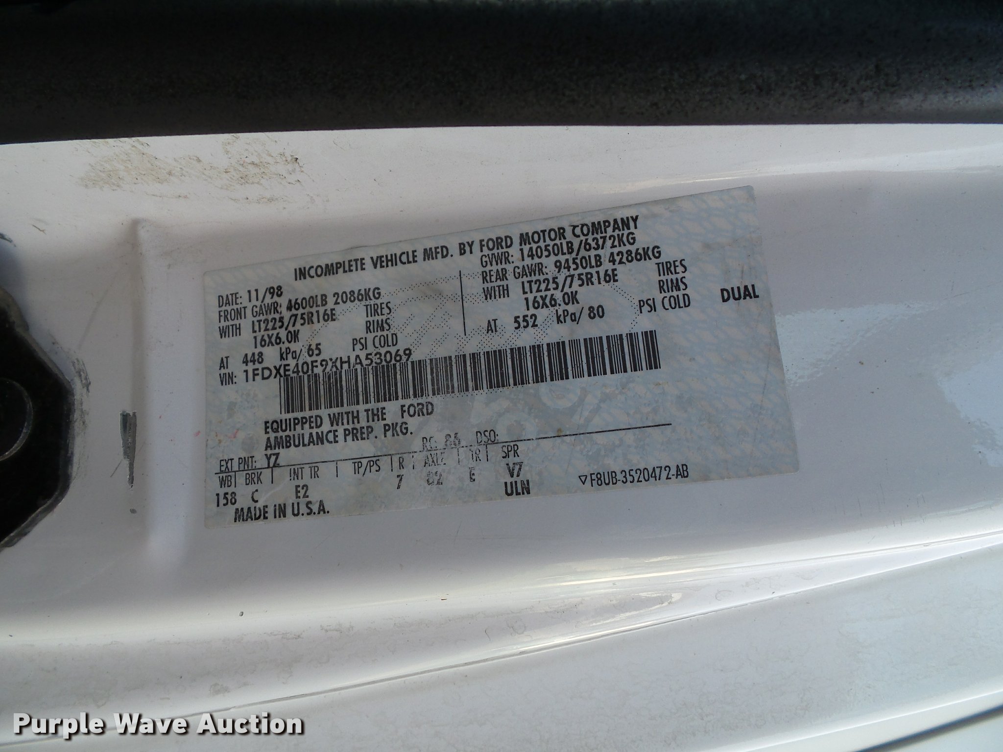 1999 Ford Econoline E450 ambulance. 145,284 miles on odometer, 7,178 hours on meter, 7.3L V8 OHV 16V turbo diesel engine 210 HP, Automatic transmission, Single axle, AC and heat, Cruise, AM/FM, Power windows and locks, Cloth interior, Air horn, Backup alarm, MedTec Type III ambulance body Emergency lights and sirens, Federal PA/siren controls, (3) oxygen hookups, Vacuum hookup, Michelin 225/75R16 tires, GVWR 14,050 lbs, Inverter inoperable, Batteries need to be replaced, Unit# 1908. Kansas title. 1FDXE40F9XHA53069. Clay Center, KS 67432