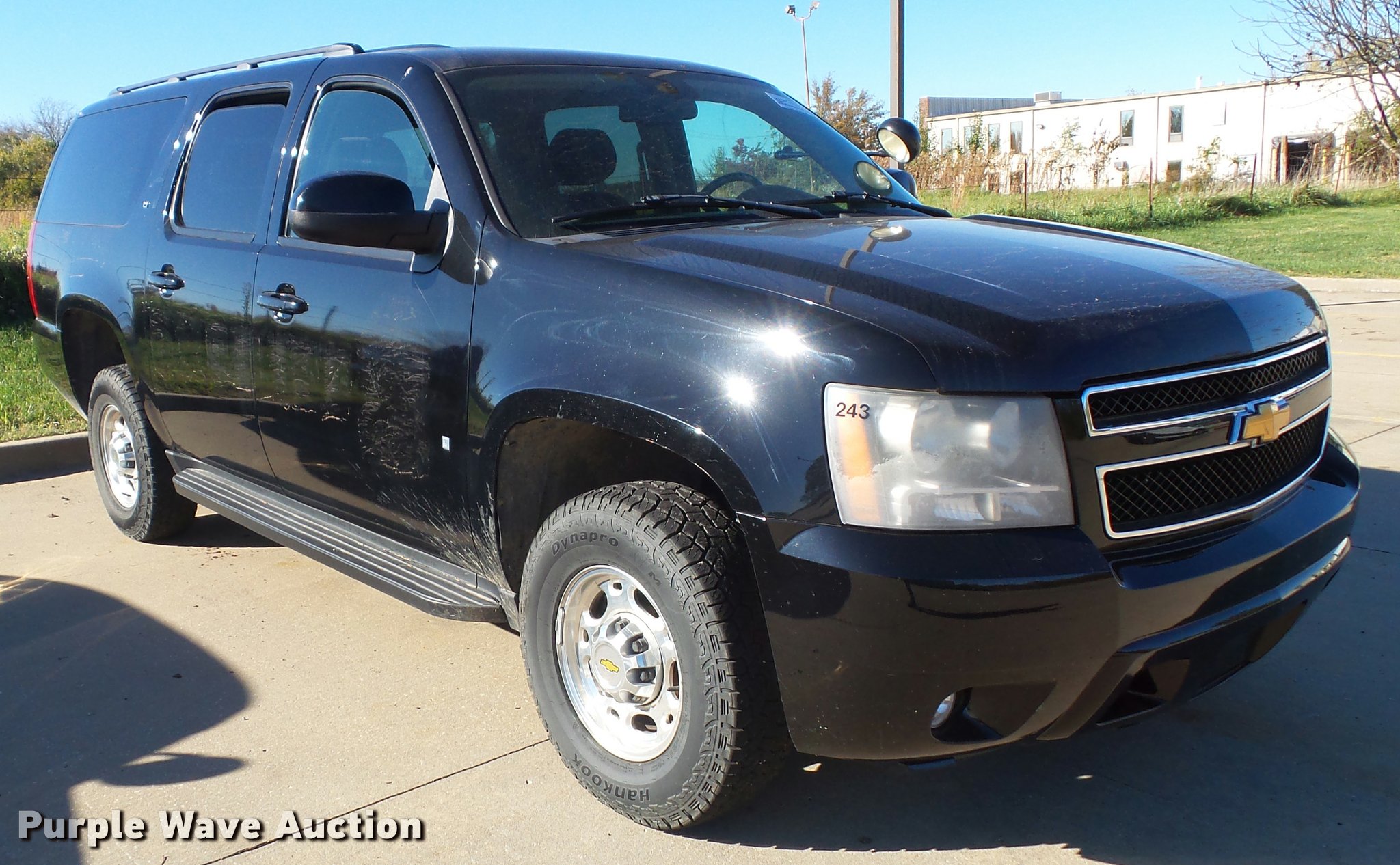 Purple Wave is selling a used Passenger Vehicle in Kansas. This item is a 2007 Chevrolet Suburban 2500 LT SUV with the following: 113,390 miles on odometer, 6.0L V8 OHV 16V gas engine, Automatic transmission, Four wheel drive, AC and heat, Tilt, Cruise, AM/FM/CD, Power windows, locks, mirrors, and seat, Cloth interior, Spotlight, Front tow hooks, Fog lights, Running boards, Luggage rack, Receiver hitch, Trailer wiring, 245/75R16 tires, Hole in roof from equipment, Check engine light on, No center console, Rear driver side door does not open, Transmission issues, Unit must be towed or hauled, Unit# SHR243