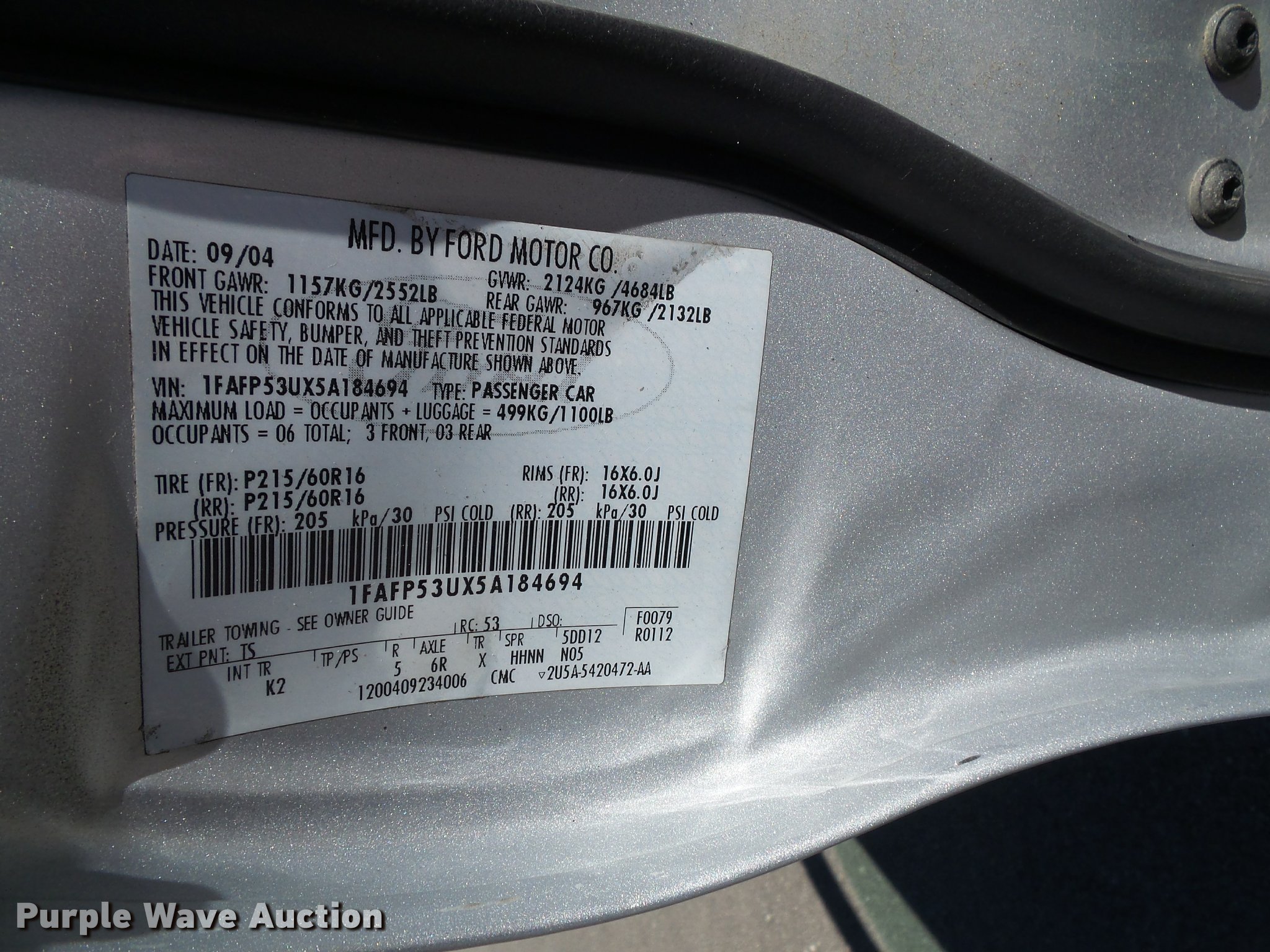 Purple Wave is selling a used Passenger Vehicle in Kansas. This item is a 2005 Ford Taurus SE with the following: 126,815 miles on odometer, 3.0L V6 OHV 12V gas engine, Automatic transmission, AC and heat, Tilt, Cruise, AM/FM/CD, Power windows, locks, mirrors, and seat, Cloth interior, 215/60R16 tires, Rust, Service records available upon request, Unit# YS3