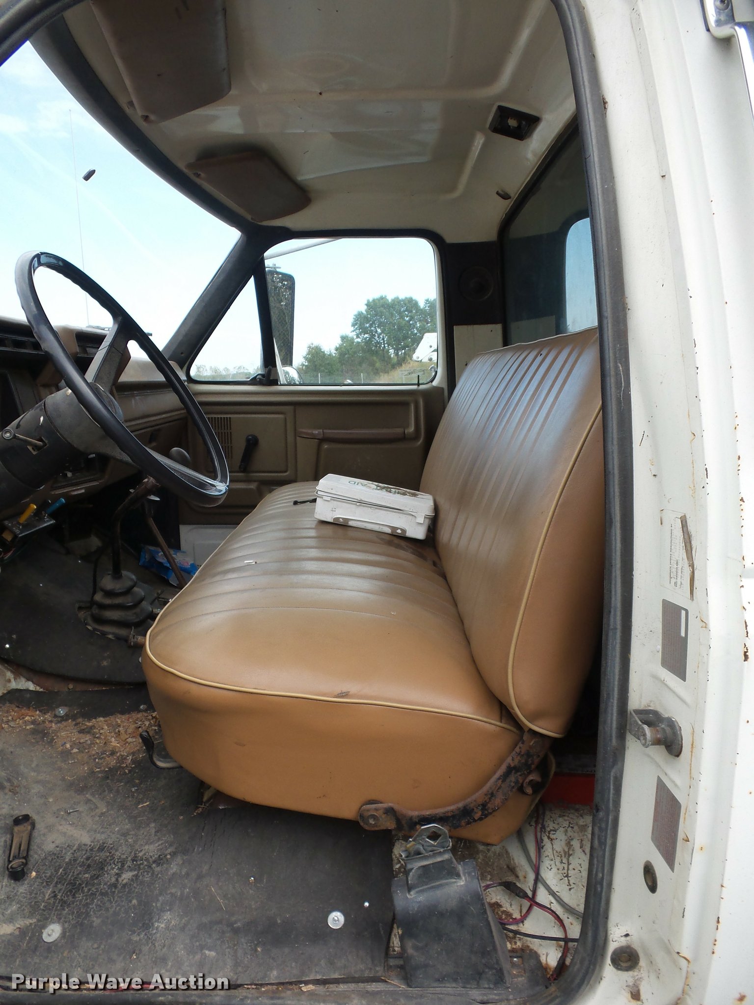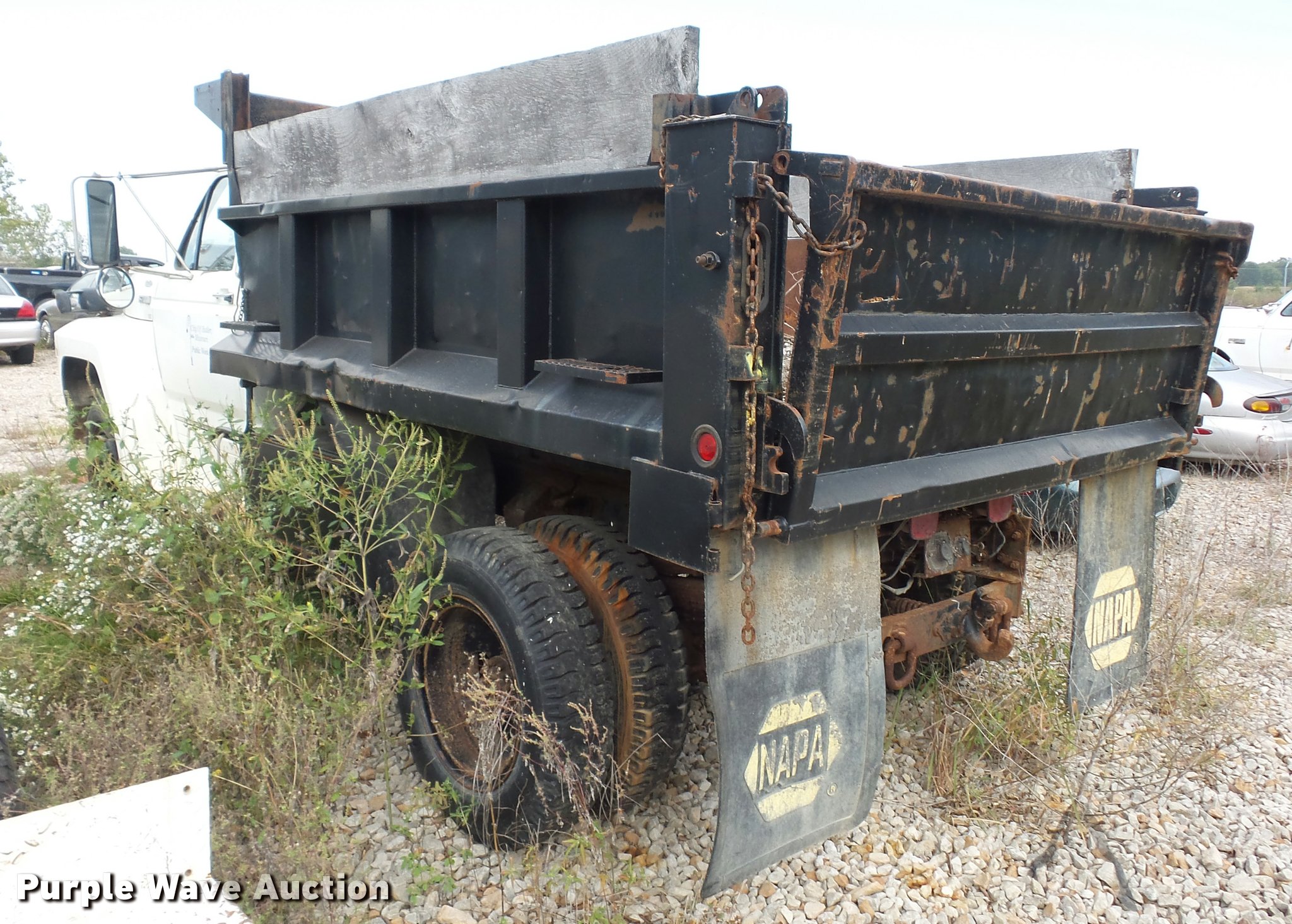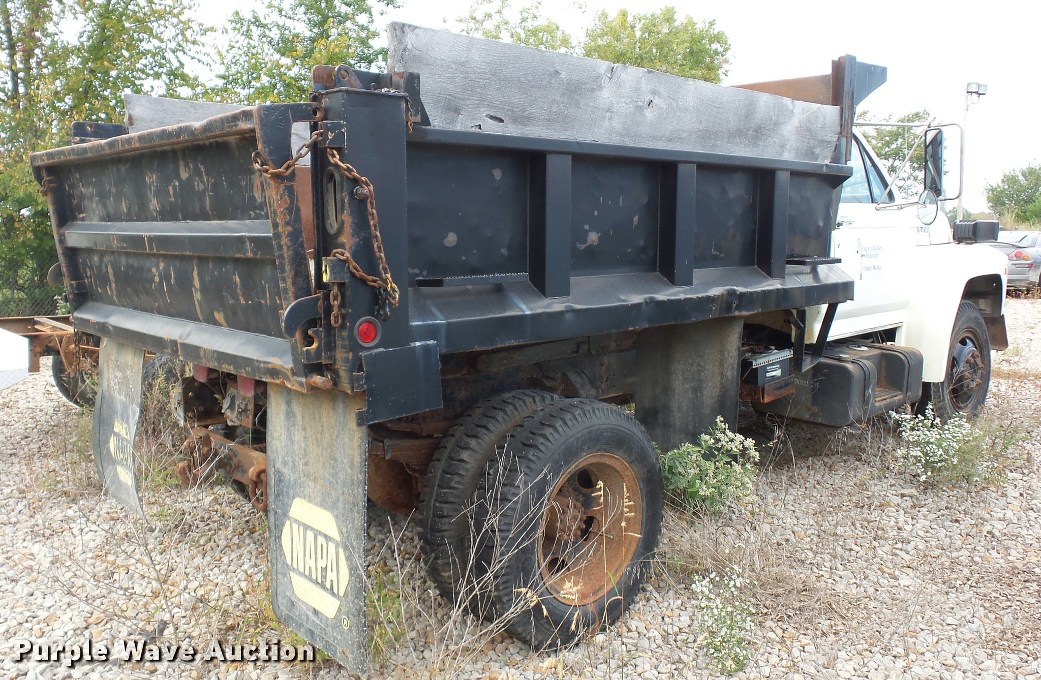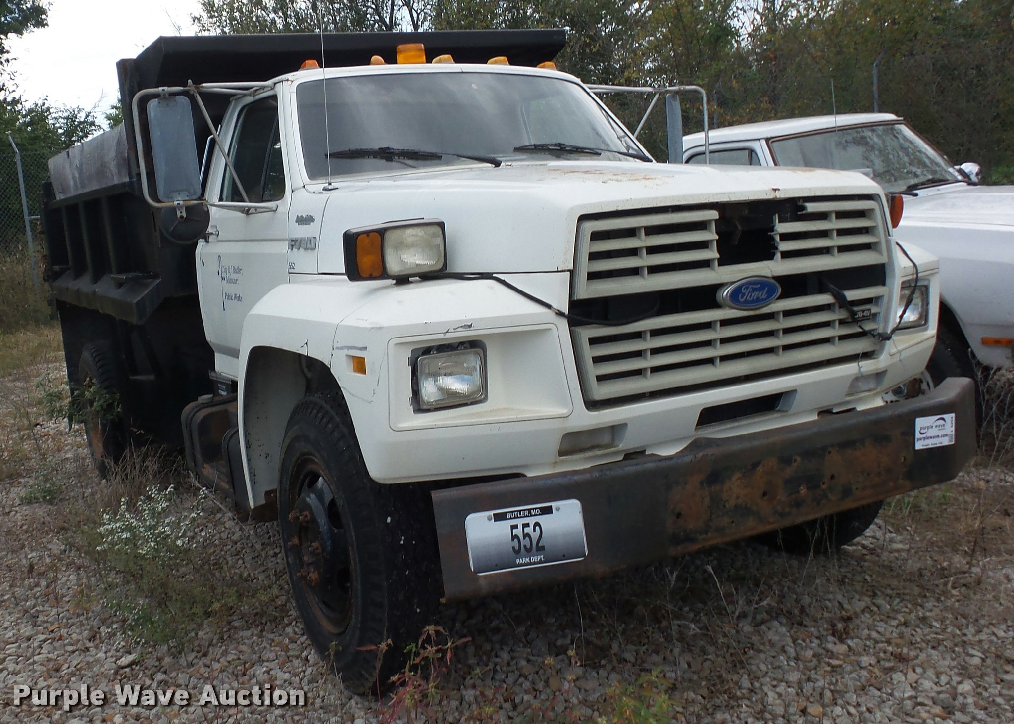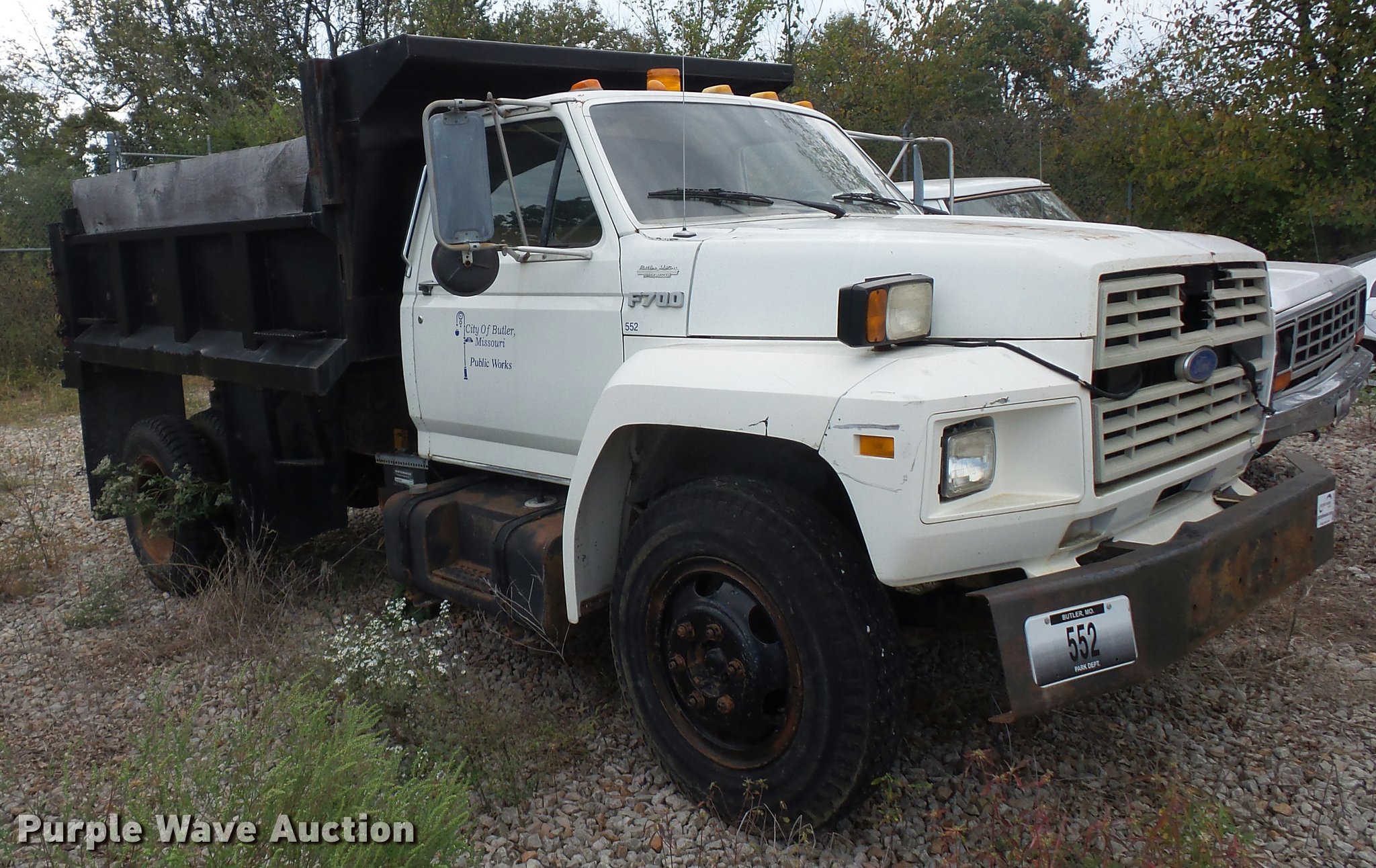 Purple Wave is selling a used Construction Dump Truck in Missouri. This item is a 1987 Ford F700 dump truck with the following: 102,589 miles on odometer, 6.1L V8 gas engine, Five speed manual transmission, Two speed rear end, Heat, Manual windows and locks, Vinyl interior, 10'L x 8'W dump bed, 2' side height, 12" side board height, 8.25-20 tires, GVWR 21,200 lbs, Frame rusted or cracked, Dead battery