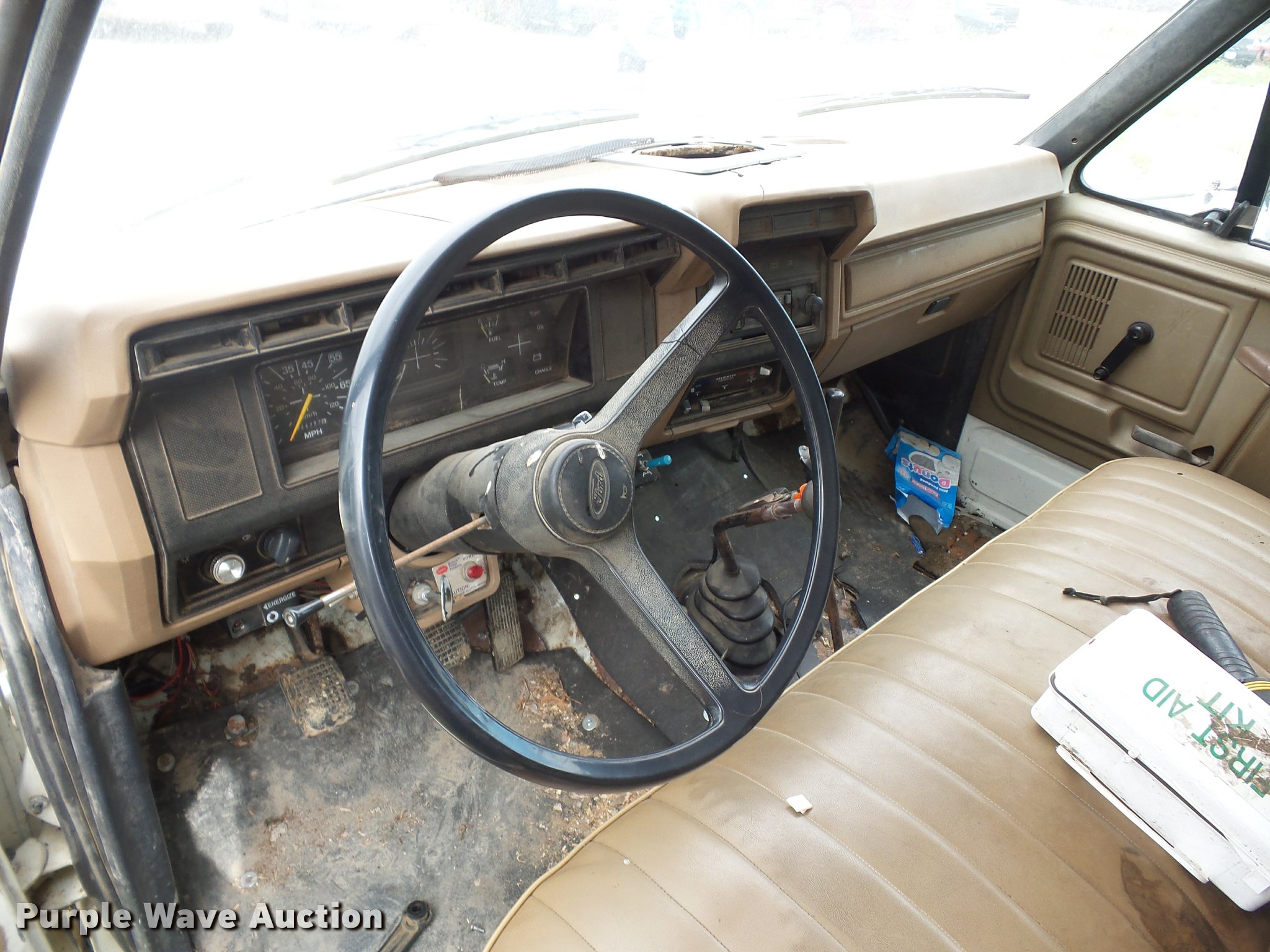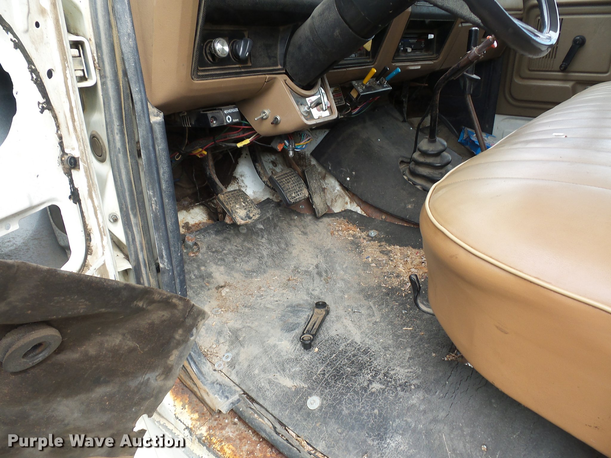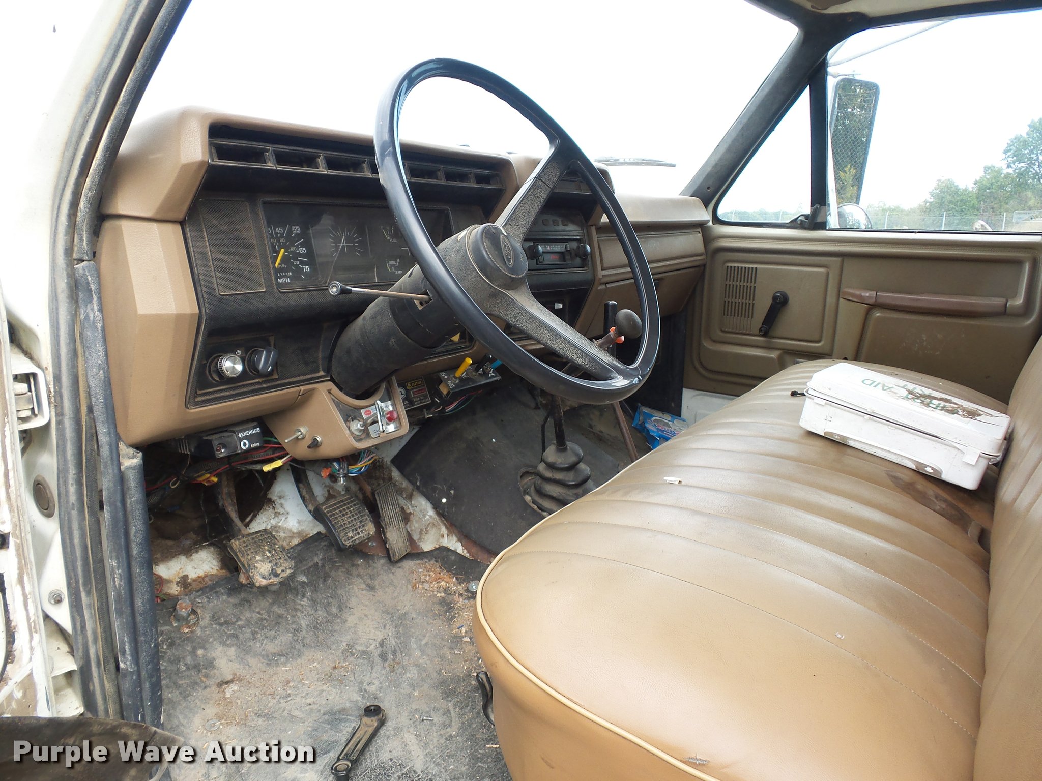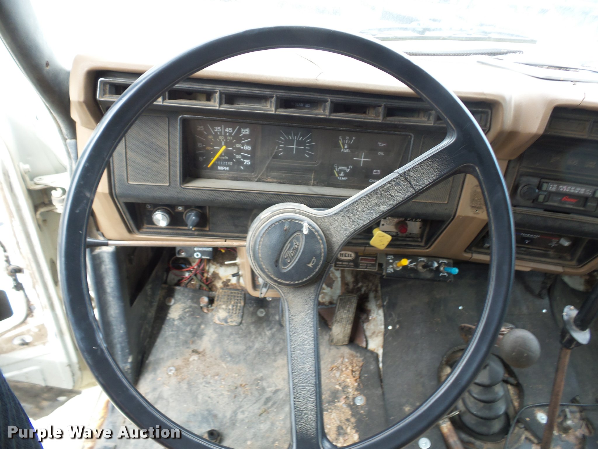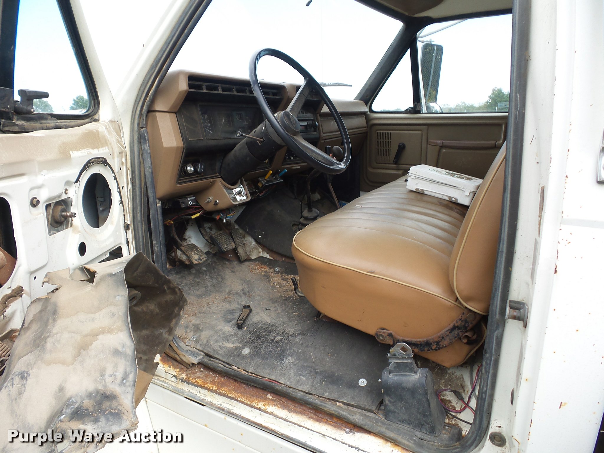 Purple Wave is selling a used Construction Dump Truck in Missouri. This item is a 1987 Ford F700 dump truck with the following: 102,589 miles on odometer, 6.1L V8 gas engine, Five speed manual transmission, Two speed rear end, Heat, Manual windows and locks, Vinyl interior, 10'L x 8'W dump bed, 2' side height, 12" side board height, 8.25-20 tires, GVWR 21,200 lbs, Frame rusted or cracked, Dead battery
