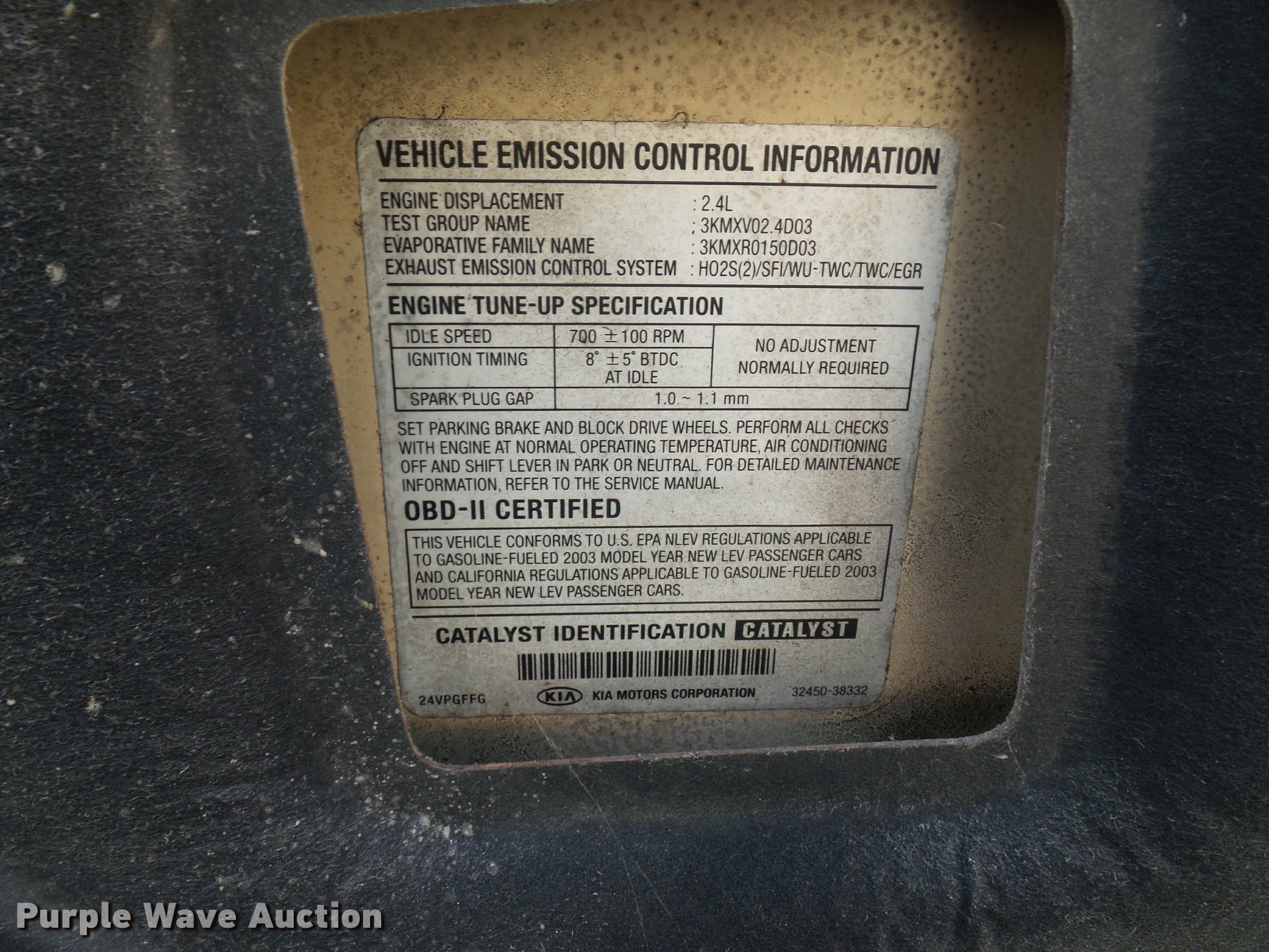 Purple Wave is selling a used Passenger Vehicle in Missouri. This item is a 2003 Kia Optima with the following: Unknown miles on odometer, 2.7L V6 DOHC 24V gas engine, Automatic transmission, AC and heat, Tilt, Cruise, Power windows, locks, and mirrors, Vinyl interior, 205/60R15 tires, Dead battery
