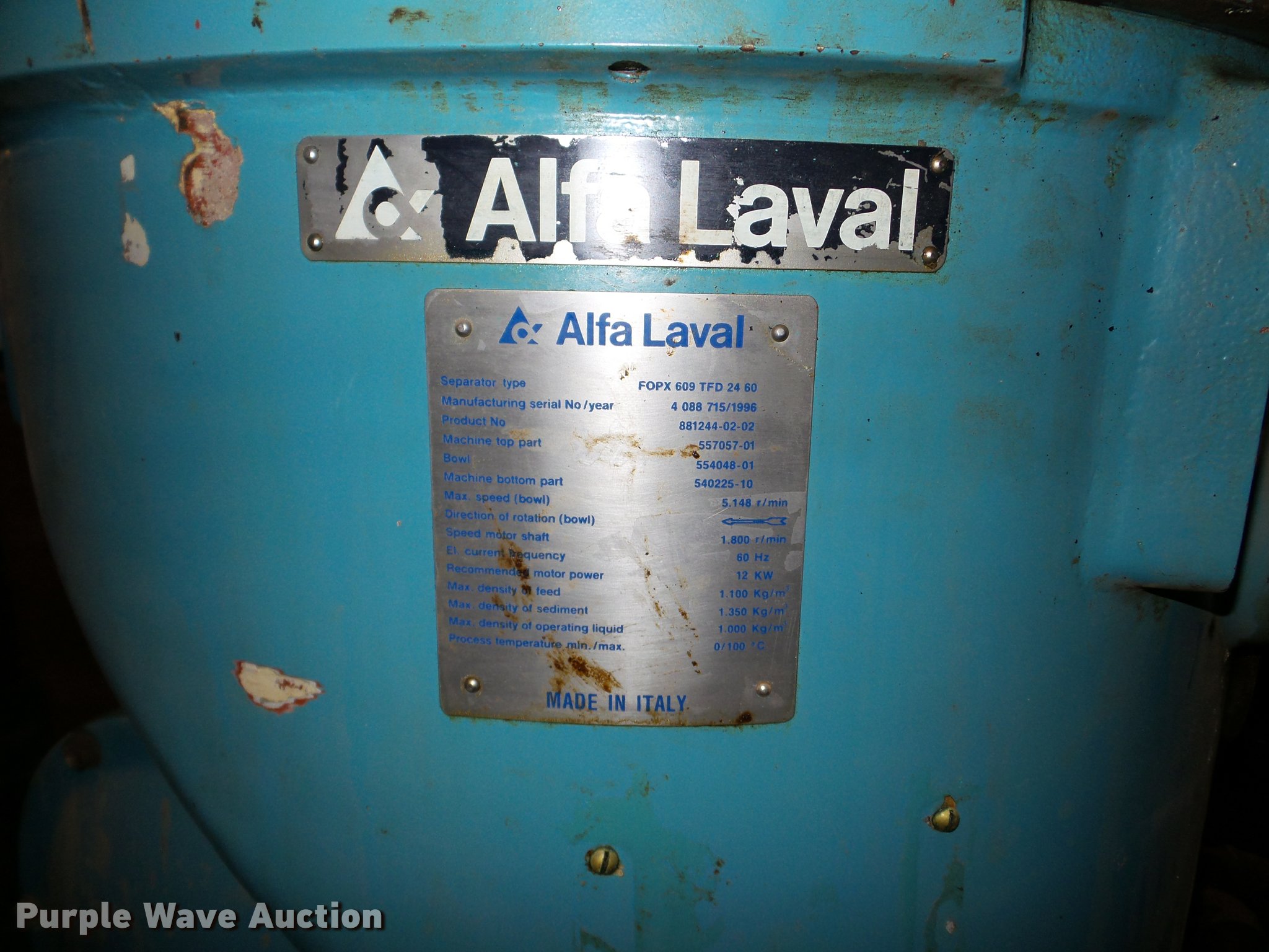 Purple Wave is selling a used Other Industrial or Business in Texas. This item is a Alfa-Laval centrifuge with the following: Model F0PX-609-TFD-24-60, Electric motor, 208-220/460V, 60 Hz, Serial 4088-715/1996