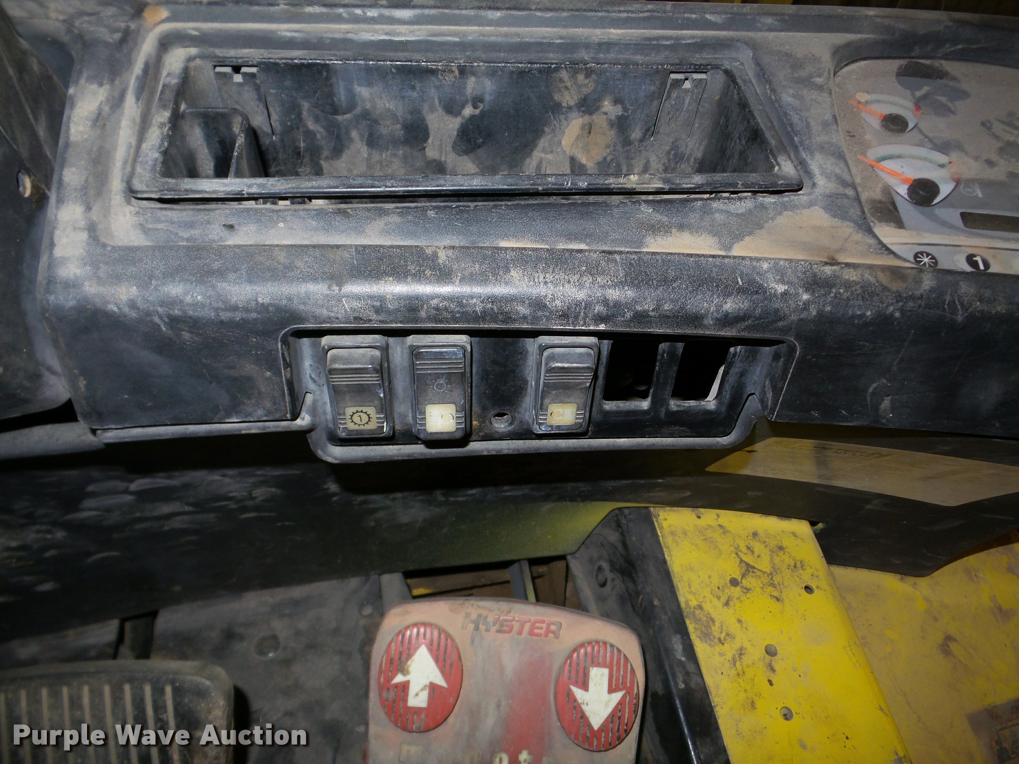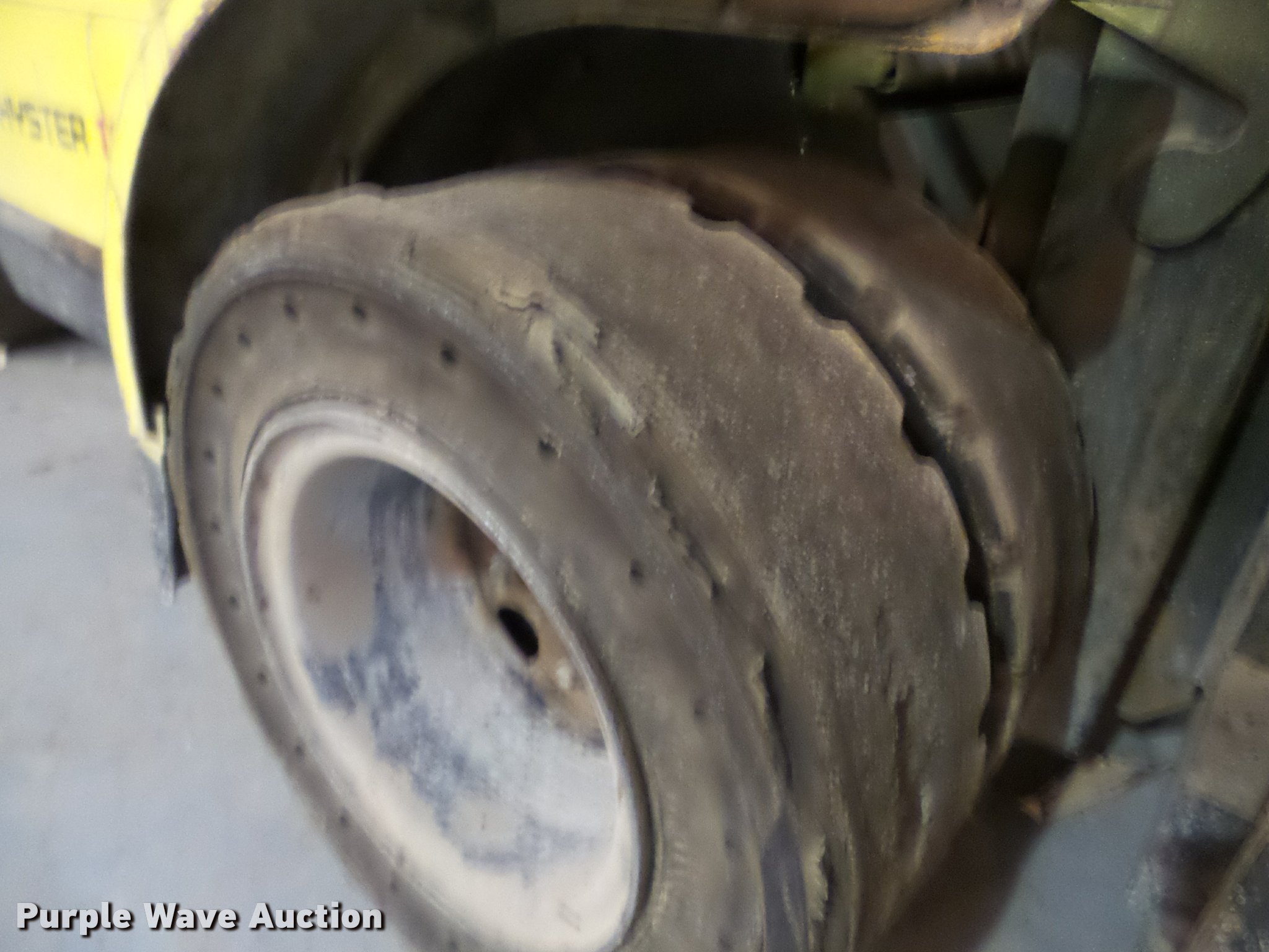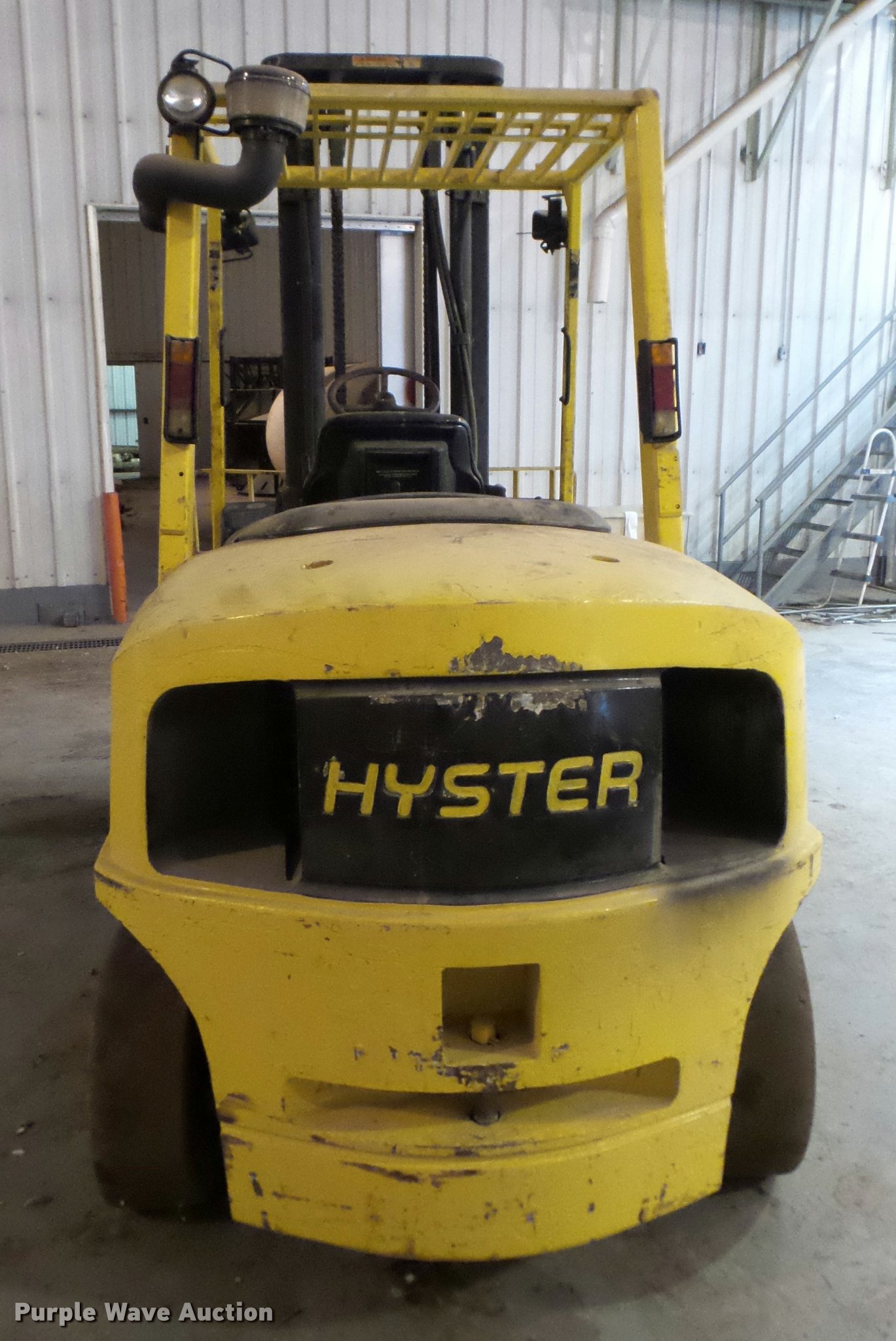 Purple Wave is selling a used Strt. Mast Rough Terr. Forklift in Texas. This item is a Hyster 100 forklift with the following: Four cylinder dual fuel engine, Diesel or propane capable, Hydrostatic transmission, Canopy, Work lights, Two stage mast, Side shift, Mast tilt, 48"L forks, 8.25-15 solid front tires, 7-12 rear tires