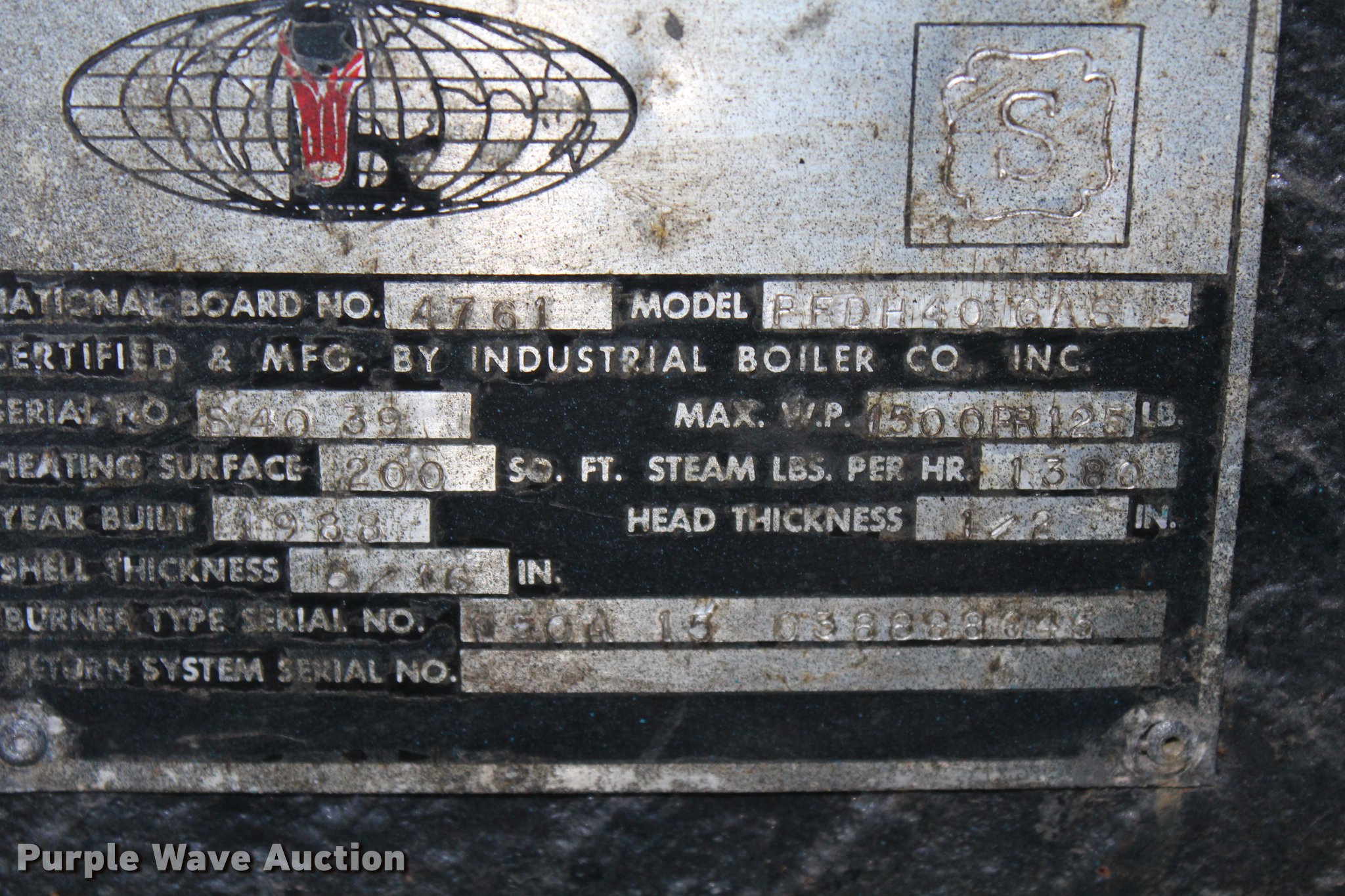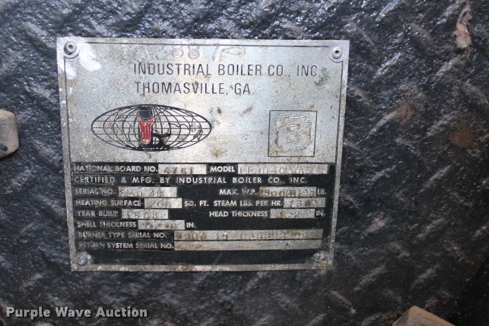 Purple Wave is selling a used Other Industrial or Business in Texas. This item is a Industrial Boiler Company Inc. boiler with container with the following: Model PFDH400A5, 2011 Cyclohetic control panel, Model JB2C-10-RM7897C-LL-20-UL, Serial U99201A-01, Chem-Aqua treatment water tank/meter, Serial P50A-15-038888645