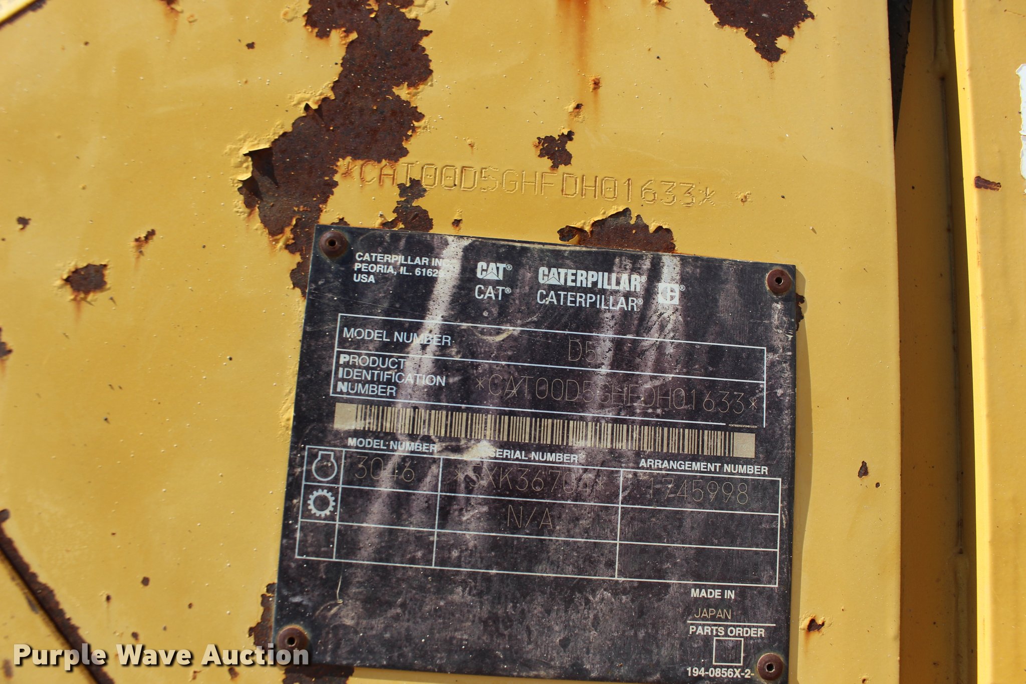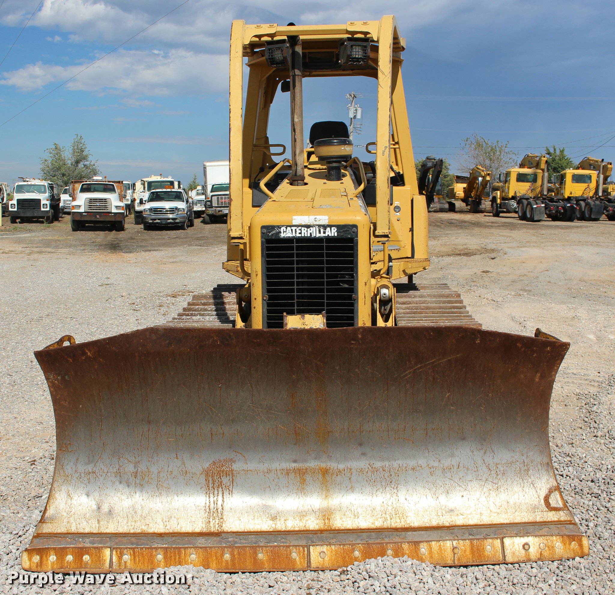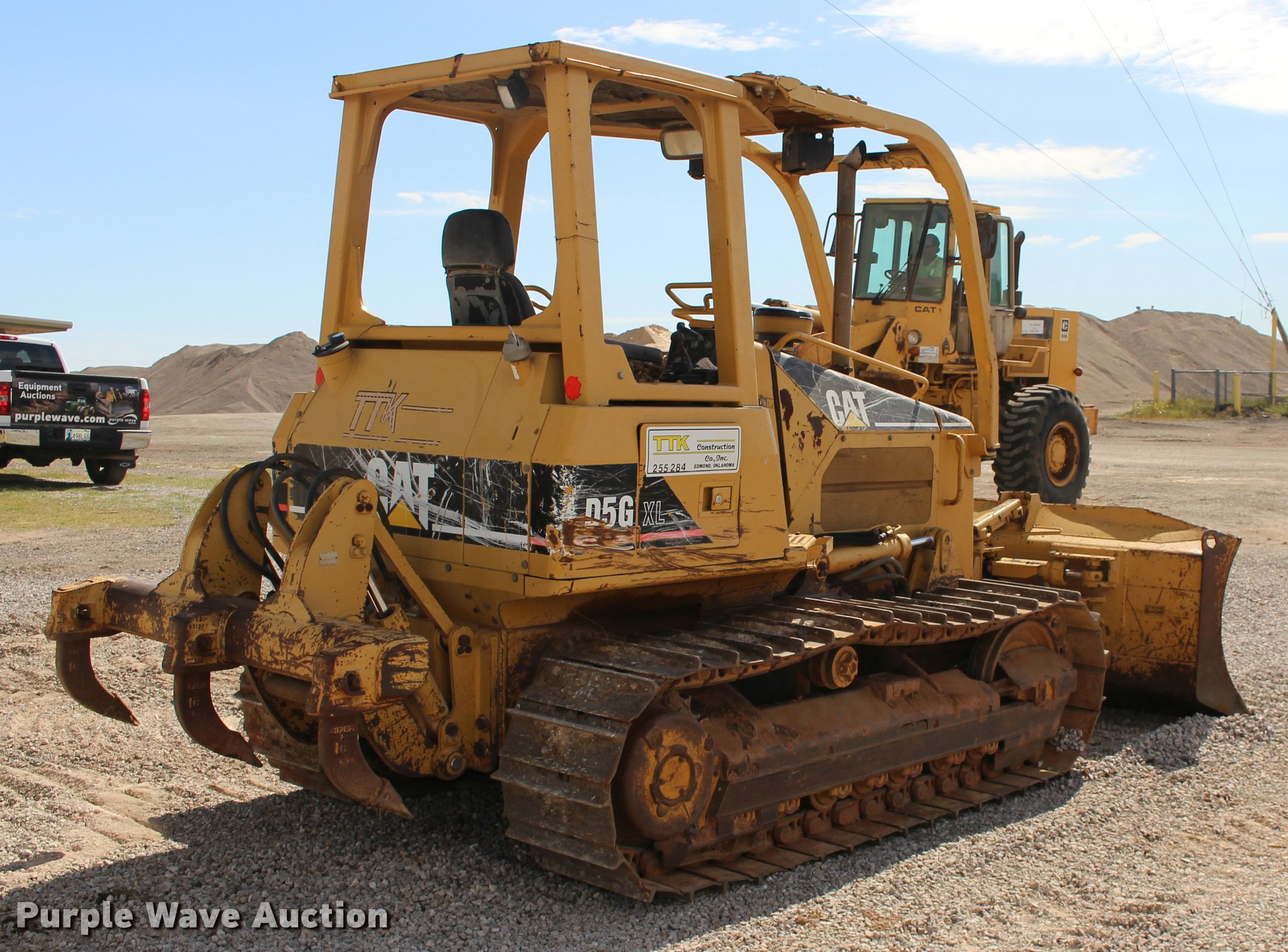 Purple Wave is selling a used Crawler Dozer in Oklahoma. This item is a 2003 Caterpillar D5G XL dozer with the following: 1,516 hours on meter, Caterpillar 3046 diesel engine, Hydrostatic transmission, OROPS, Joystick control steering, Sweeps, Front and rear work lights, 103" six-way dozer blade, Caterpillar No. 3 ripper, (3) shanks, Serial BHX00574, Seven bottom rollers, 20"W single grouser track pads, Serial CAT00D5GHFDH01633, Unit# 255.284
