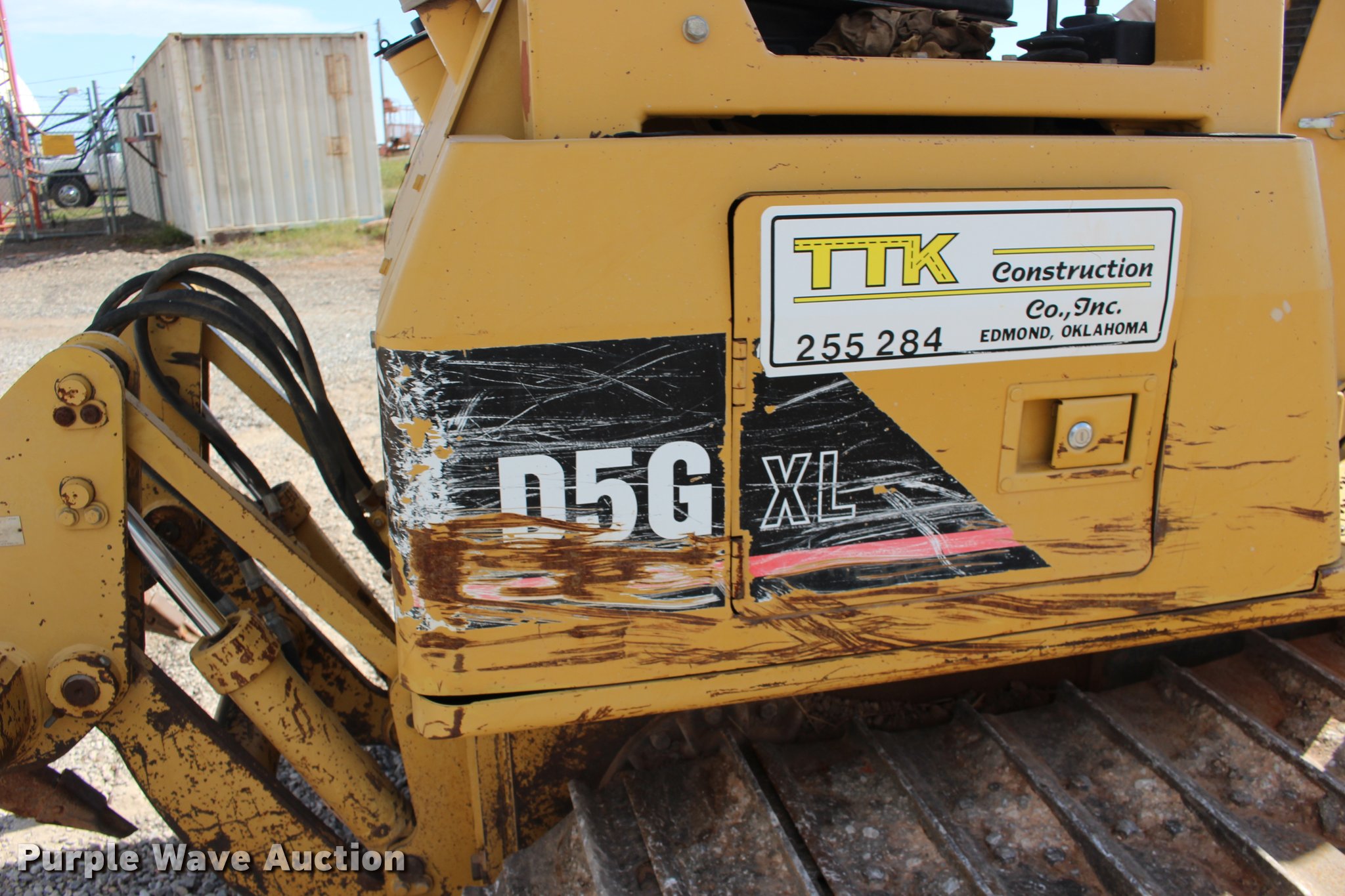 2003 Caterpillar D5G XL dozer. 1,516 hours on meter, Caterpillar 3046 diesel engine, Hydrostatic transmission, OROPS, Joystick control steering, Sweeps, Front and rear work lights, 103" six-way dozer blade, Caterpillar No. 3 ripper (3) shanks, Serial BHX00574, Seven bottom rollers, 20"W single grouser track pads, Serial CAT00D5GHFDH01633, Unit# 255.284. Duit Holdings Inc.. 7183 E. Waterloo Industrial Road. Edmond, OK 73034