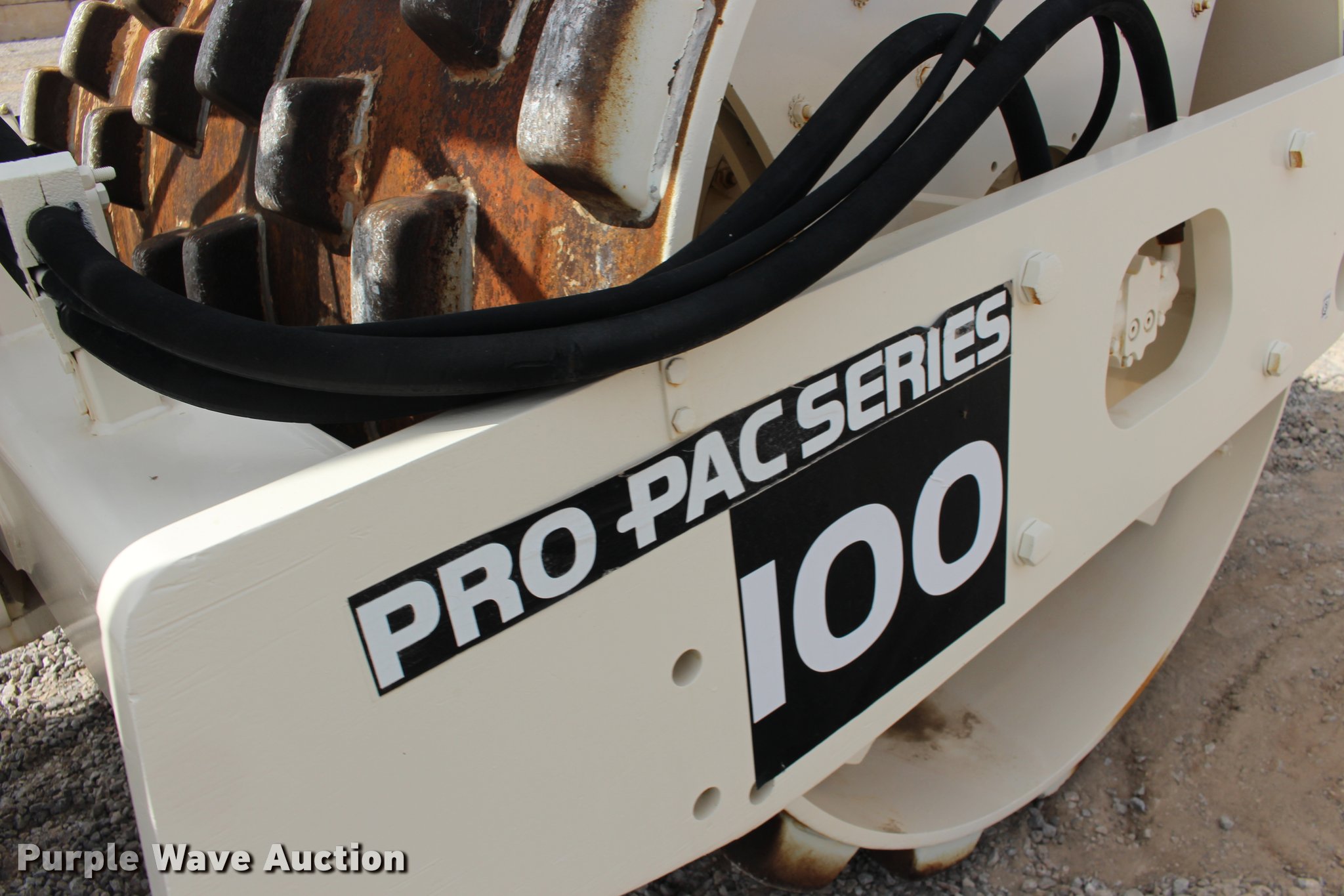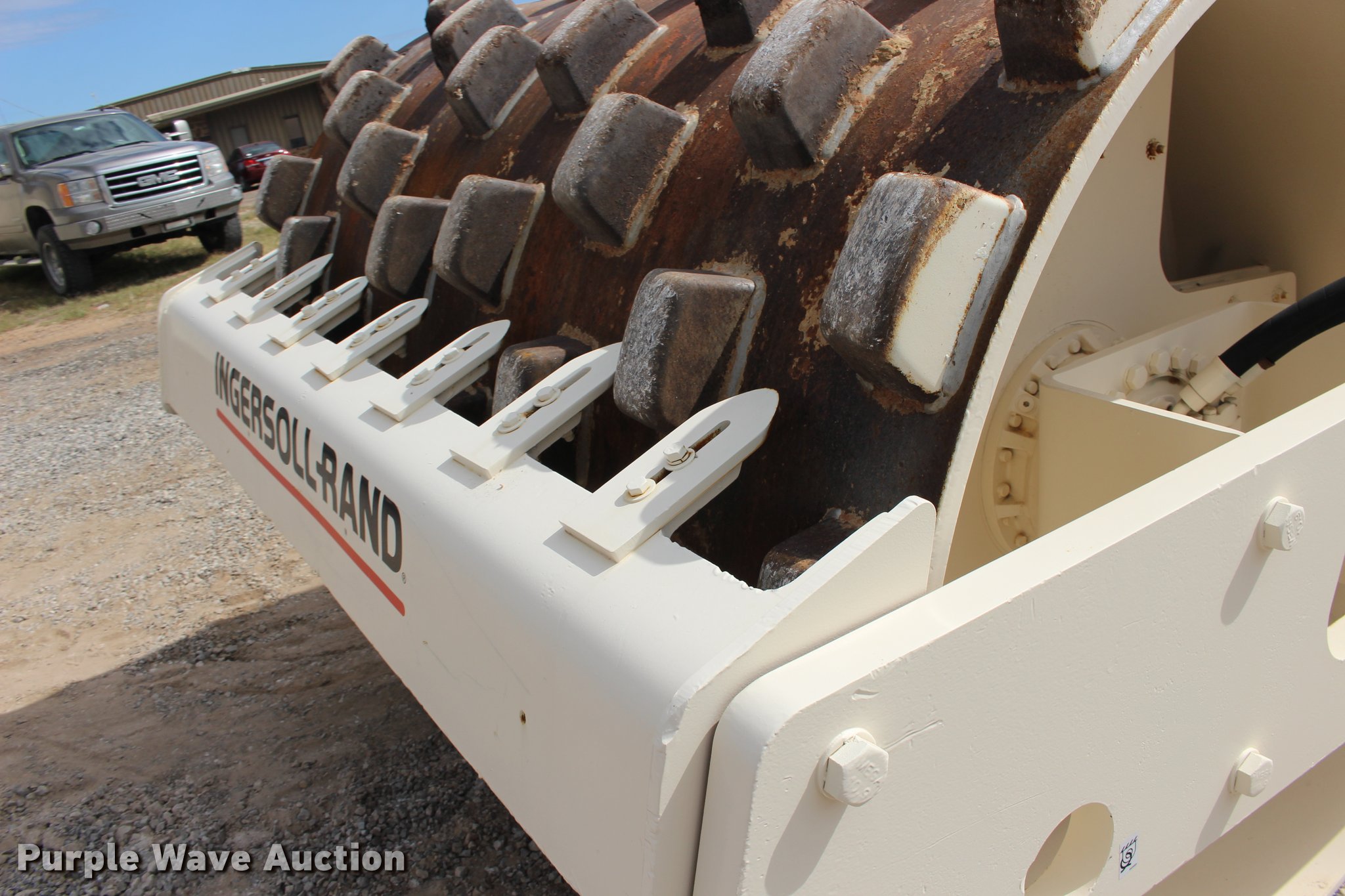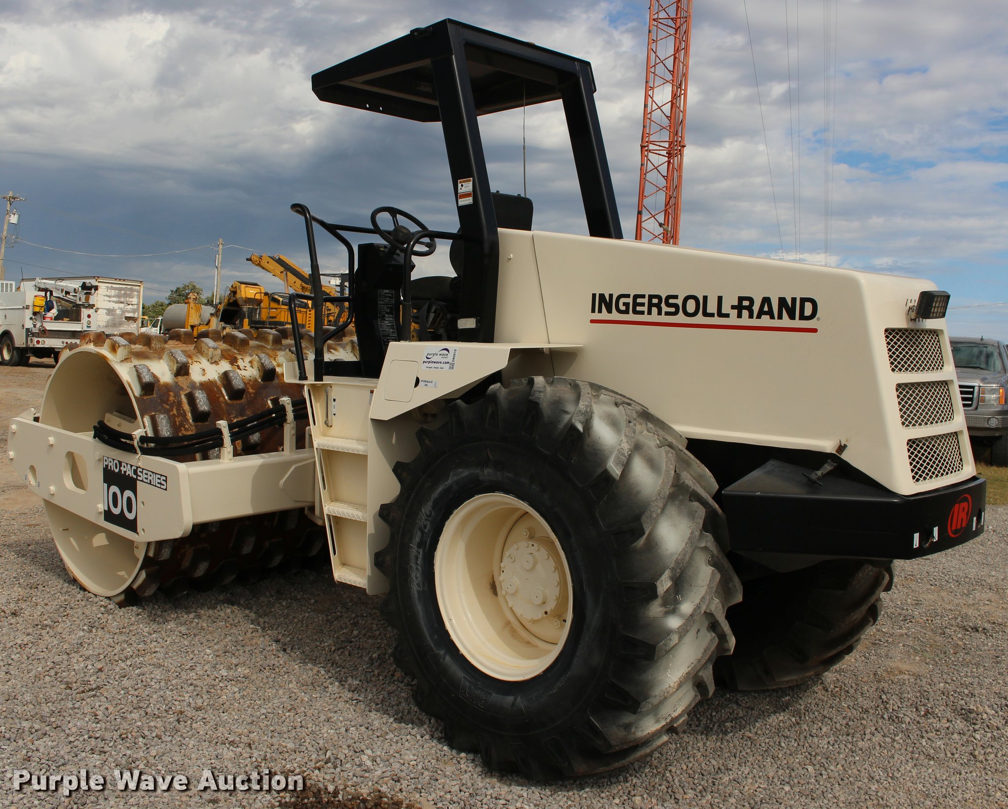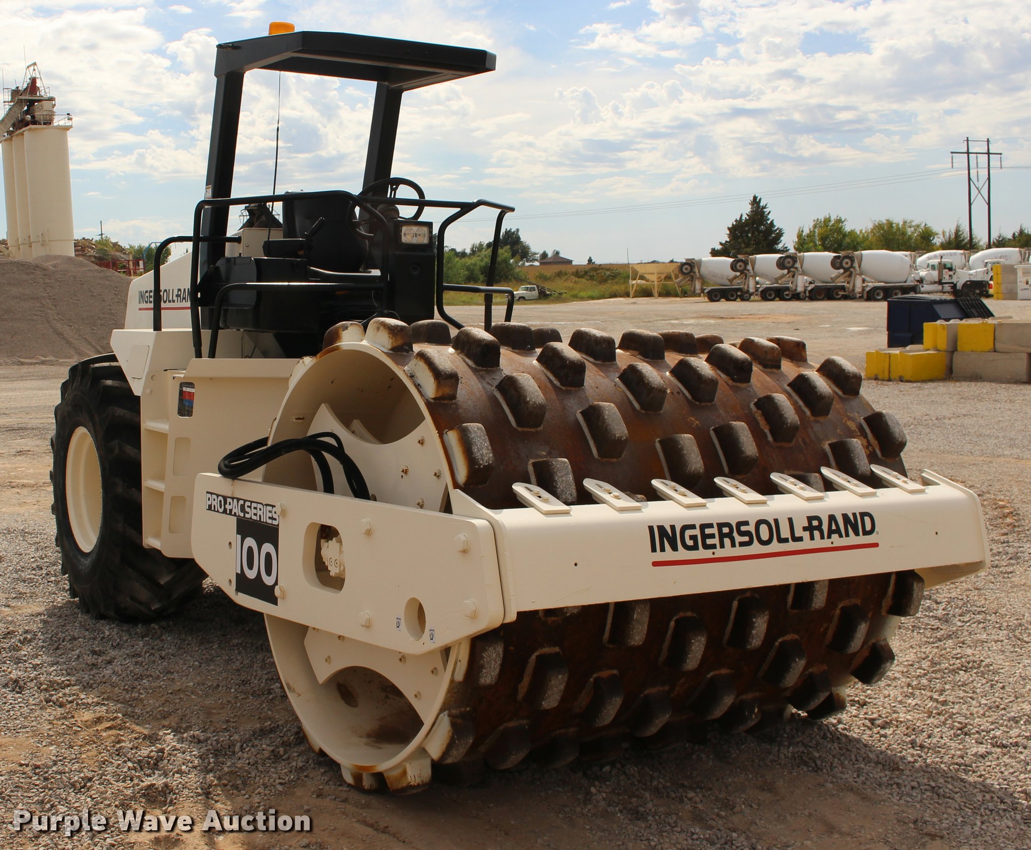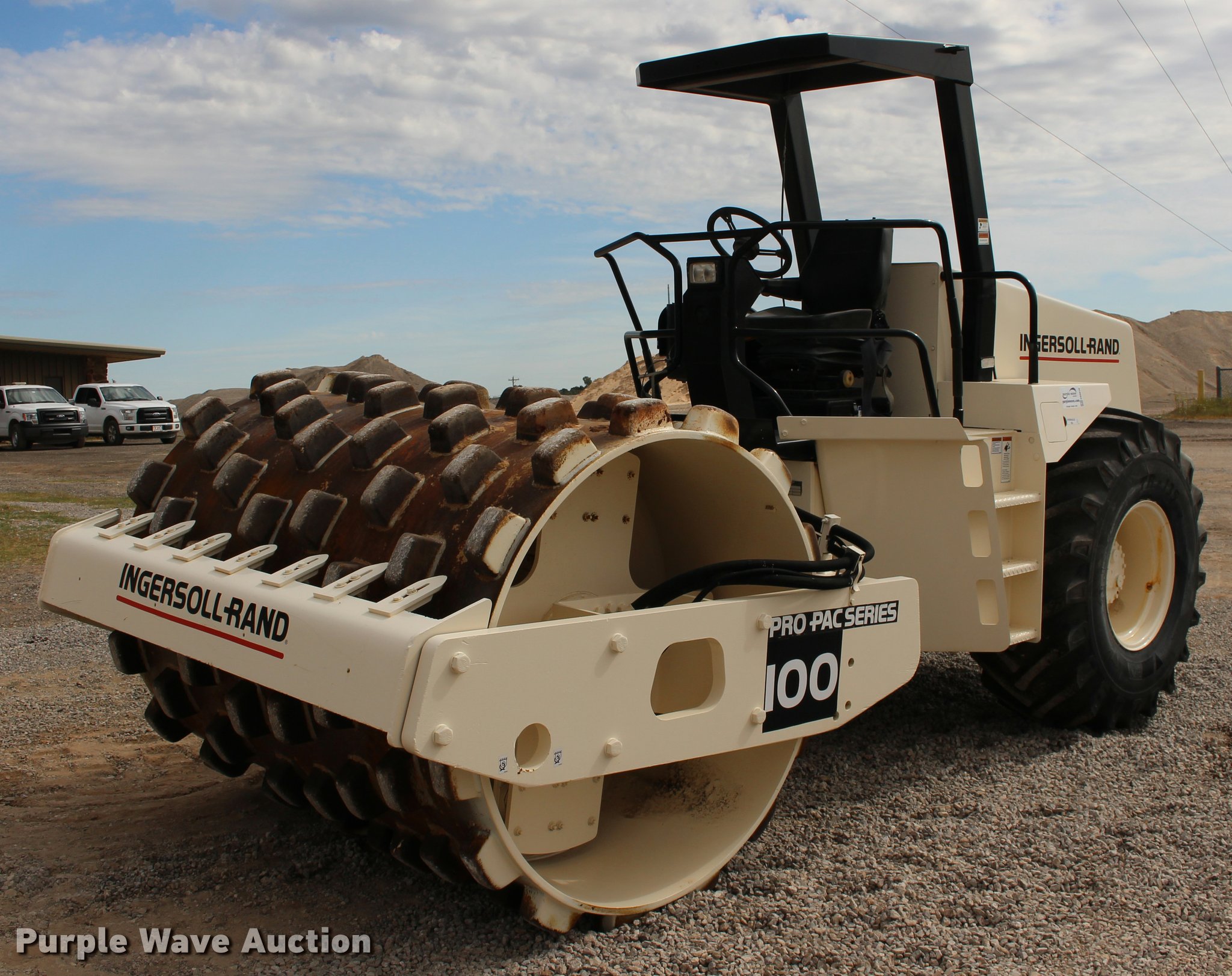 Purple Wave is selling a used Single Drum Roller Compactor in Oklahoma. This item is a 2001 Ingersoll Rand SD-100F single drum vibratory roller with the following: 2,720 hours on meter, Cummins 3.9L four cylinder turbo diesel engine, 125 HP, Two speed hydrostatic transmission, OROPS, Canopy, Suspension seat, Vandal cover, 84"W x 59" diameter padfoot drum, Front drum scraper, Single two speed vibratory system, BKT 23.1-26 tires, Serial 150231, Unit# 191.292