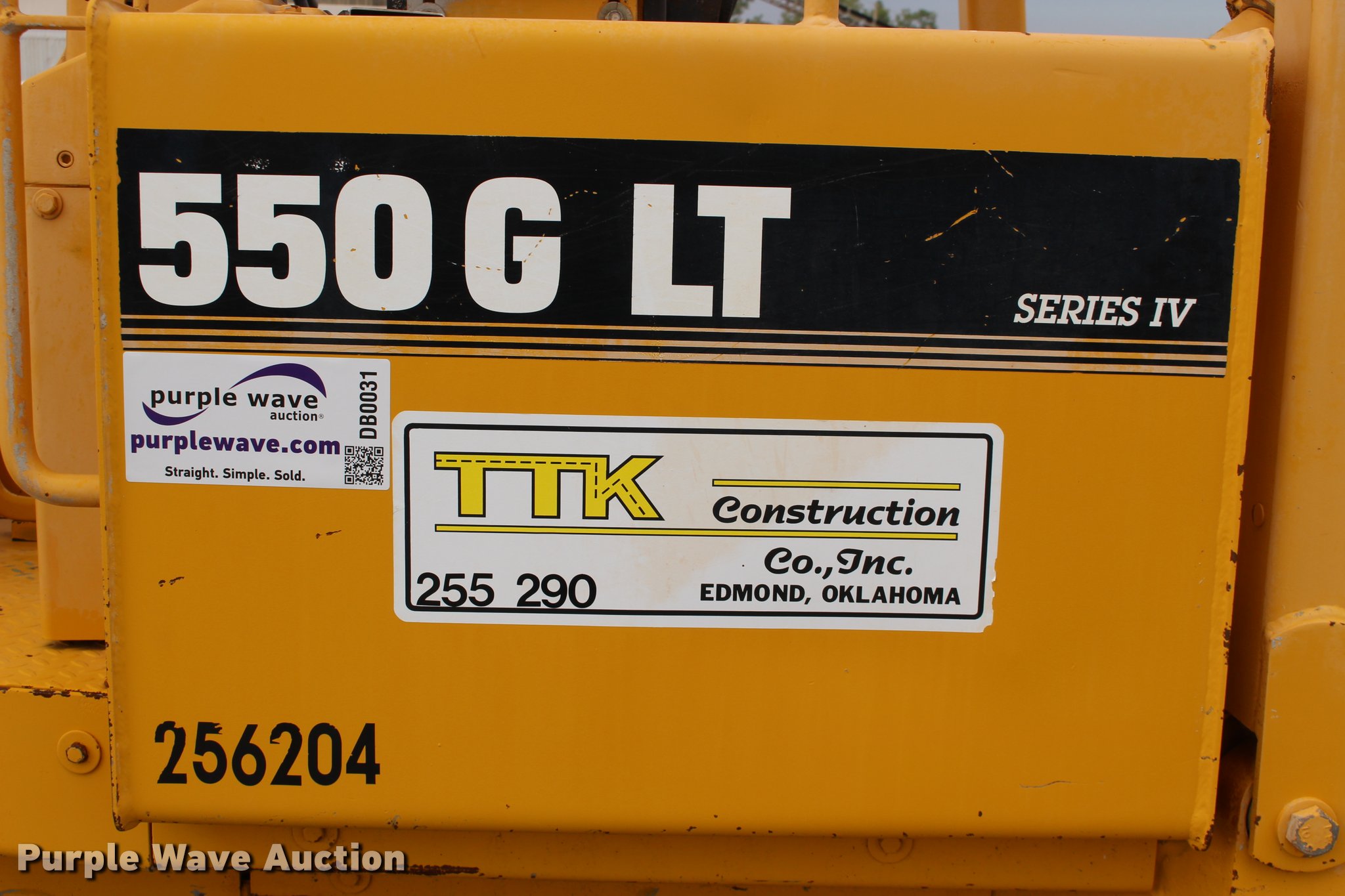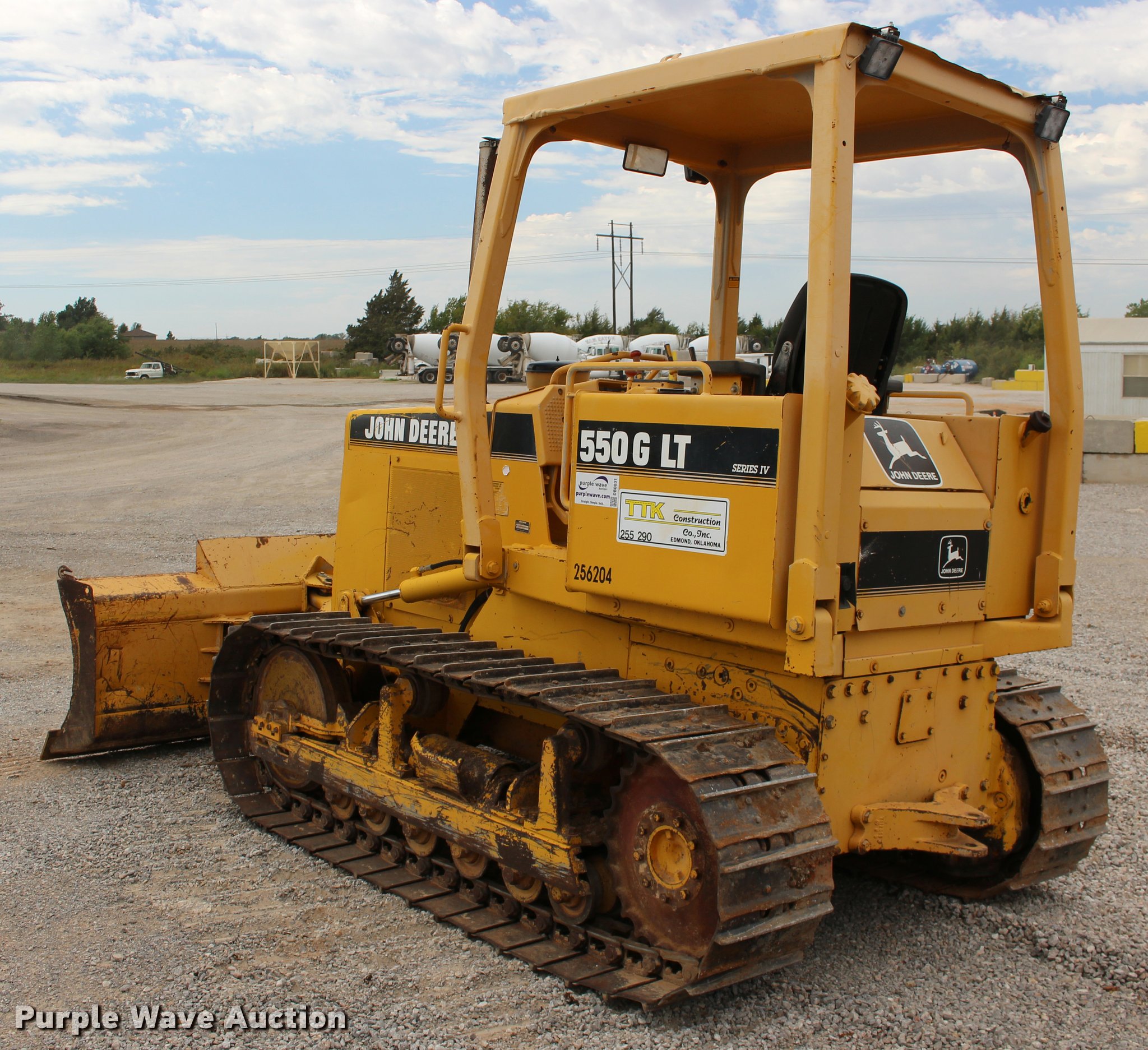 Purple Wave is selling a used Crawler Dozer in Oklahoma. This item is a 1990 John Deere 550G LT Series IV dozer with the following: 4,400 hours on meter, John Deere 4045T four cylinder turbo diesel engine, 80 HP, Powershift transmission, 4F-4R gears, Canopy, Joystick controls, Suspension seat, Front and rear work lights, Clutch brake steering, 105"W six-way straight dozer blade, Rear draw bar, Six bottom rollers, 18"W single grouser track pads, Serial T0550GH769409, Unit# 256.204