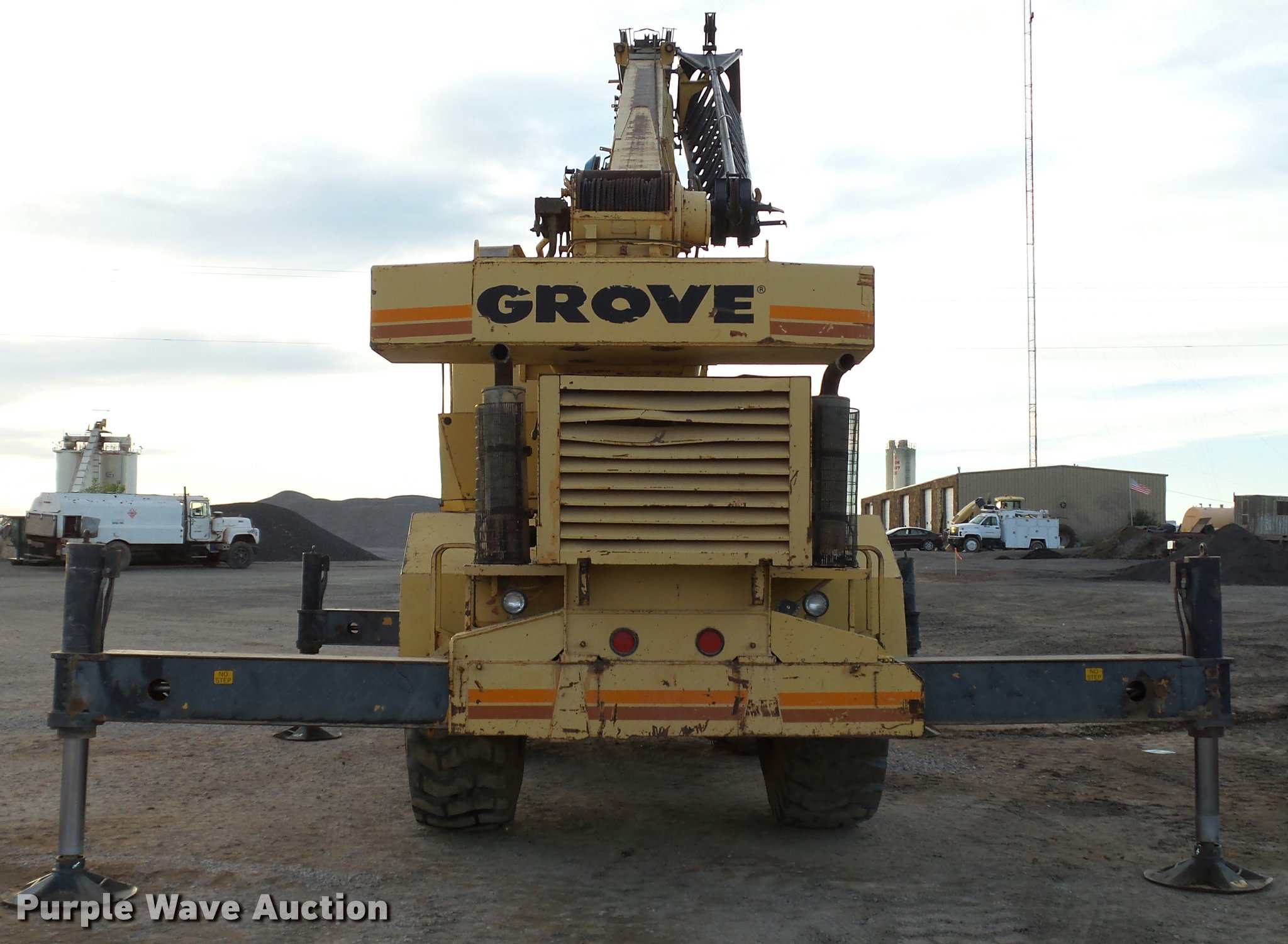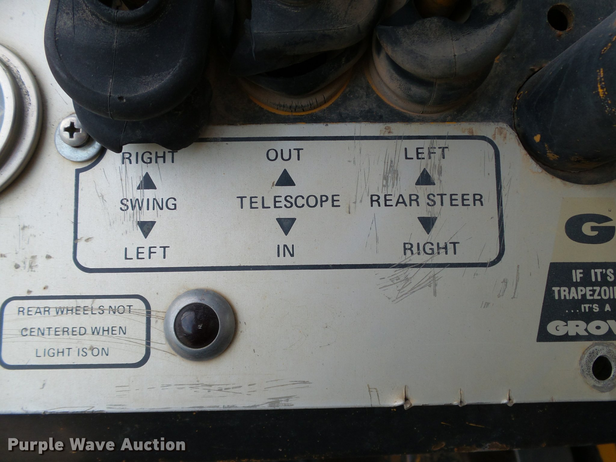 Purple Wave is selling a used Rough or All Terrain Crane in Oklahoma. This item is a Grove RT625 crane with the following: 2,471 hours on meter, Caterpillar 3208 eight cylinder diesel engine, 135 HP, Serial 3Z14370, Automatic transmission, 3F-3R gears, Tandem axle, In-cab boom controls, Telescopic forklift, 85' boom length, 110' jib, 50,000 lbs max lift capacity, Winch, (4) crane block sheaves, (4) stabilizers, Stomil 23.5-25 tires, Re-manufactured engine, Serial 43485, Unit# 140.103