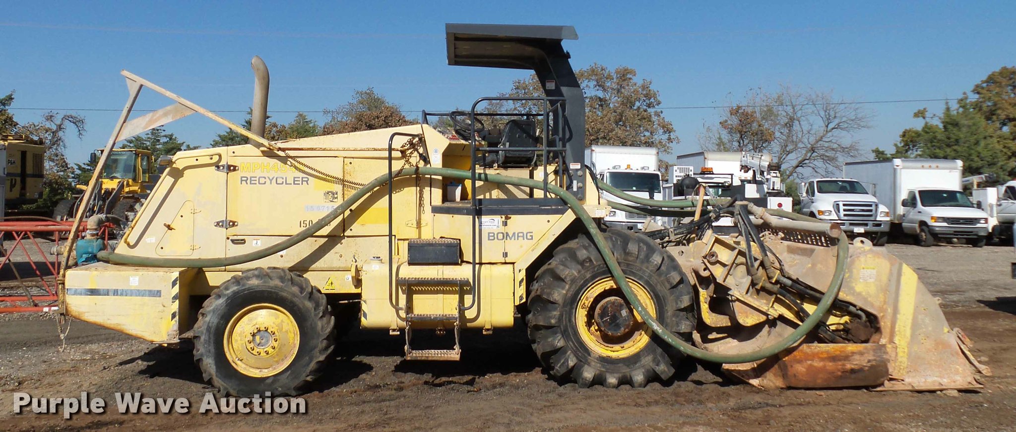 Purple Wave is selling a used Reclaimer or Stabilizer in Oklahoma. This item is a 2005 Bomag MPH454R reclaimer with the following: 3,818 hours on meter, Cummins N14 14.0L six cylinder turbo diesel engine, 475 HP, Two speed hydrostatic transmission, ROPS canopy, 8'W cutter, Water applicator, 3" plumbing, Flomax 15 front mounted pump, 14.9-24 front tires, 26.5-25 rear tires, Serial 901A22301538, Unit# 150.715