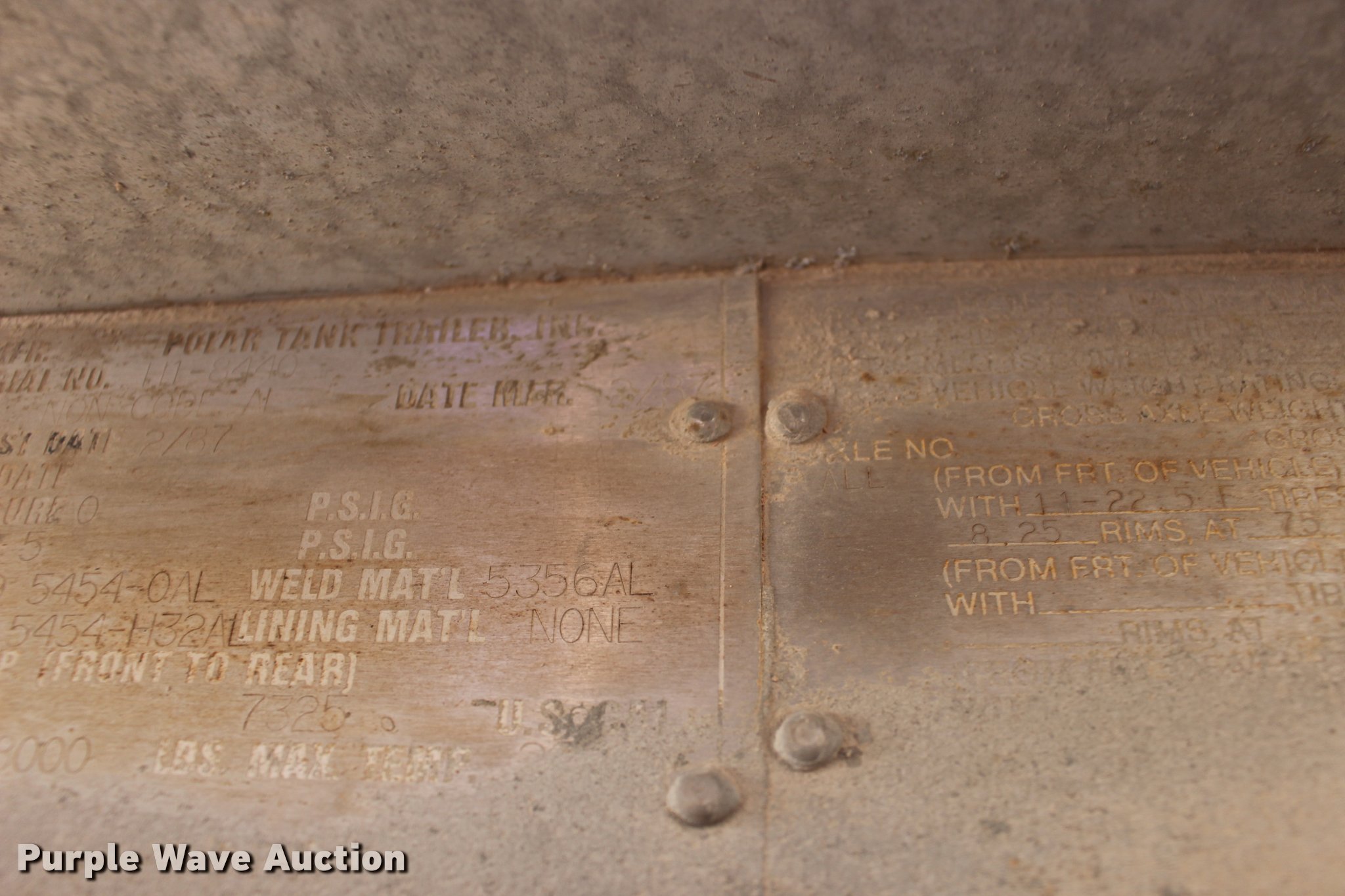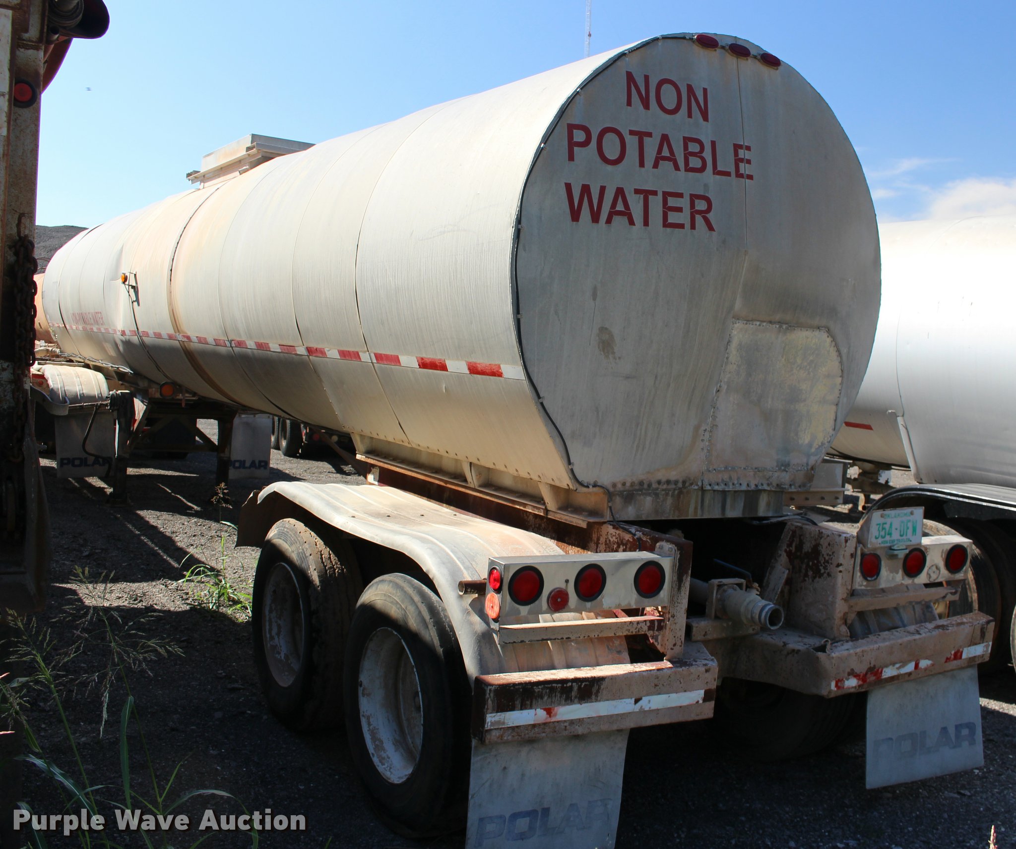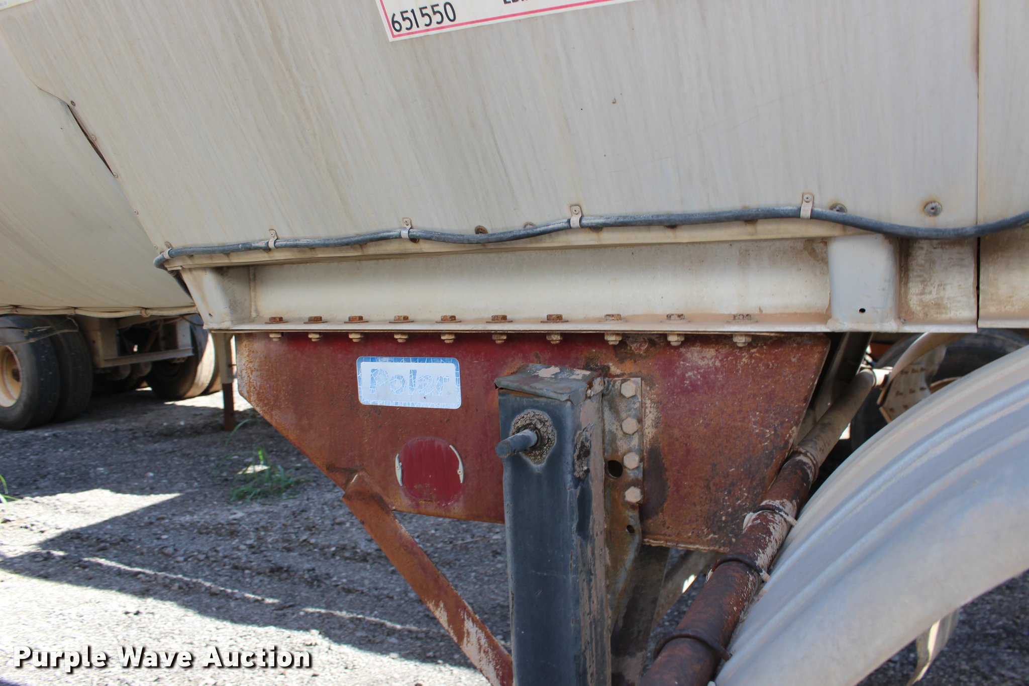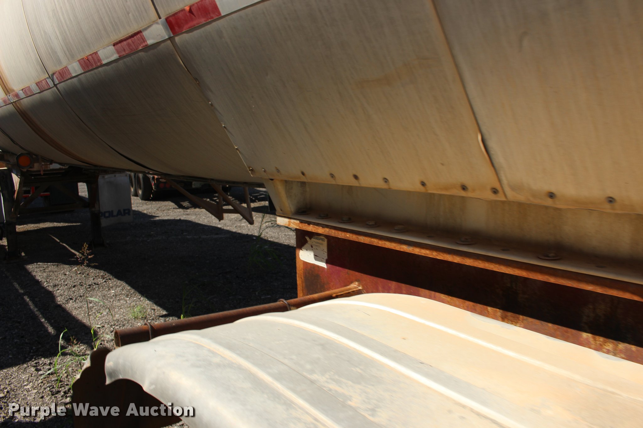 Purple Wave is selling a used Tank Trailer in Oklahoma. This item is a 1987 Polar tank trailer with the following: 42'L x 96"W, 7,300 gallon capacity, Aluminum construction, Dual leg landing gear, Fifth wheel plate, Tandem axle, Spring suspension, Air brakes, Steel wheels, 295/75R22.5 tires, Unit# 651-550