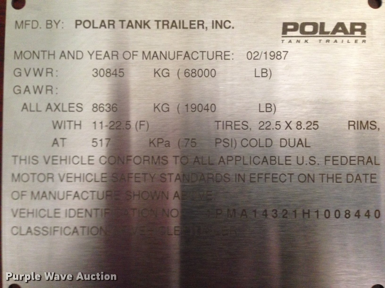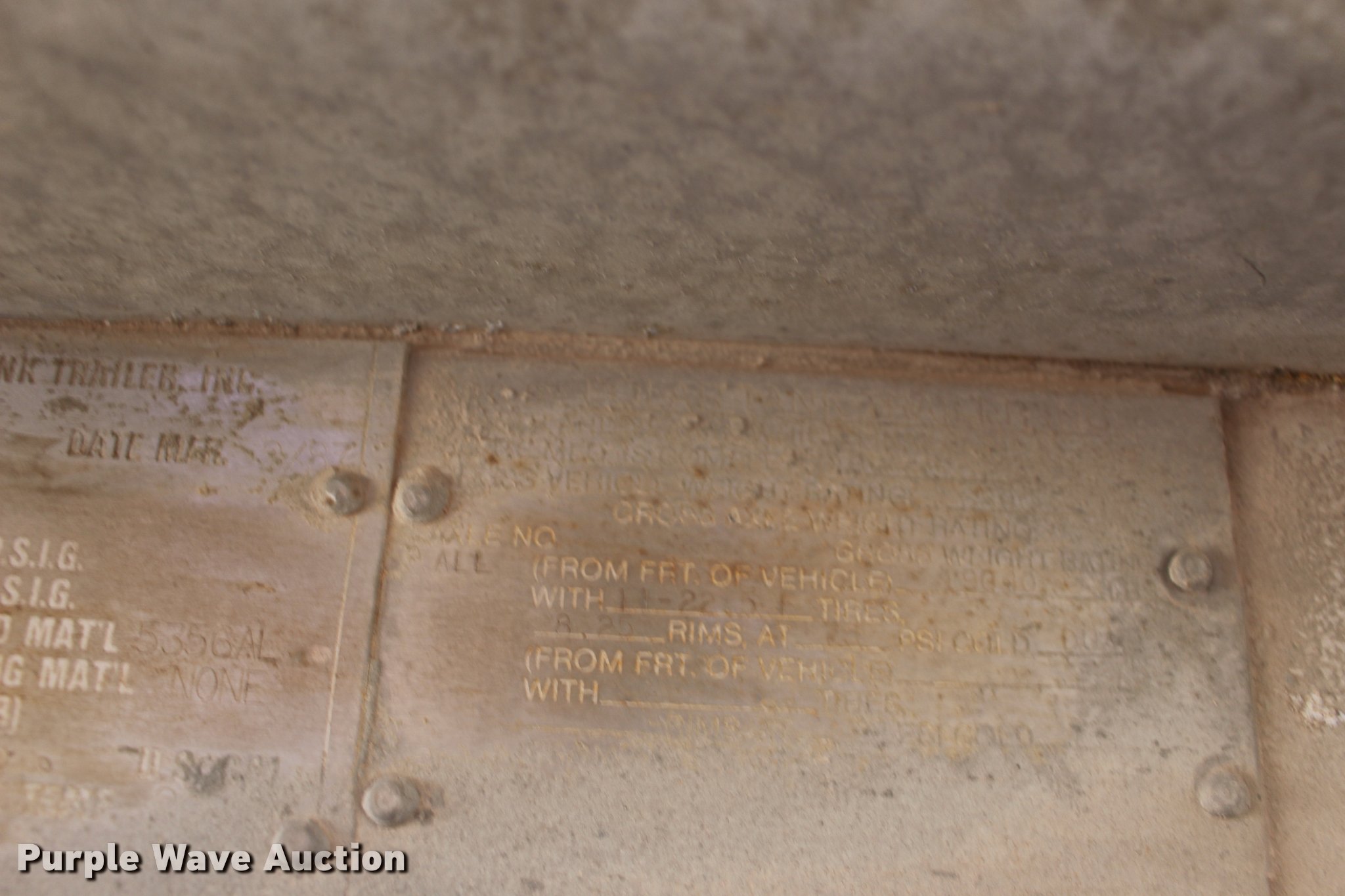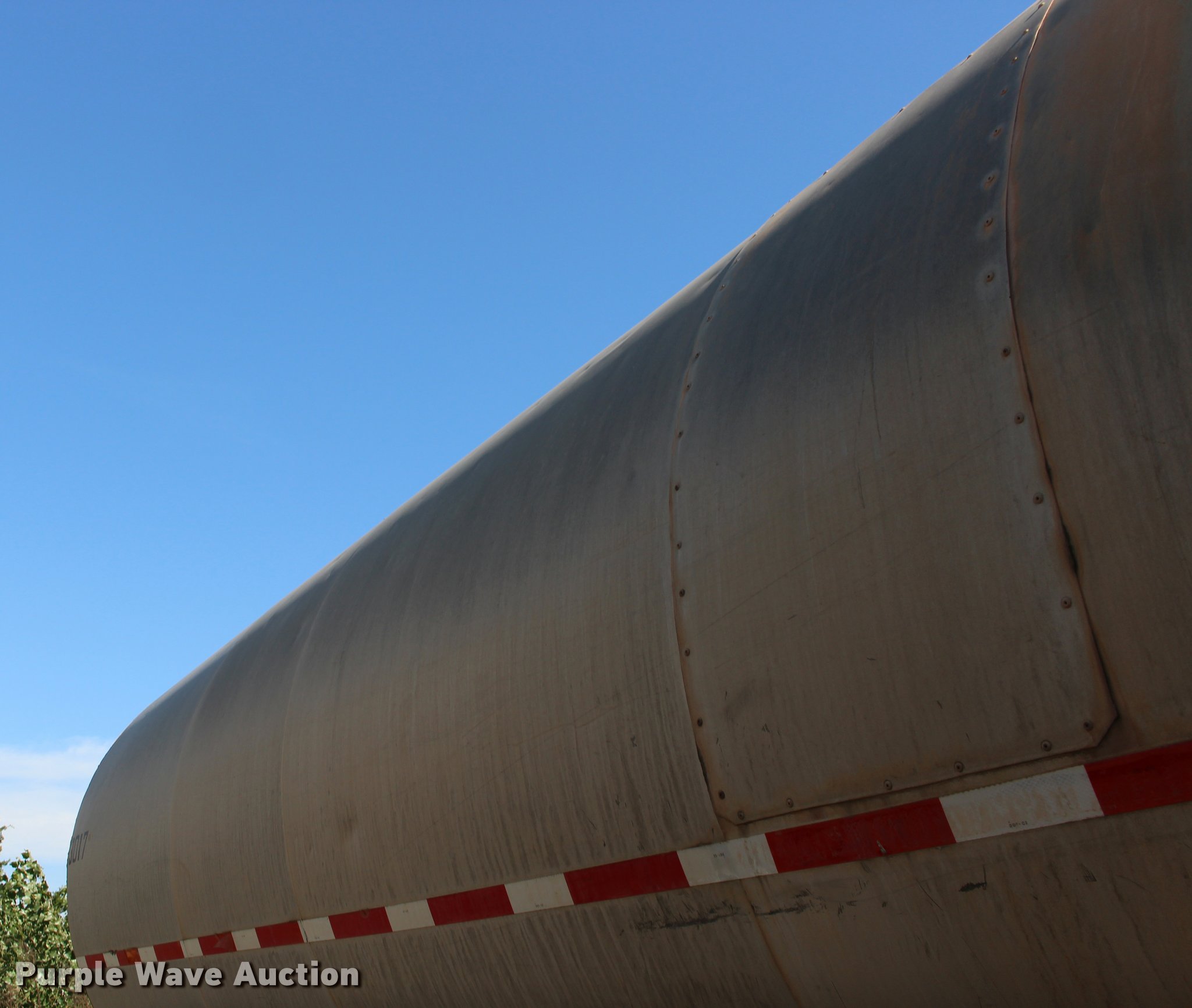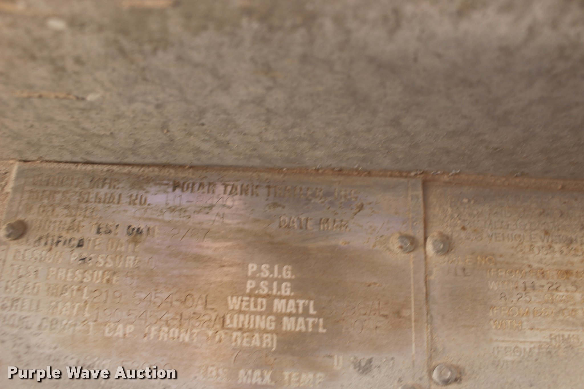 Purple Wave is selling a used Tank Trailer in Oklahoma. This item is a 1987 Polar tank trailer with the following: 42'L x 96"W, 7,300 gallon capacity, Aluminum construction, Dual leg landing gear, Fifth wheel plate, Tandem axle, Spring suspension, Air brakes, Steel wheels, 295/75R22.5 tires, Unit# 651-550